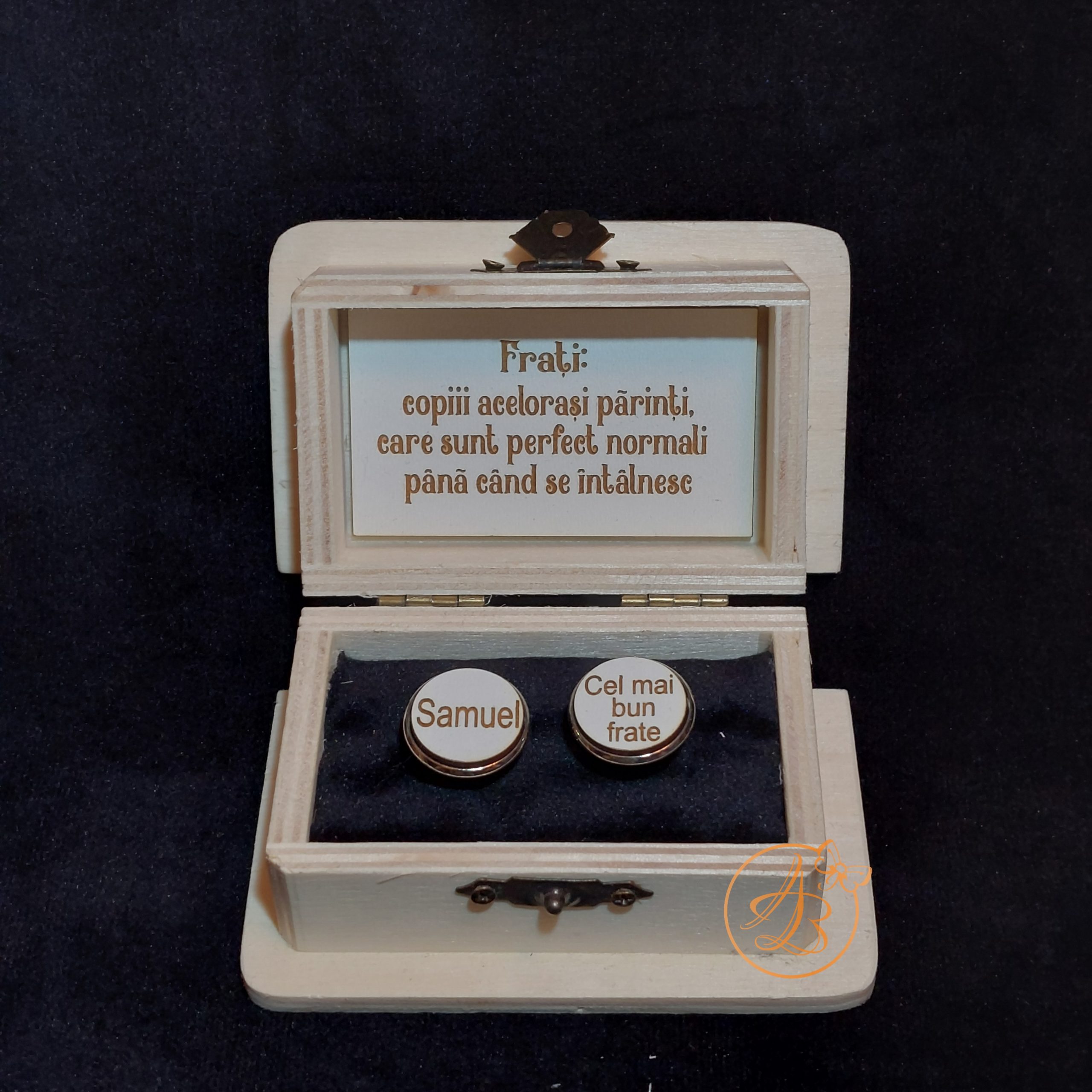 Butoni cu baza din lemn, asezate in cutie personalizata. Setul se personalizeaza prin gravura.