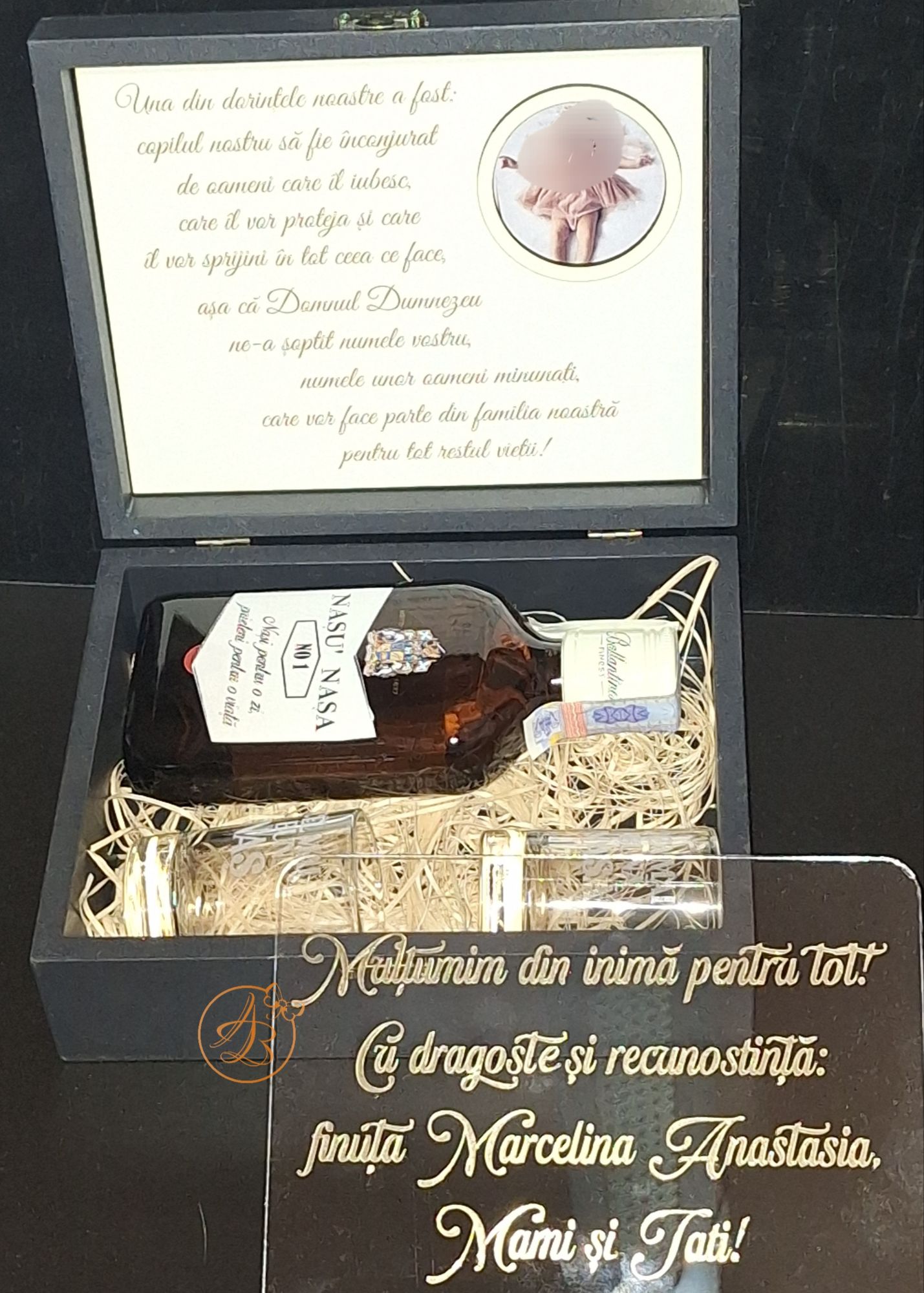 Cadou pentru nasii de botez alcatuit dintr-o cutie personalizata, cu bautura si 2 pahare gravate, precum si o placa plexiglass personalizata cu textul dorit.