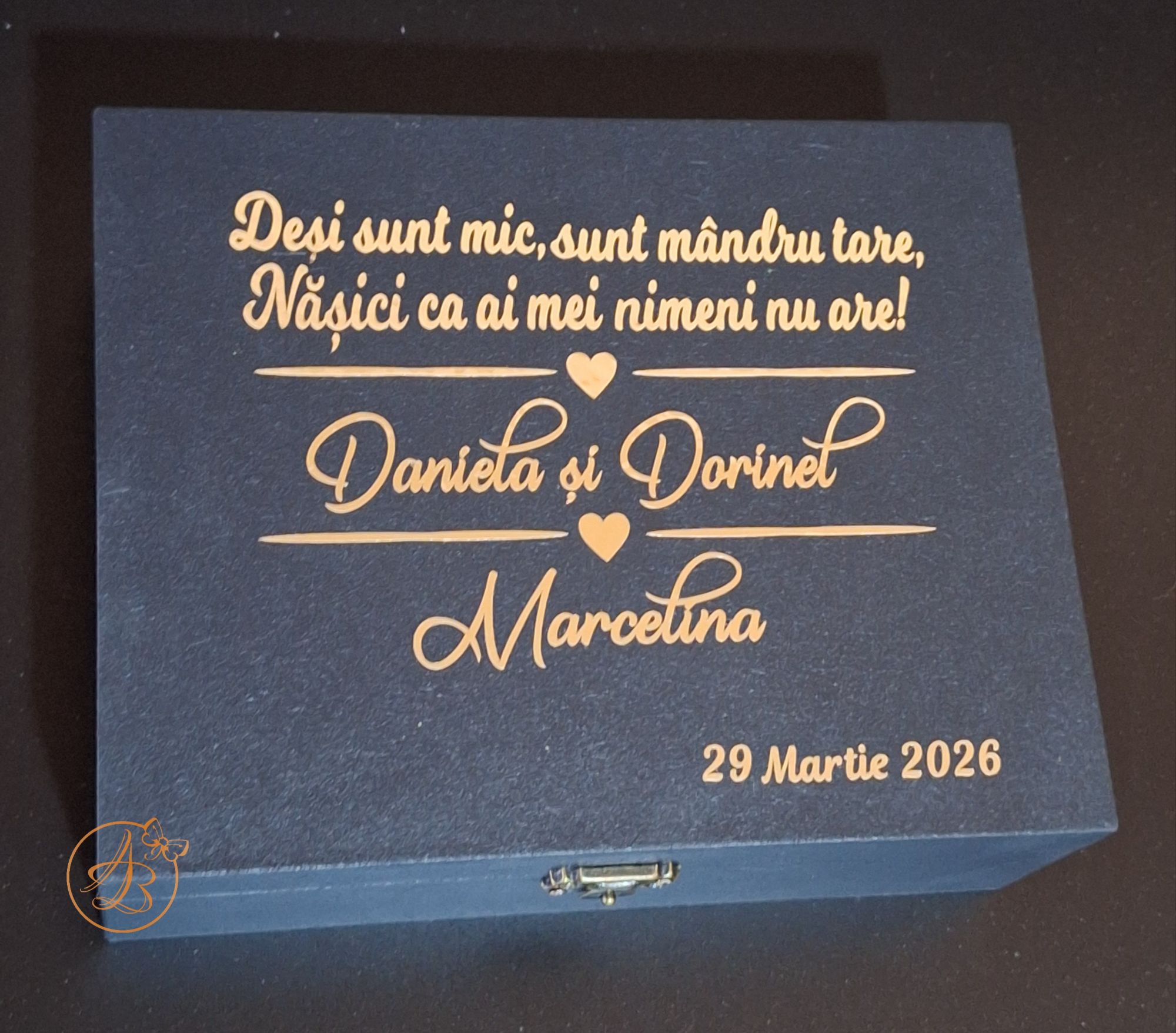 Cutia este vopsita in culoare neagra, in interior cu placa alba gravata (cu textul dorit) , si poza copilasului.