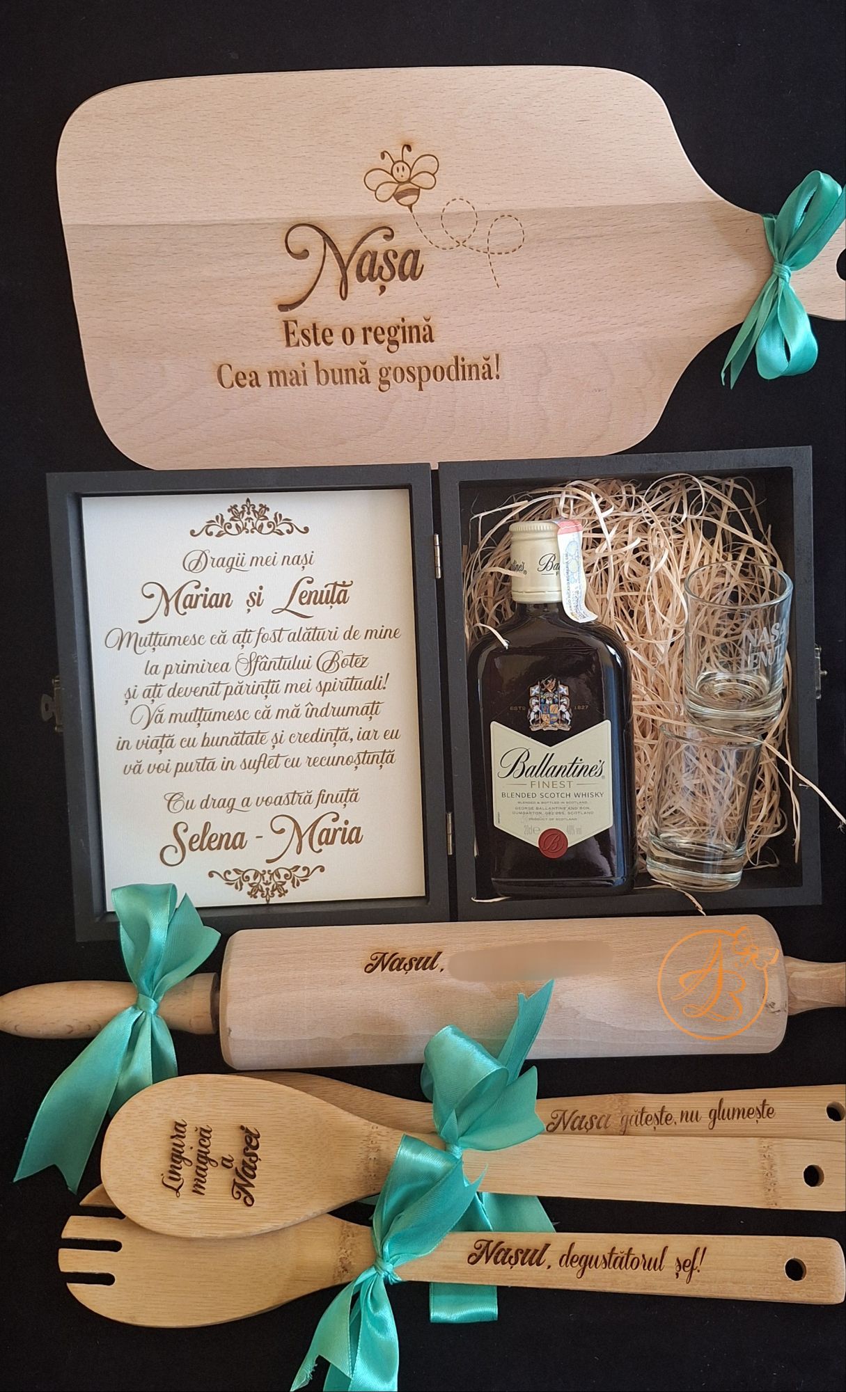 Cadou pentru nasii de botez alcatuit din set gravat pentru bucatarie si cutie decorata.