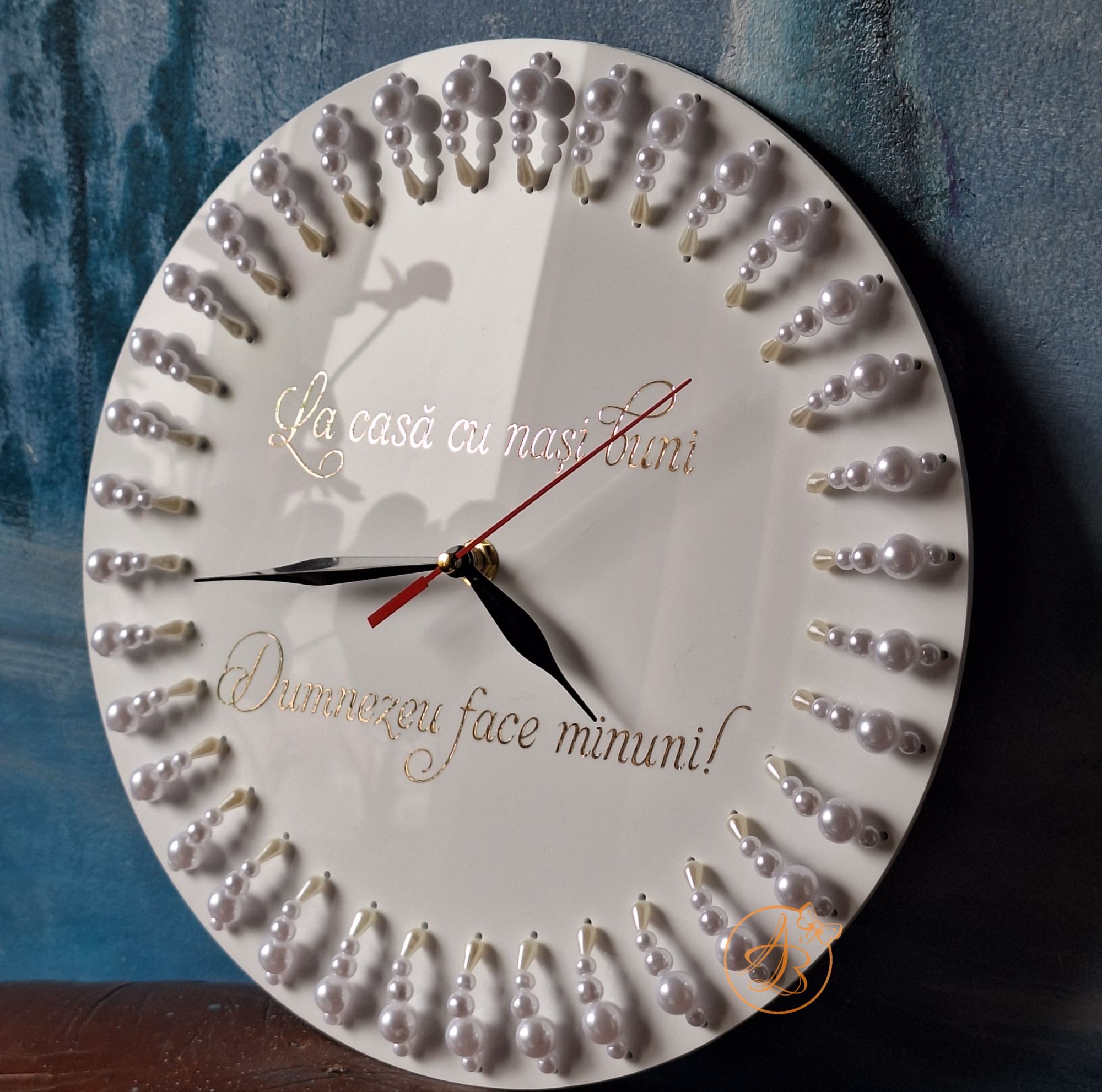 Ceas pentru perete, deosebit de elegant, din plexiglass alb, decorat cu margele atasate bucata cu bucata, si text auriu la alegere.