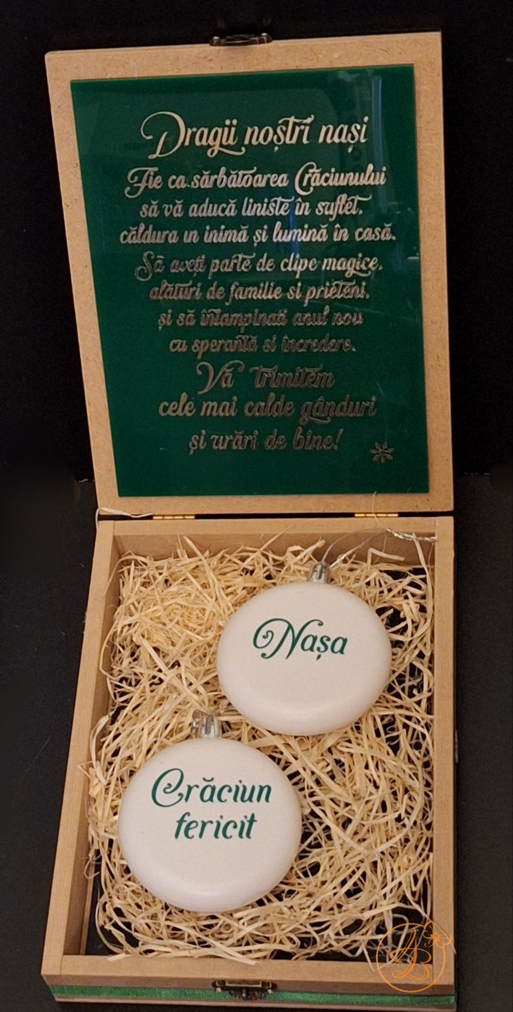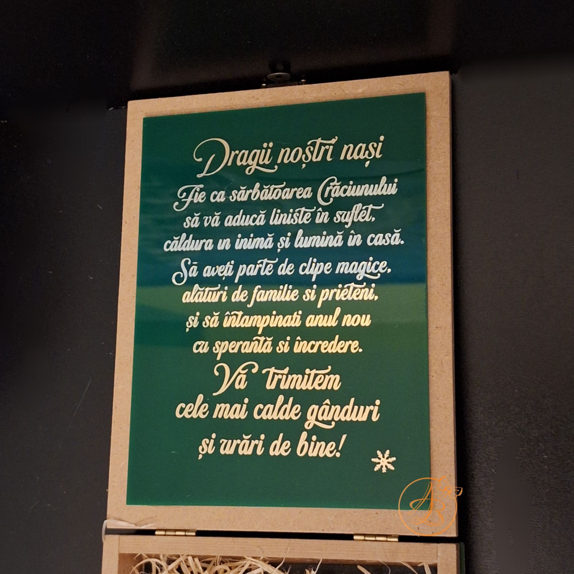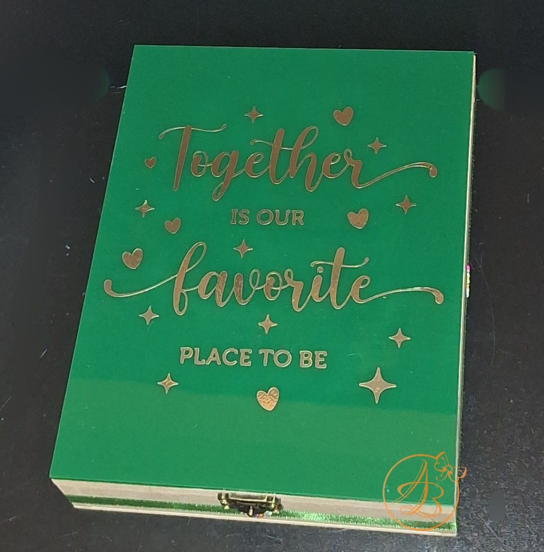 Capacul si interiorul este plexiglass verde, personalizat cu sticker auriu.
