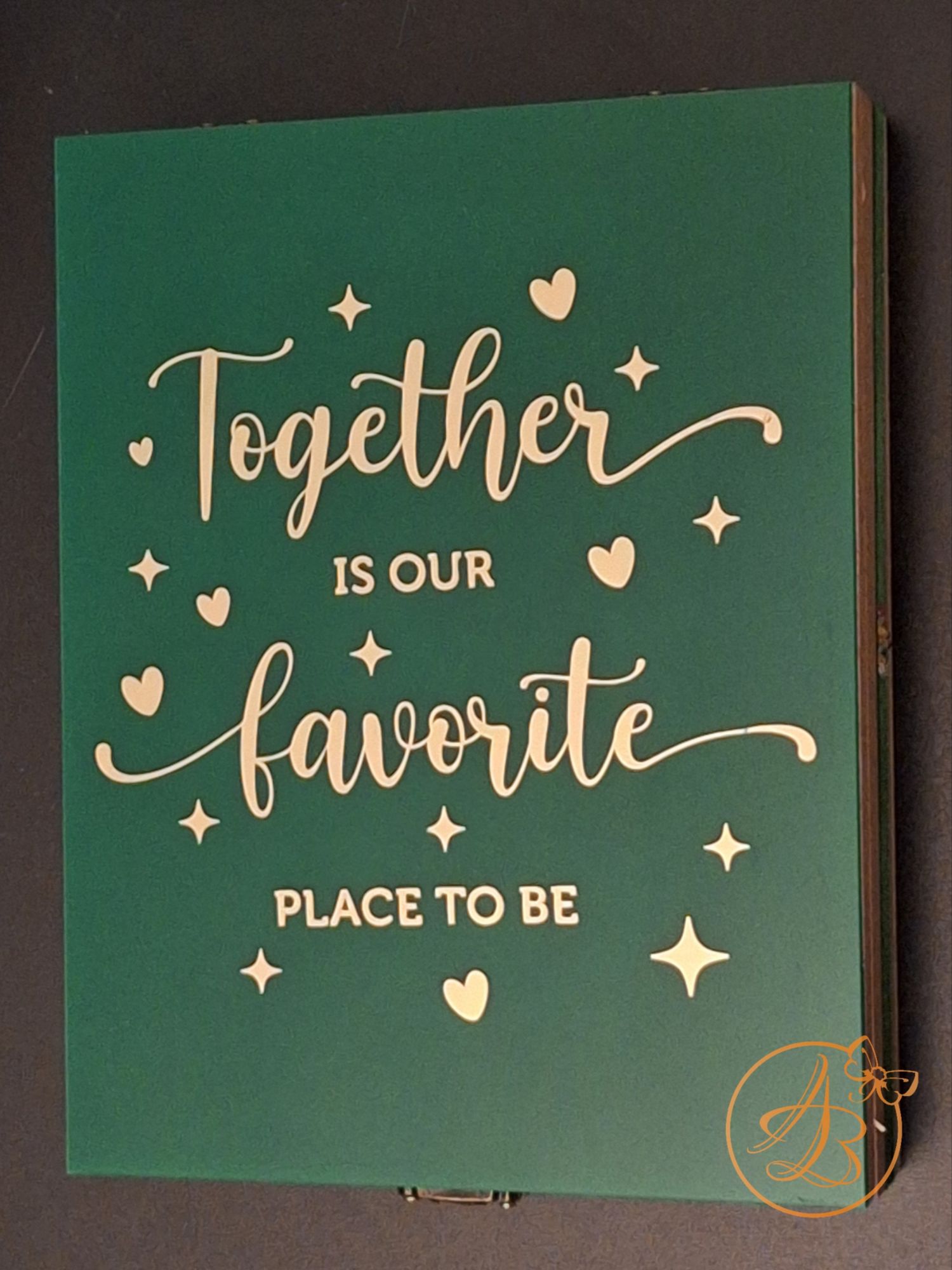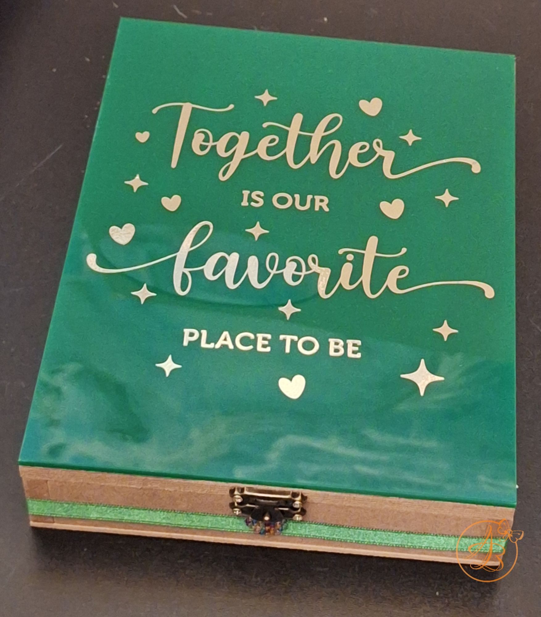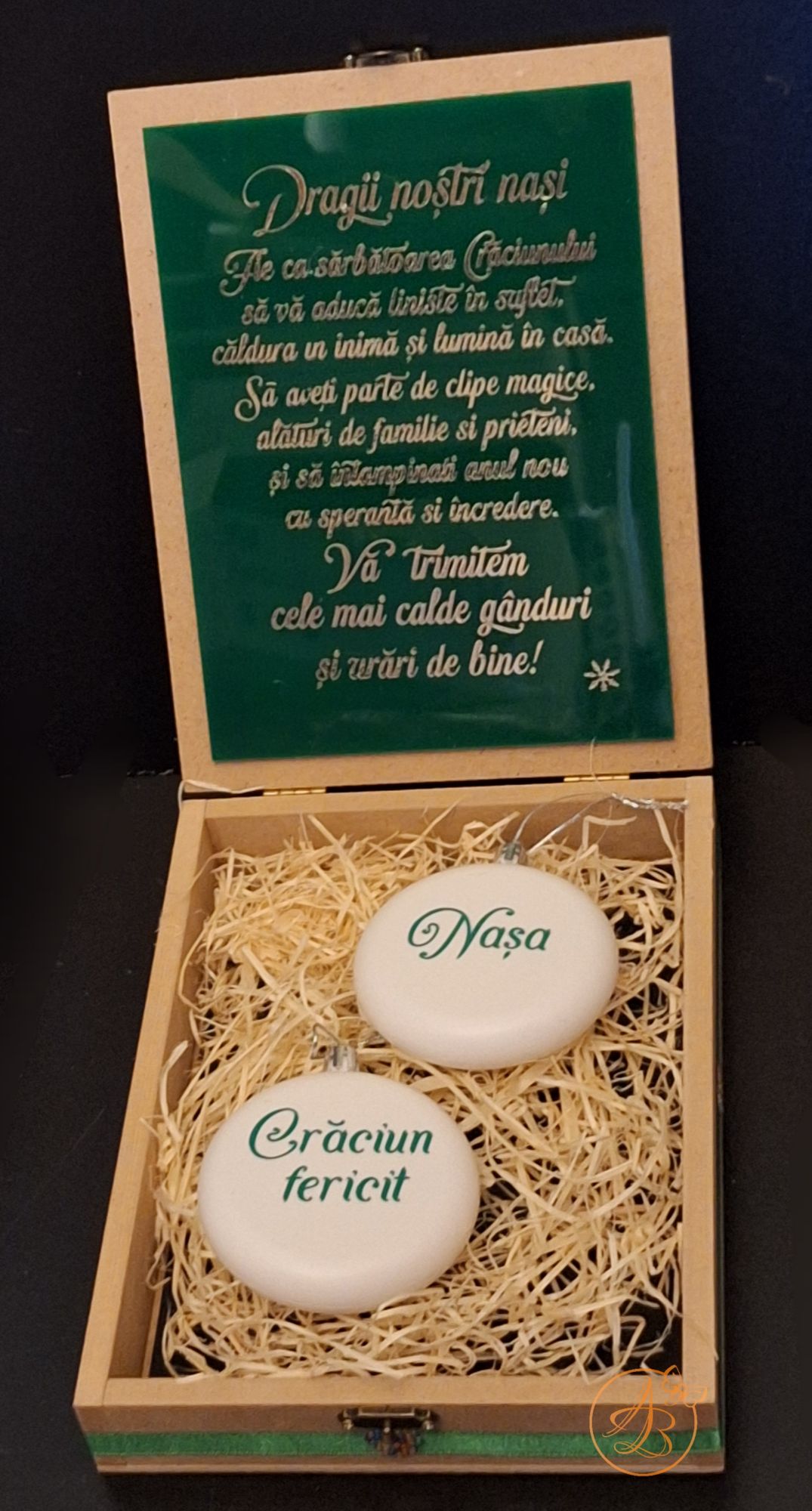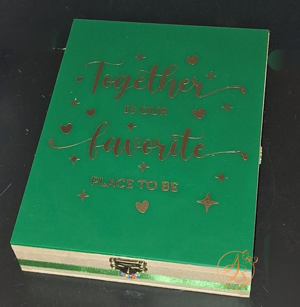 Capacul si interiorul este plexiglass verde, personalizat cu sticker auriu.