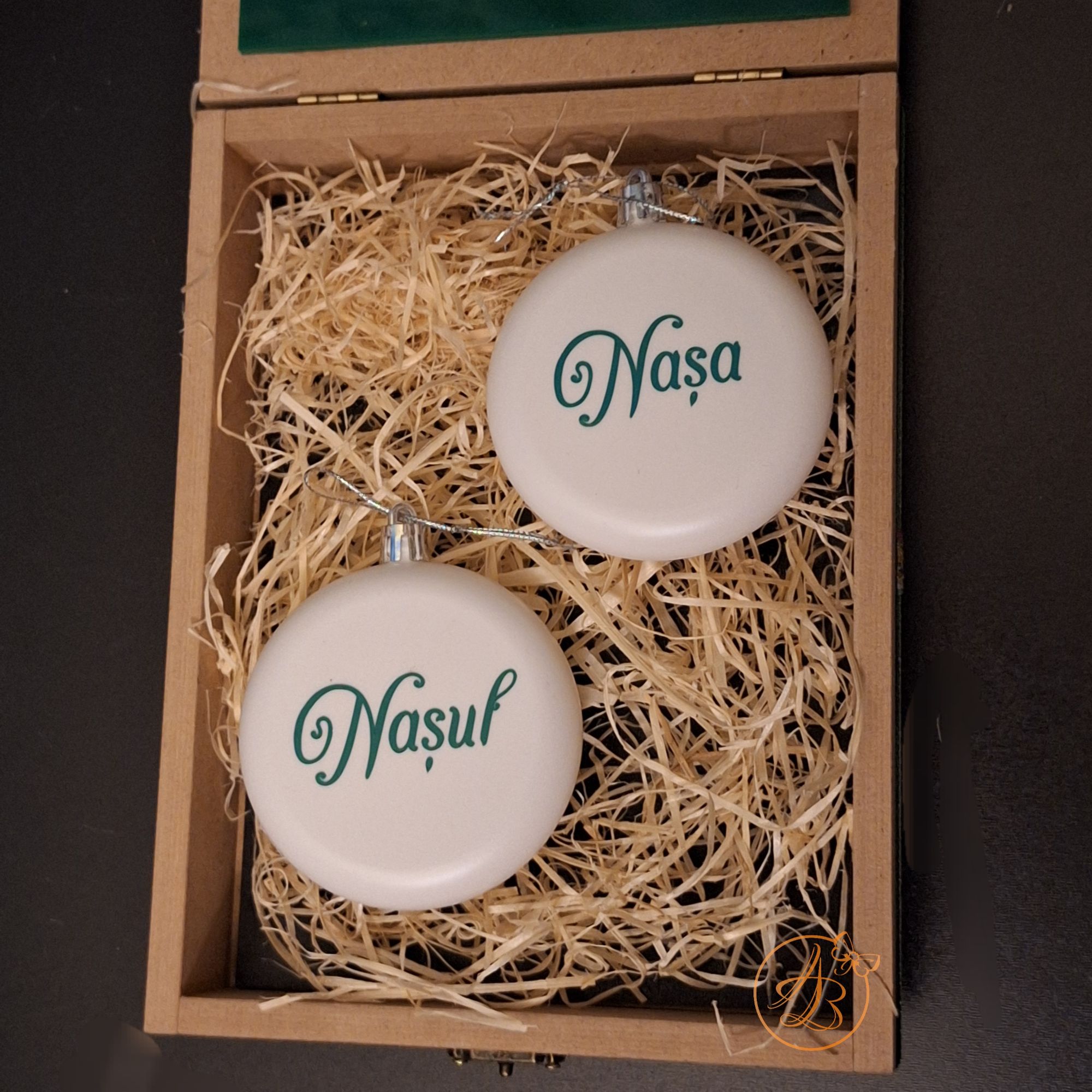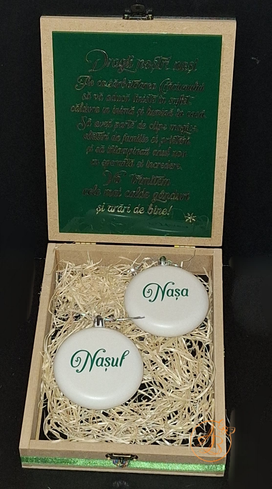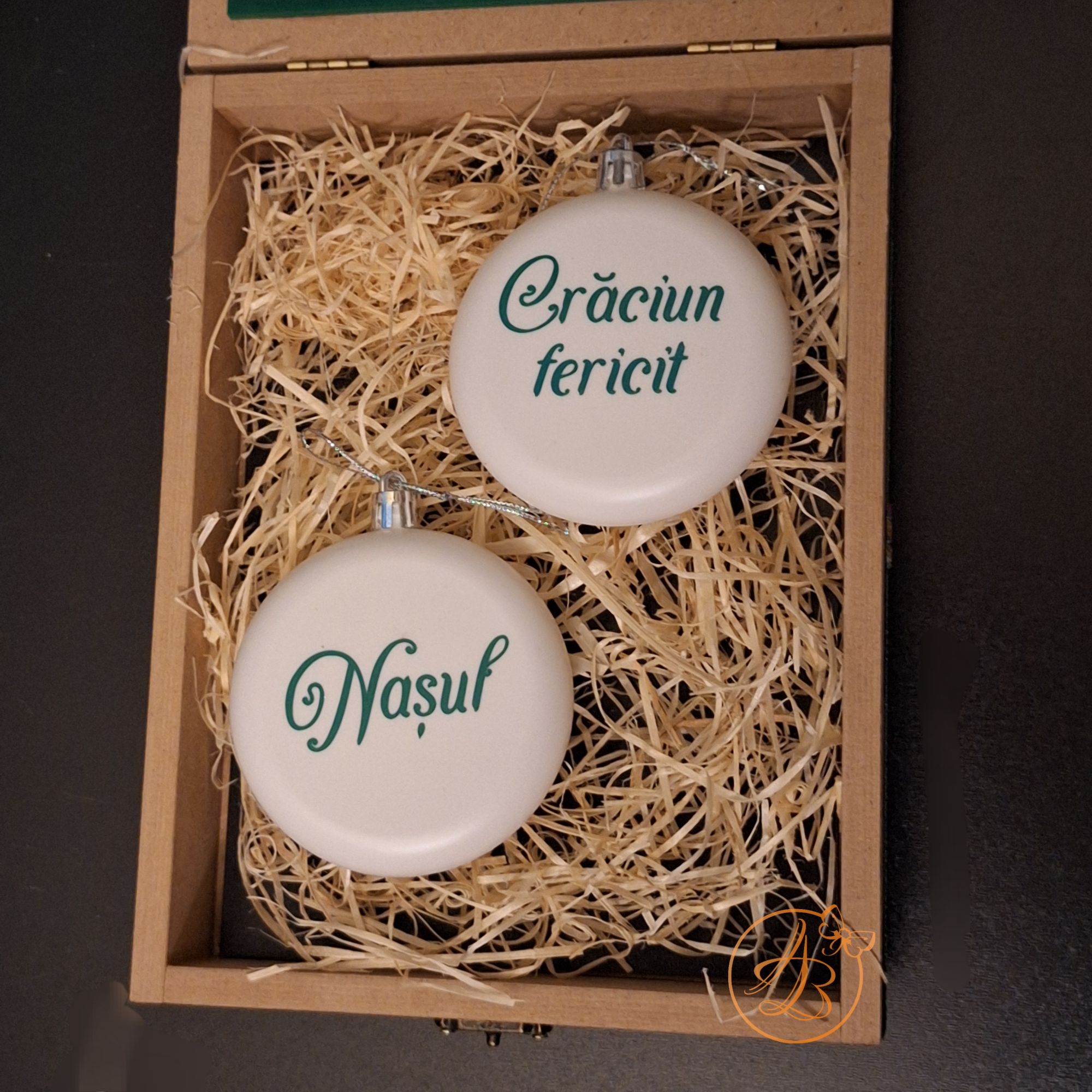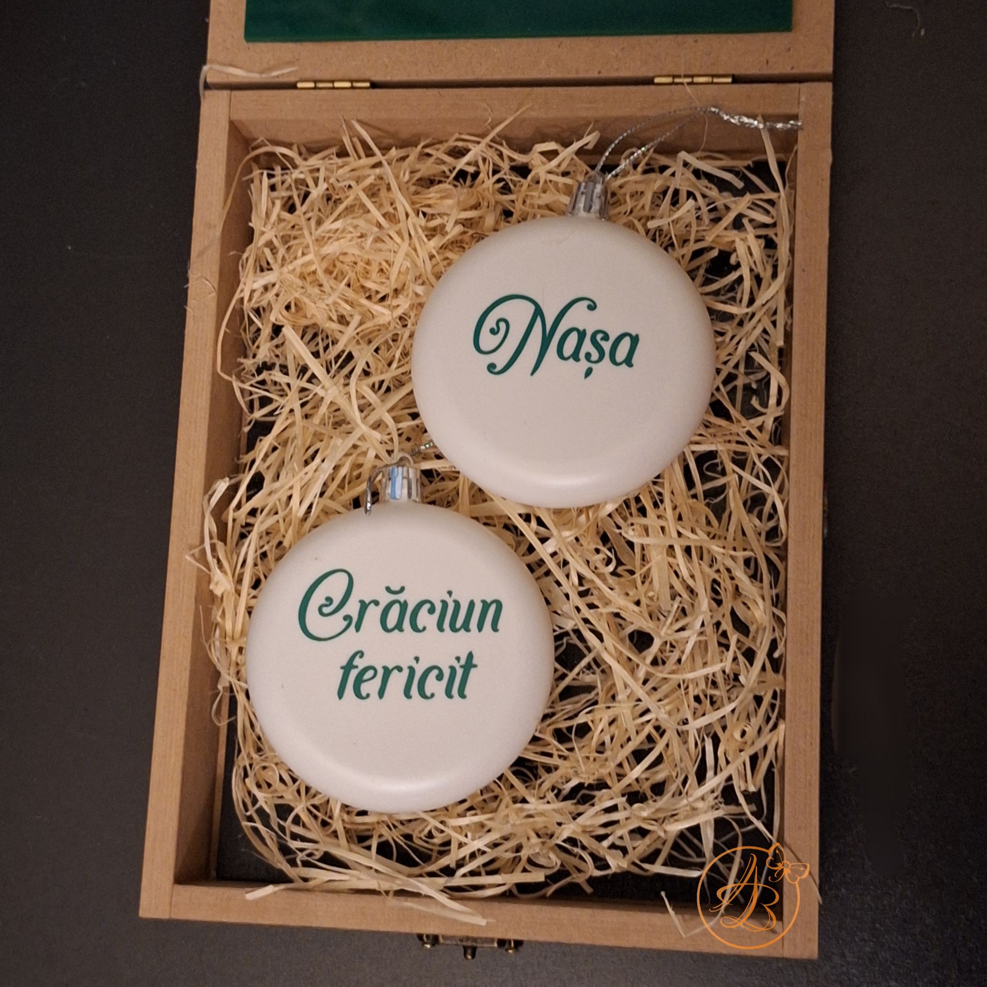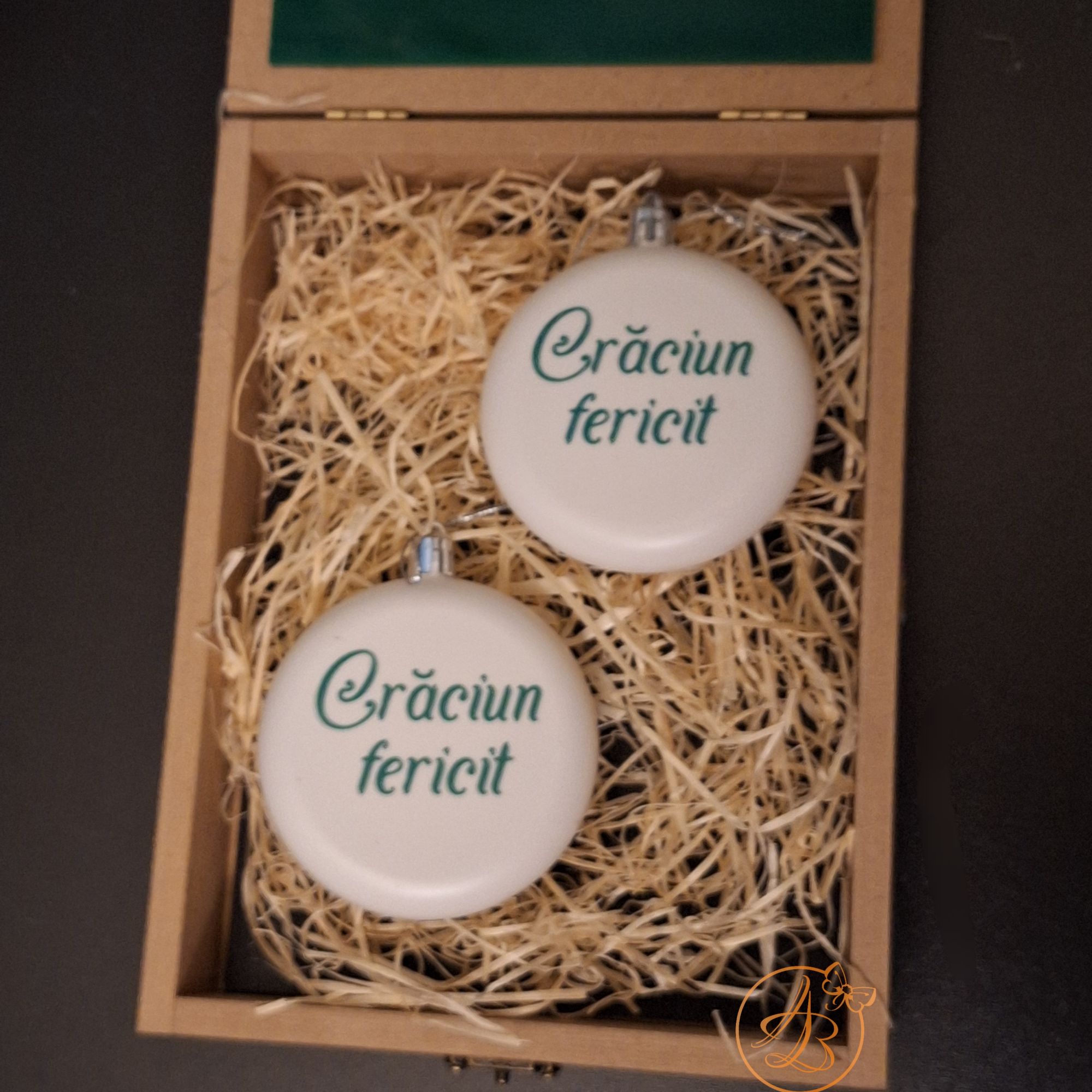 In interior se afla 2 globulete don plastic, marime 8cm, personalizat cu vinil verde.