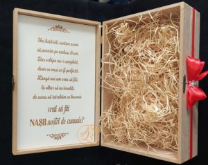 Cutie natur cu placa gravata si pahare gravate