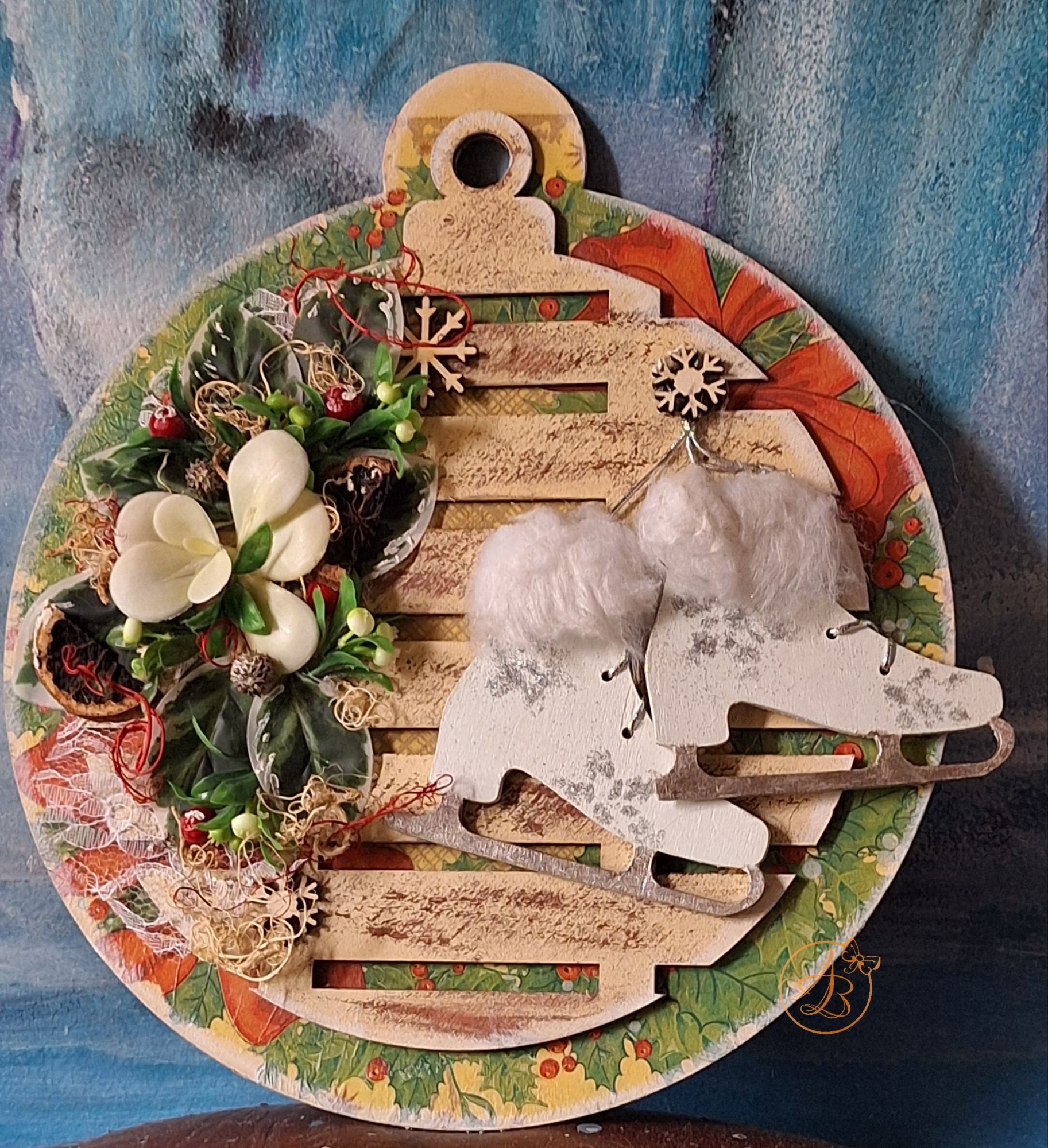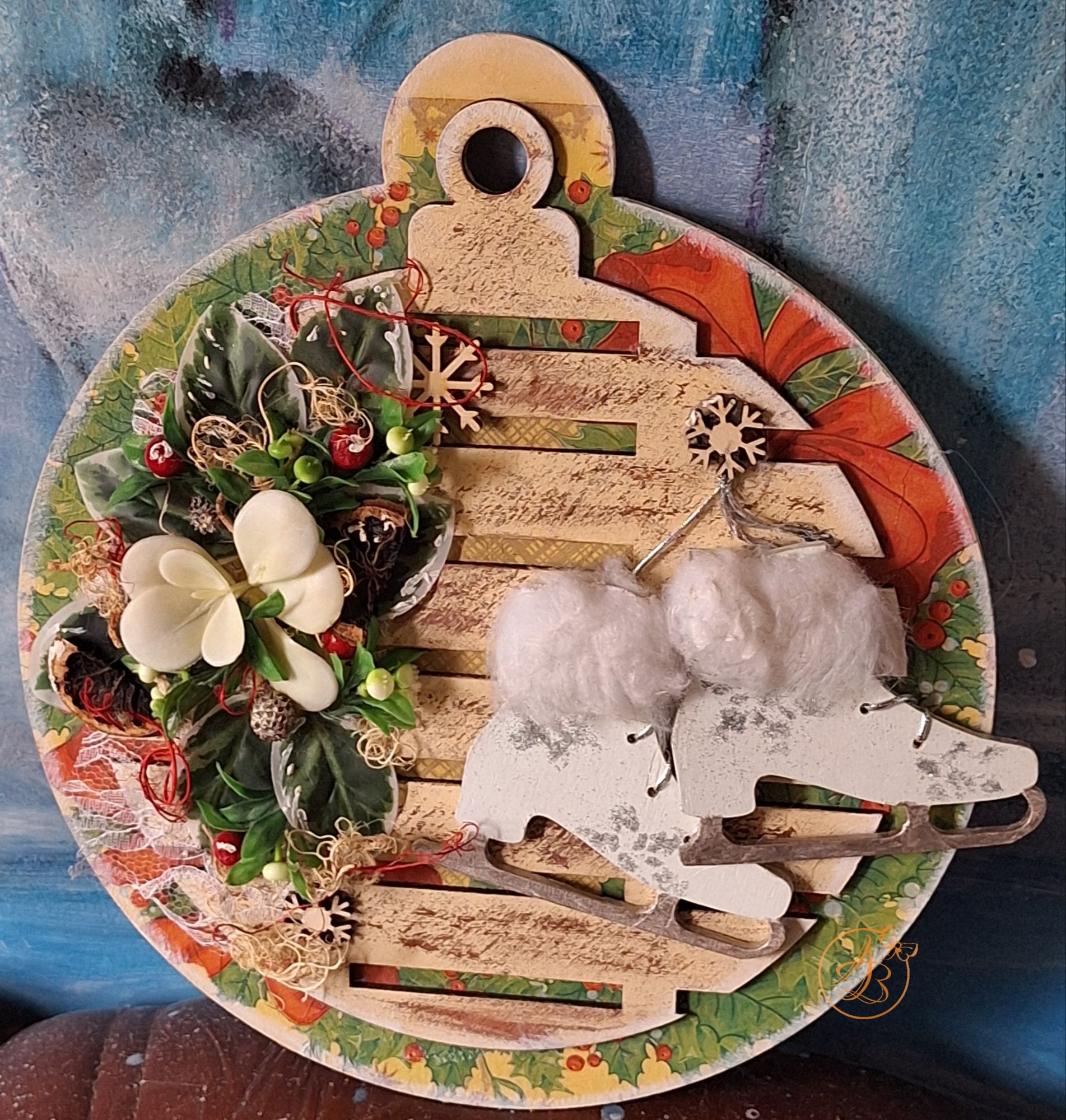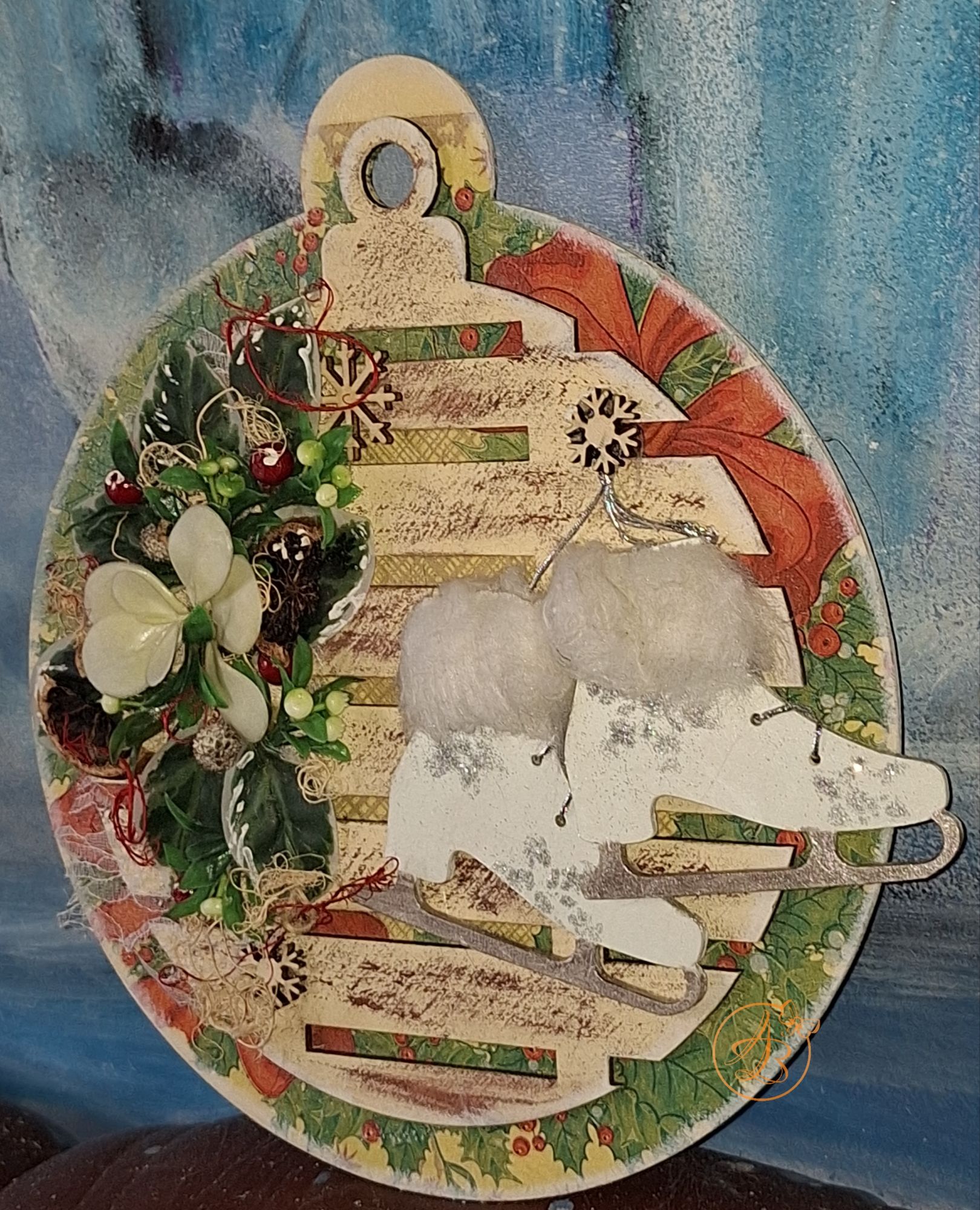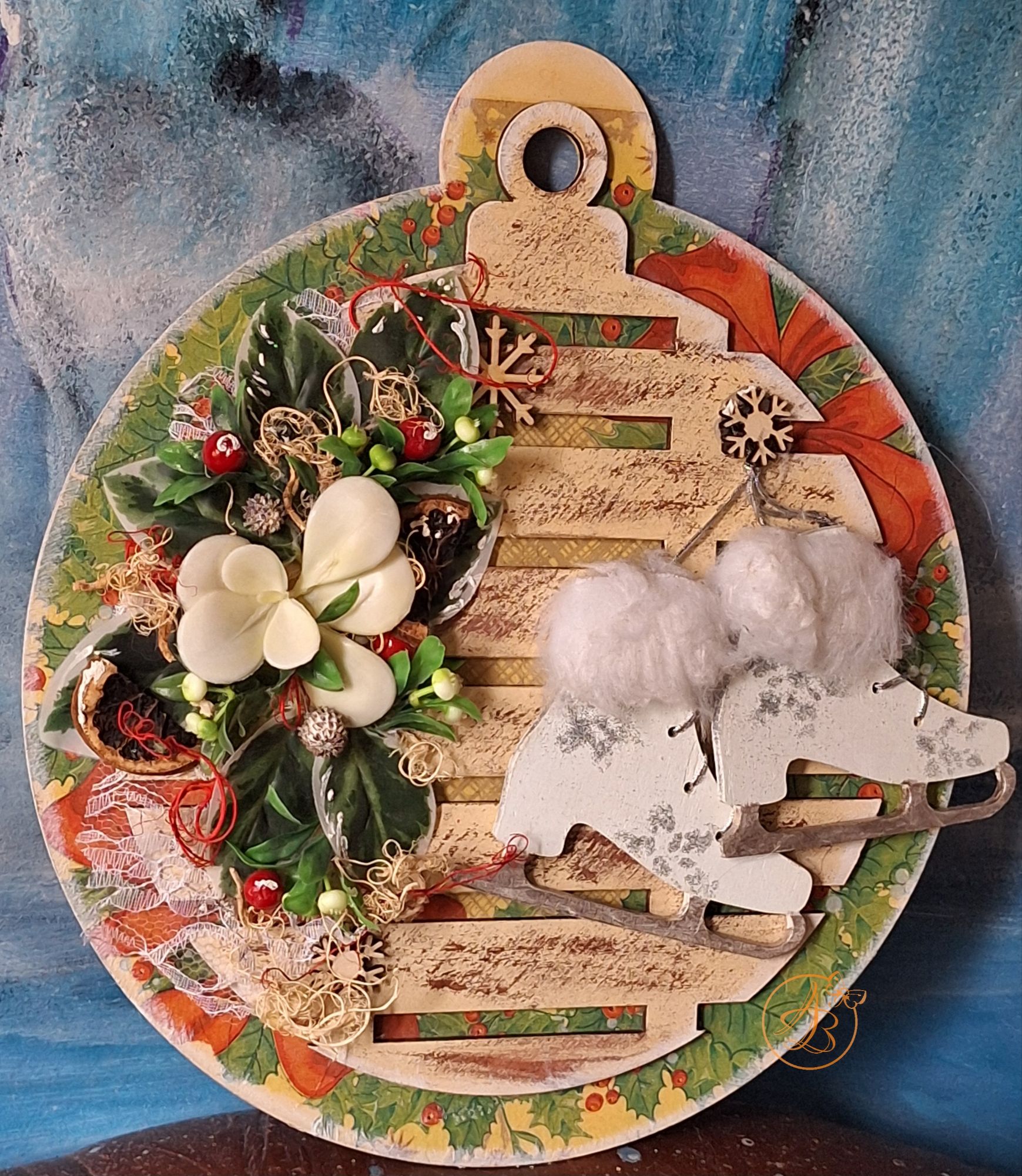 Este realizat din placaj, mai multe straturi, are dimensiune 30x30cm, este decorat manual cu diferite tehnici.