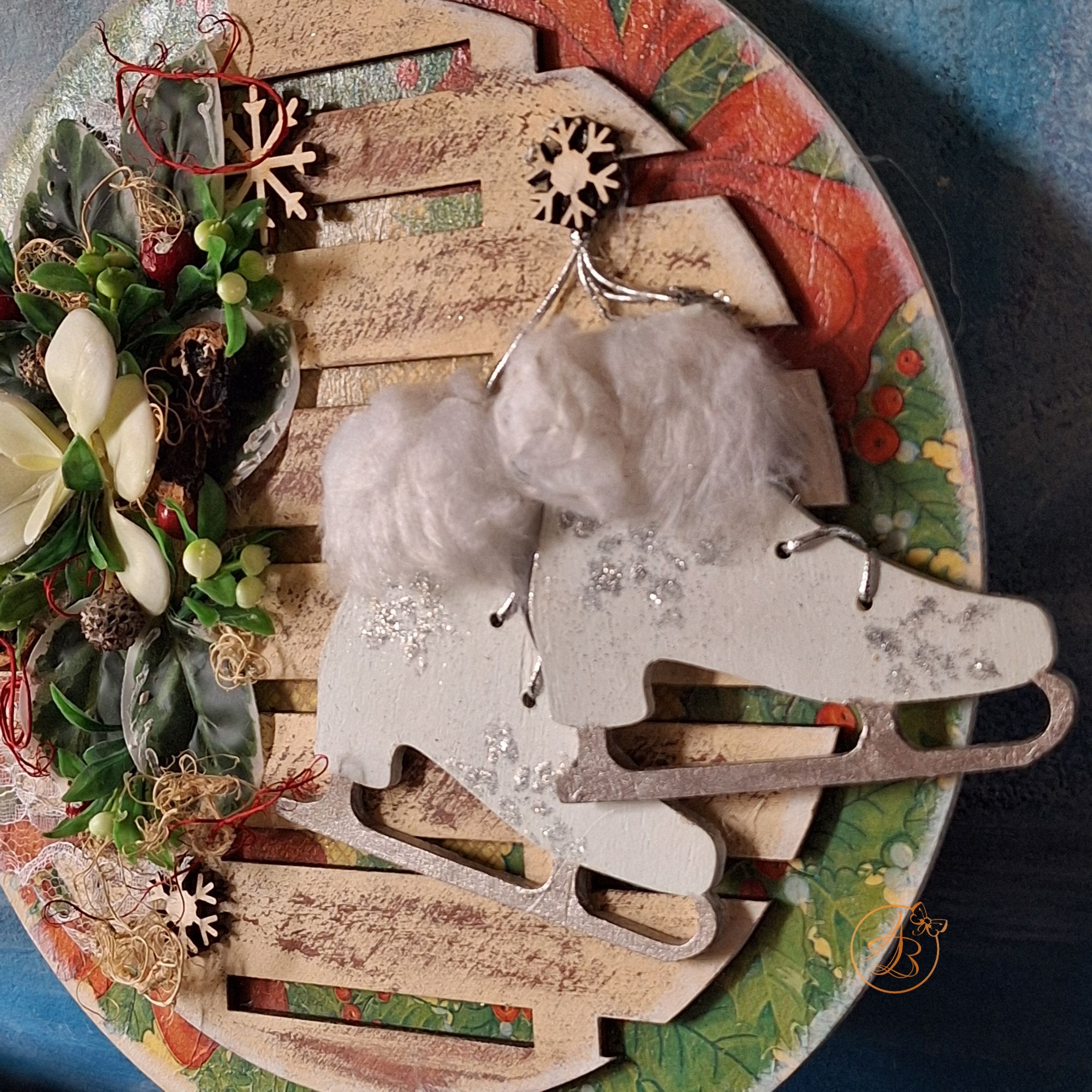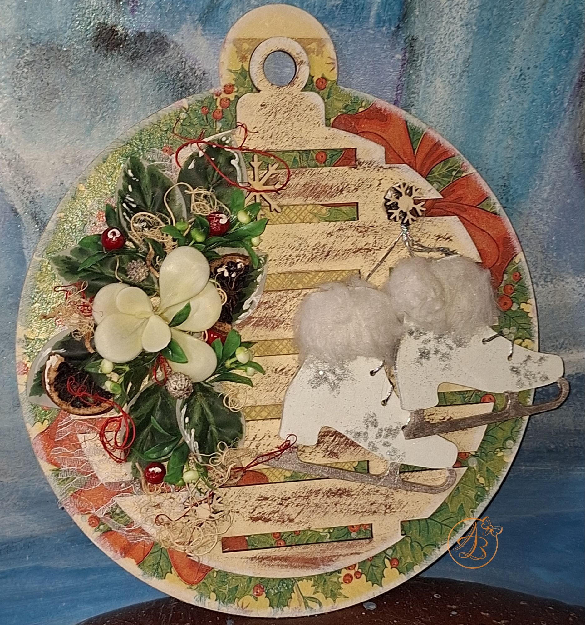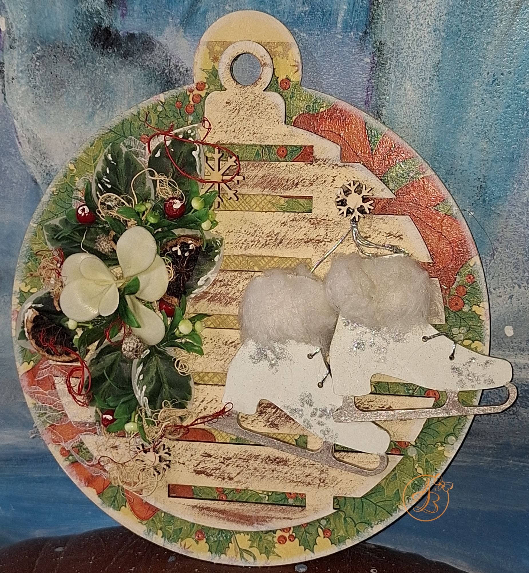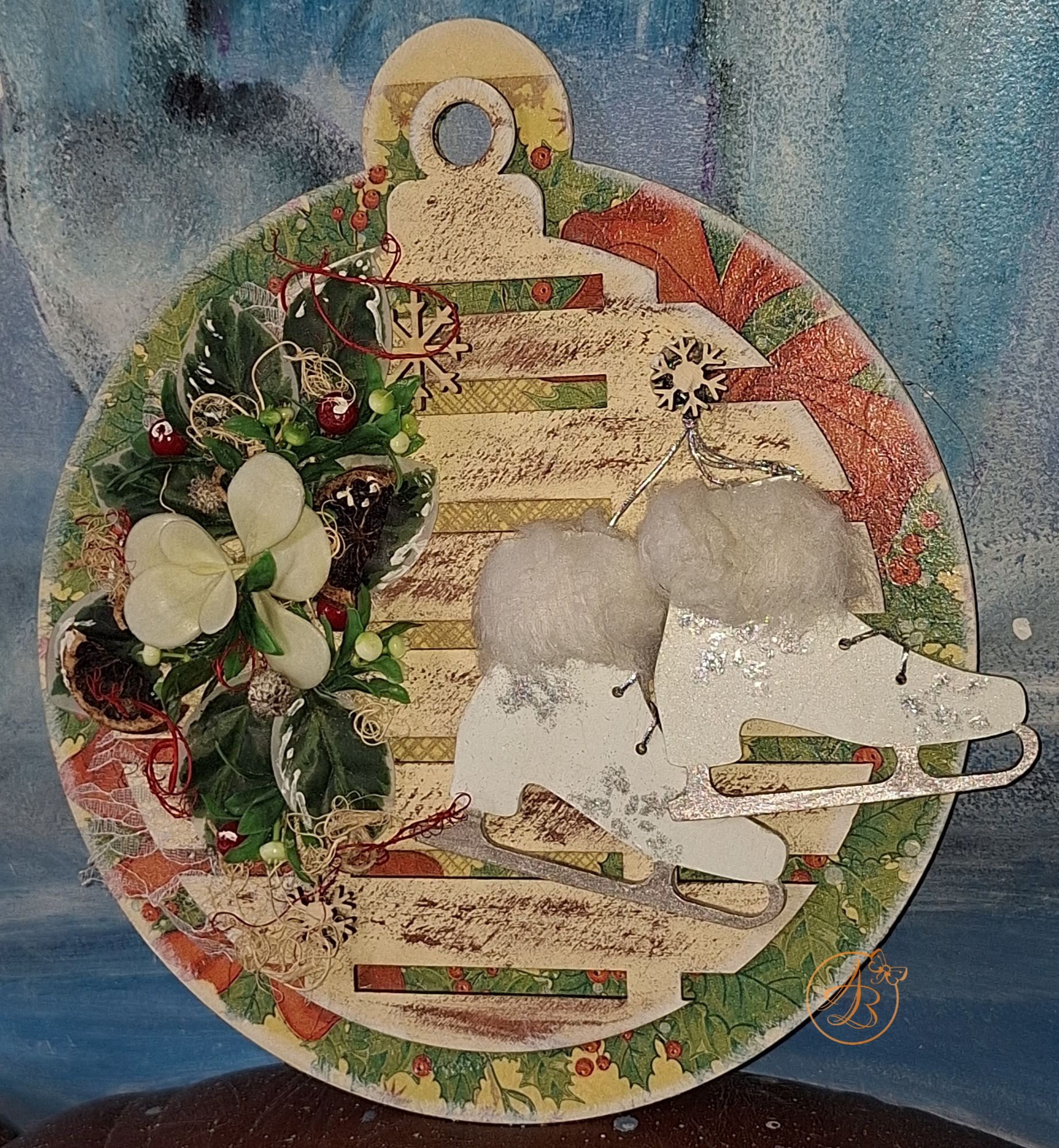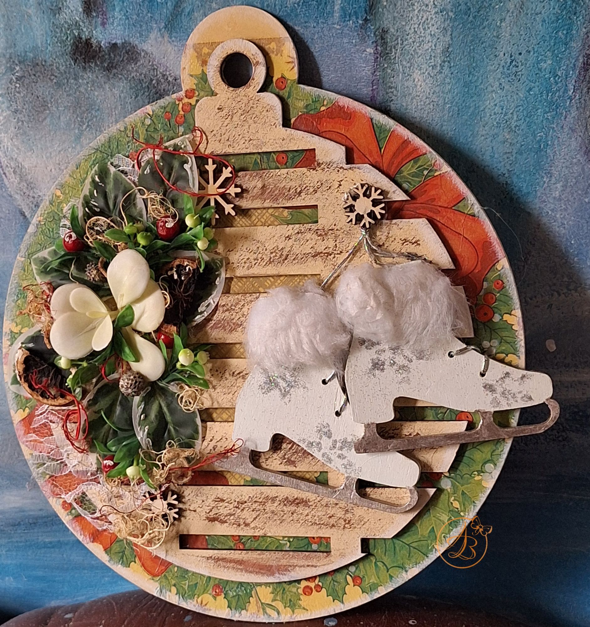 Este realizat din placaj, mai multe straturi, are dimensiune 30x30cm, este decorat manual cu diferite tehnici.