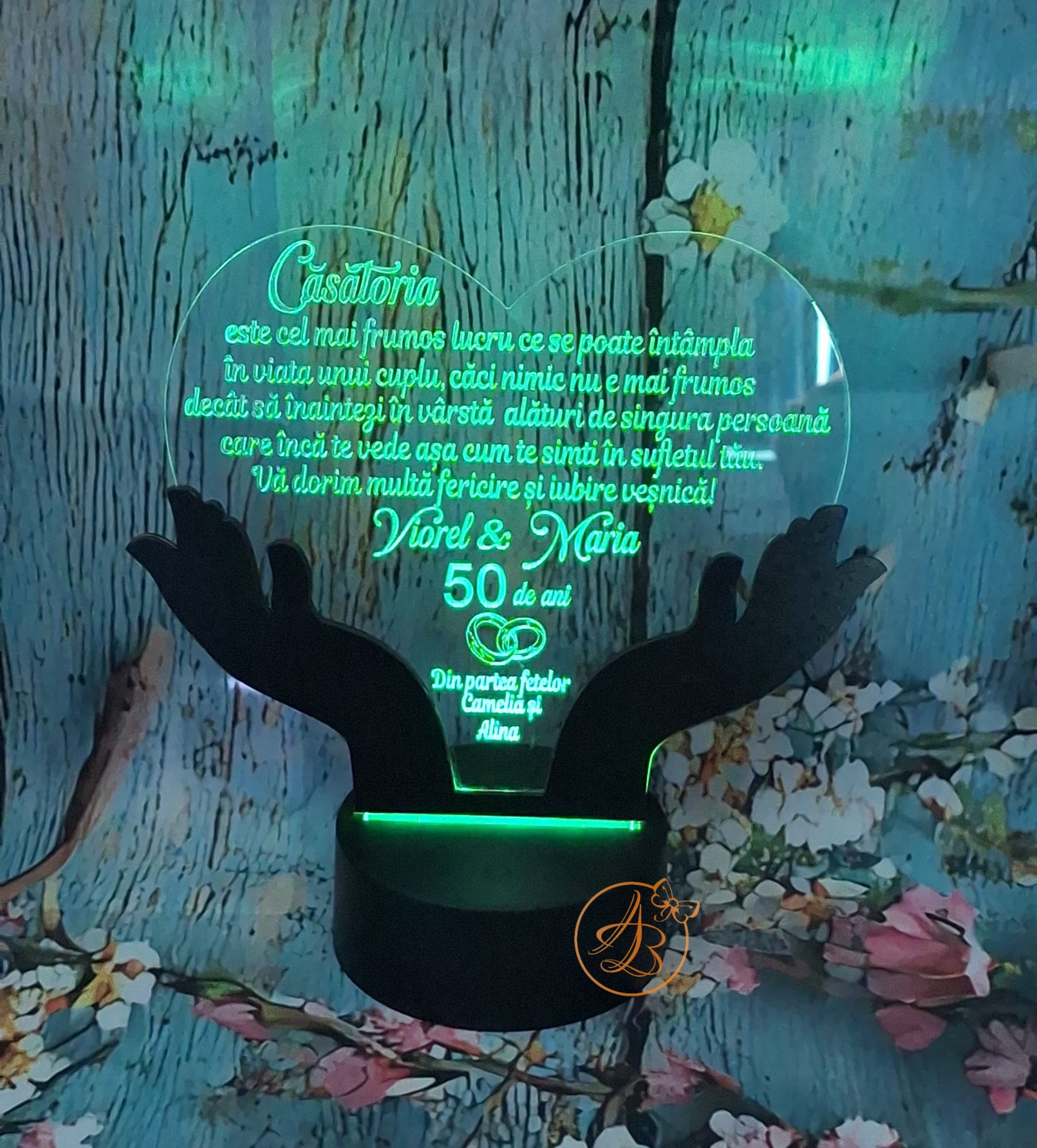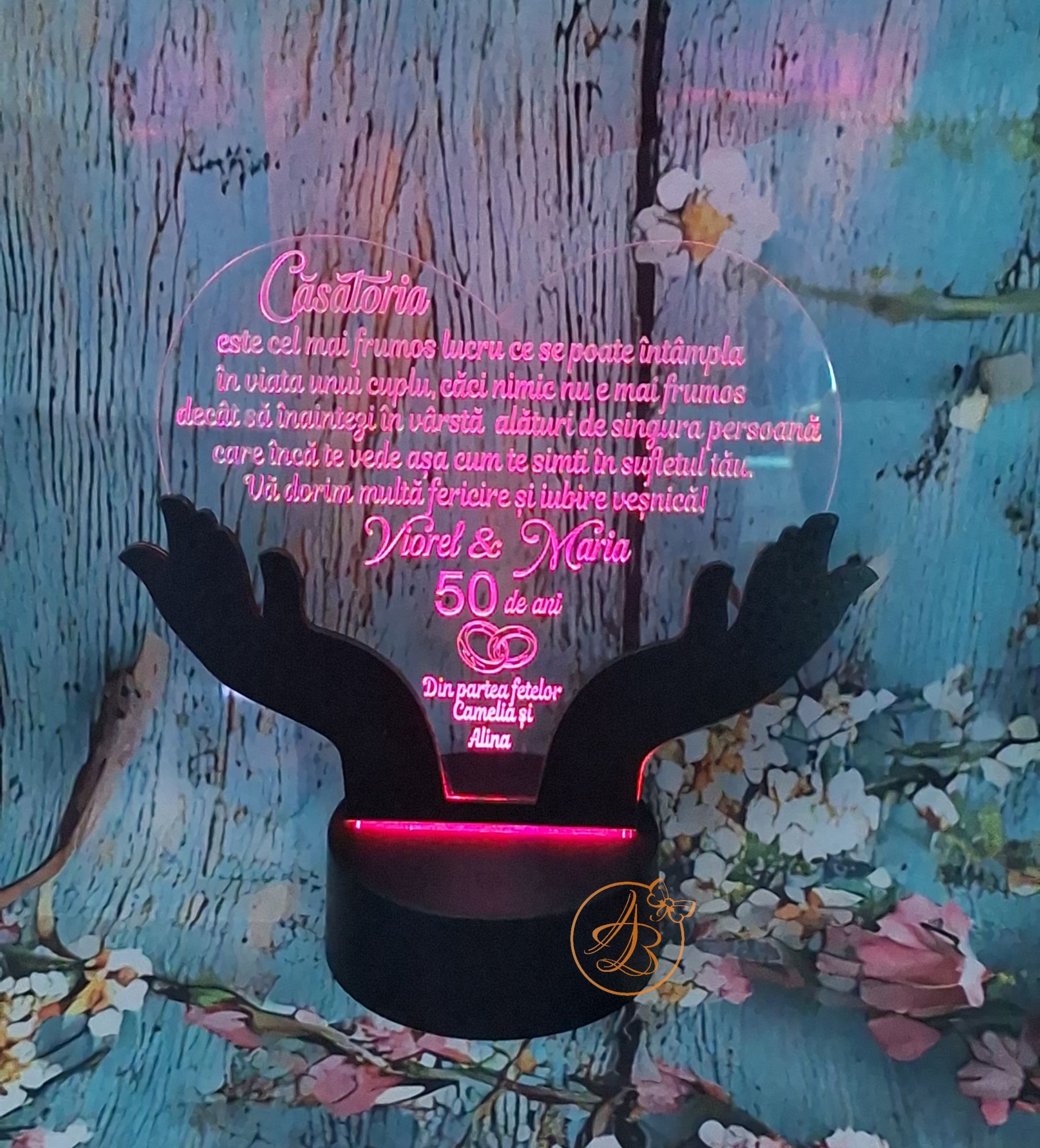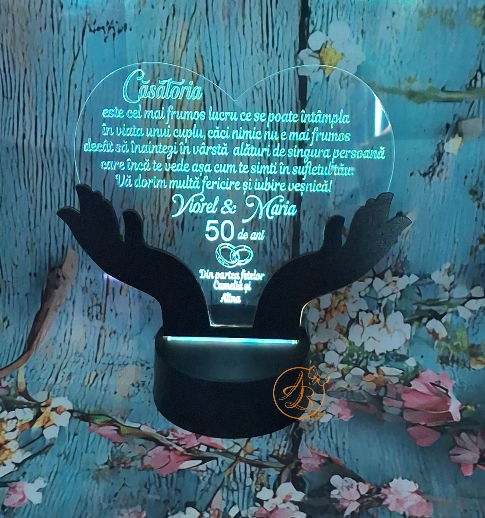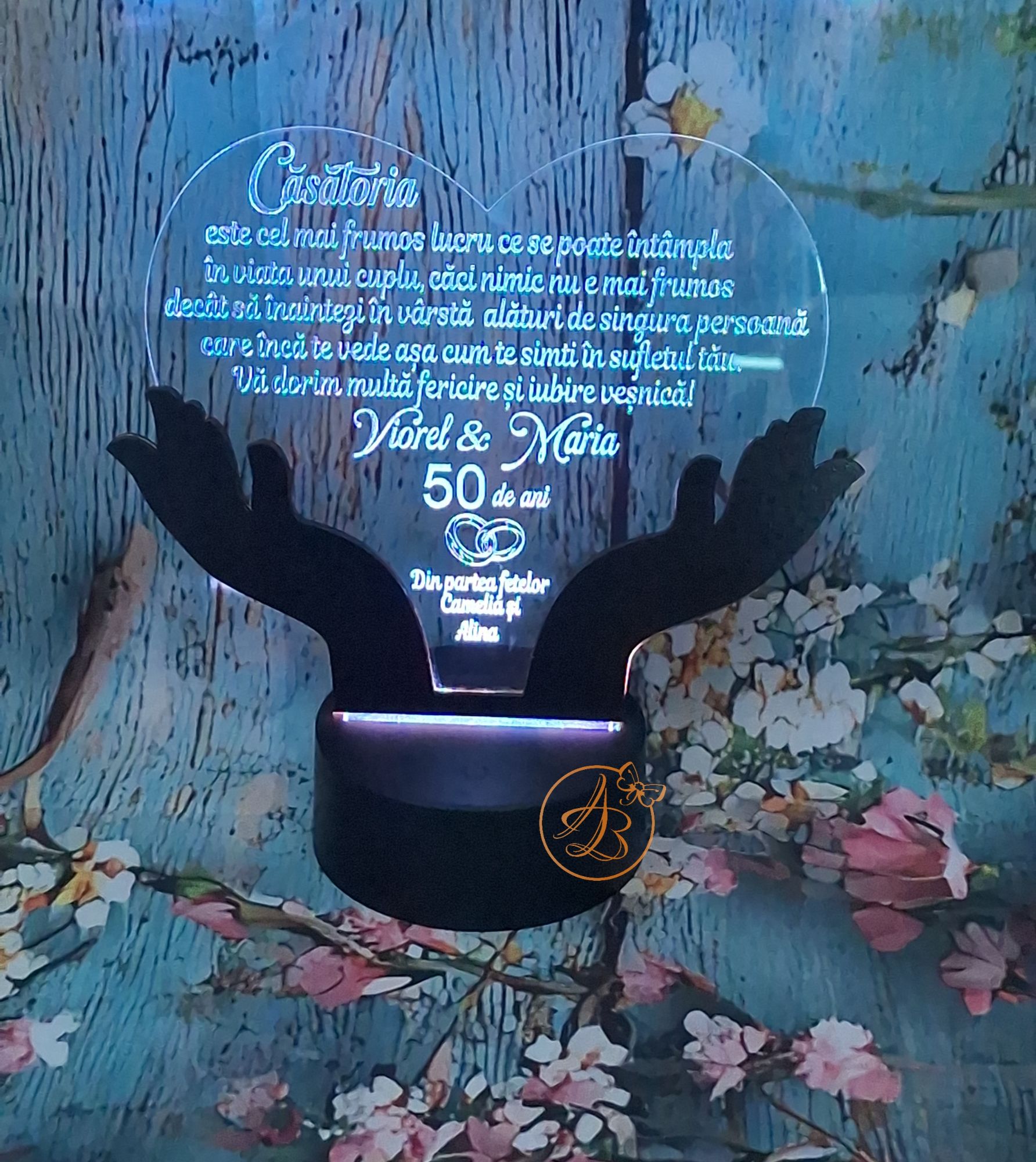 Inimioara este realizat din material plexiglas, se personalizeaza cu orice text si la cerere se poate adauga 1 poza (poza se va trimite prin mail sau watsapp).