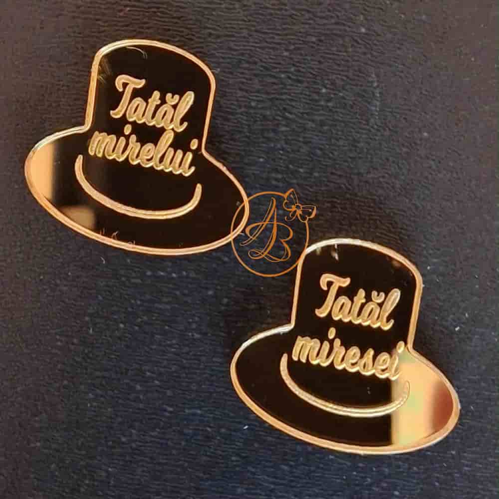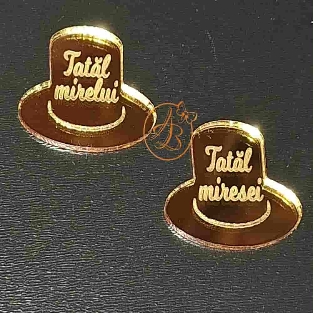 Insigne realizate din oglinda aurie acrilica, forma aleasa (papion, inimioara, fluture, joben, mustat sau coronita), cu marime de 40 mm.