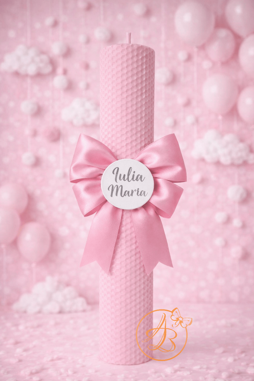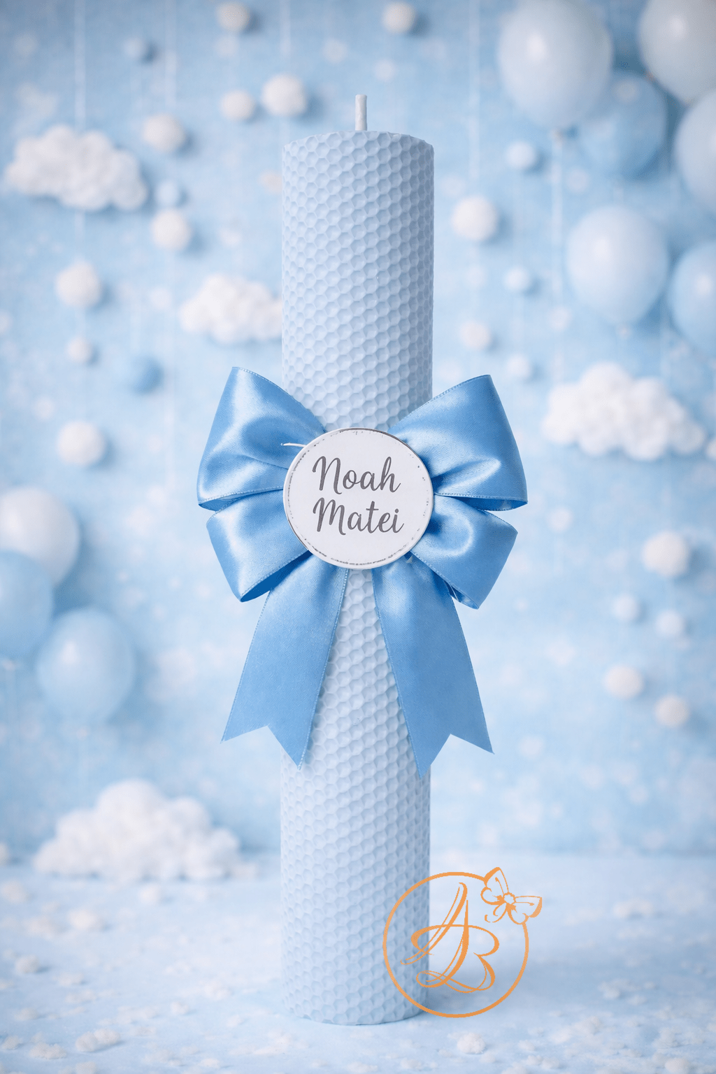 Lumanare tip fagure, decorata pentru botez fetita/baietel, cu fundita roz/albastra, si placuta gravata cu numele copilasului.