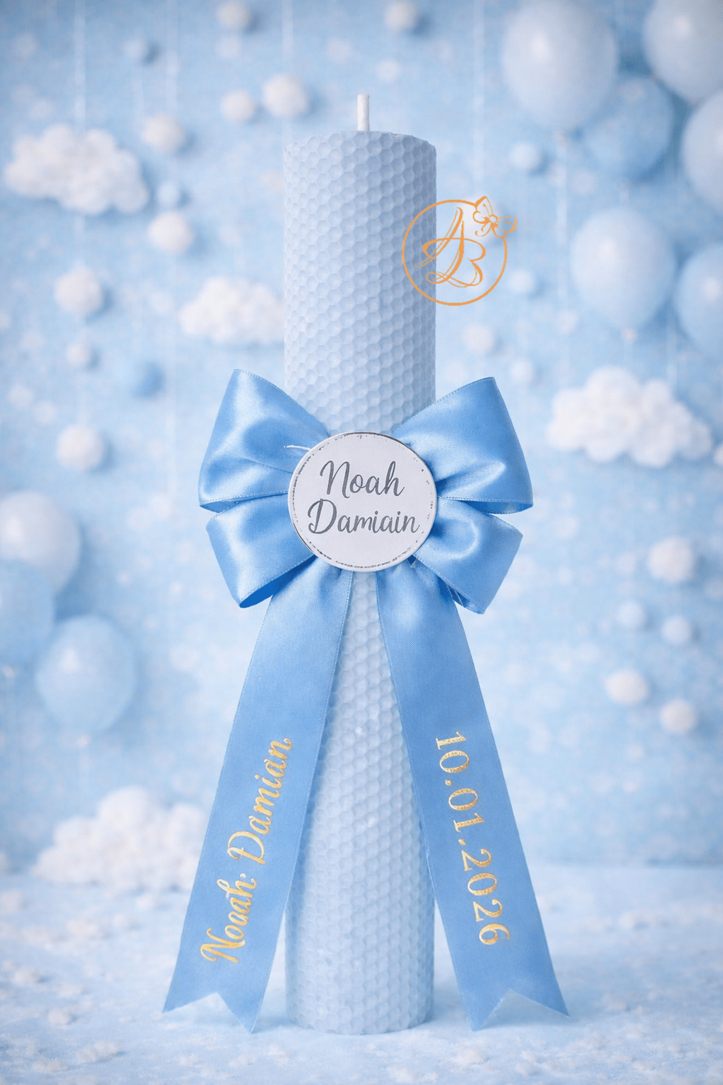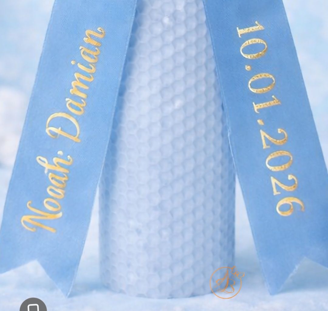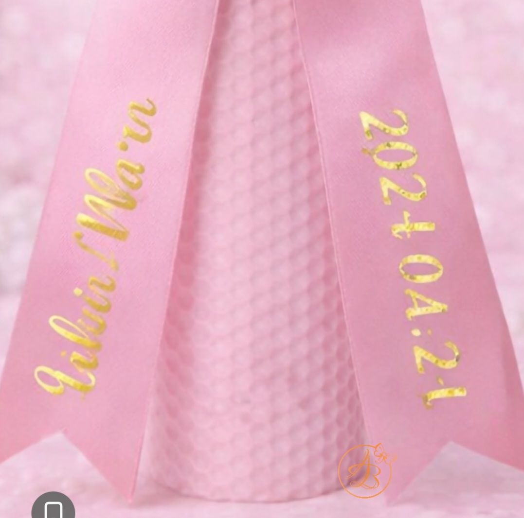 Pretul se refera la 1 lumanare roz sau albastra, cu inaltime 35cm, decorata cu fundita personalizata si placuta gravata.