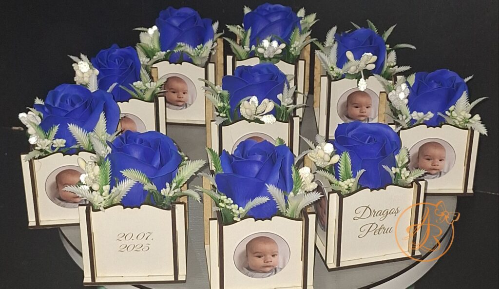 Marturie botez, cutiuta personalizata, cu trandafir si poza