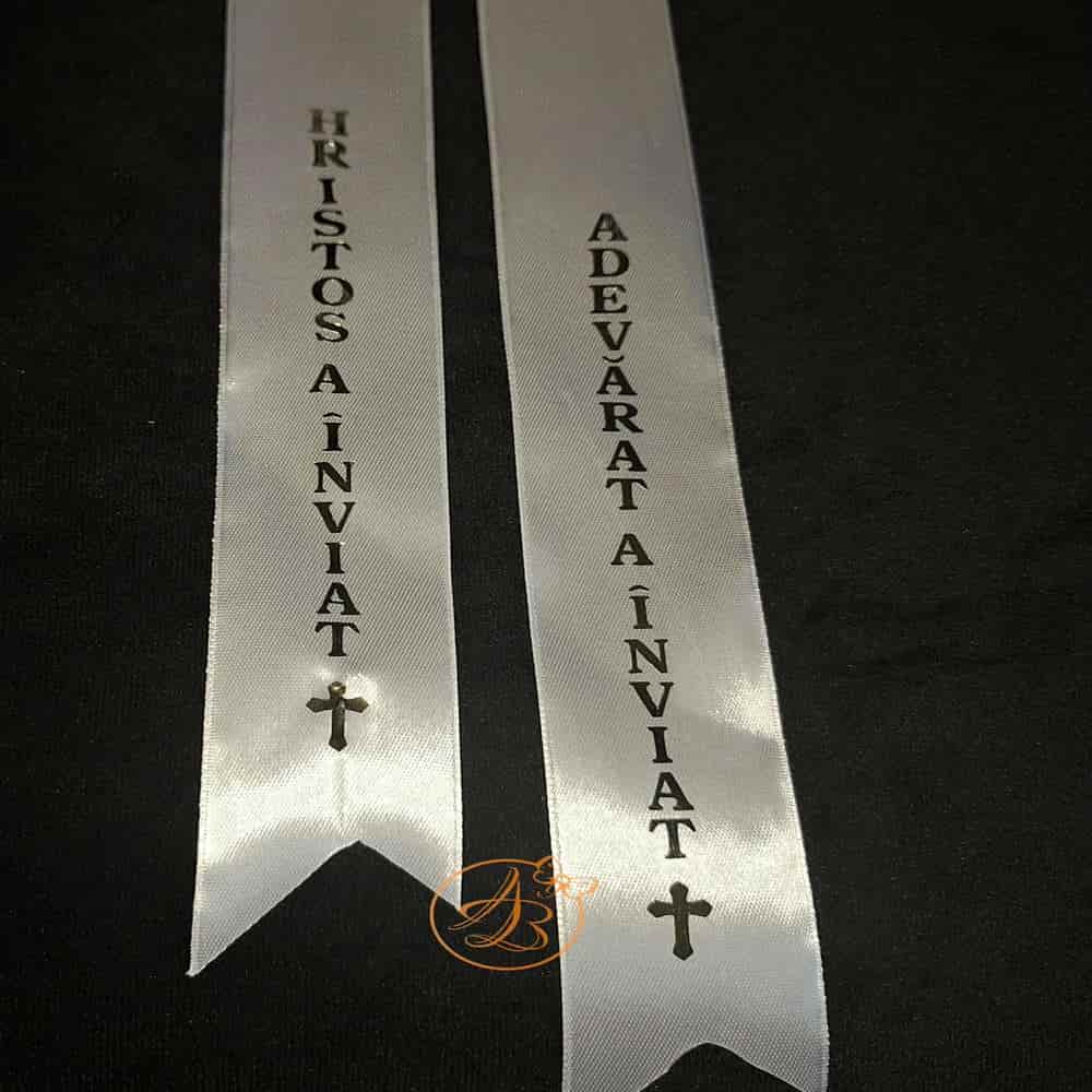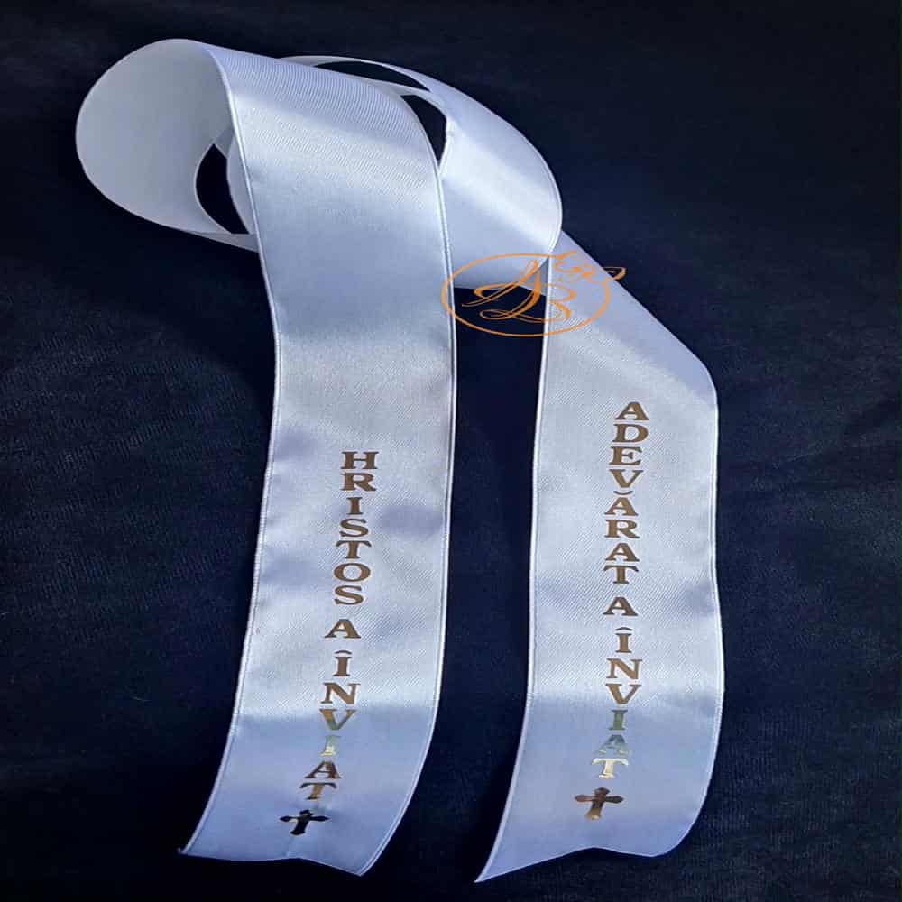 Panglica satin cu latime de 38mm, lungime 150mm, personalizata cu sticker auriu sau argintiu tip oglinda.
