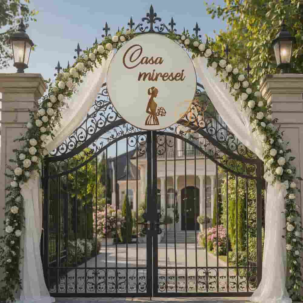 Decor elegant pentru casa miresei, realizat din baza alba MDf , text si figurina din oglinda acrilica aurie.