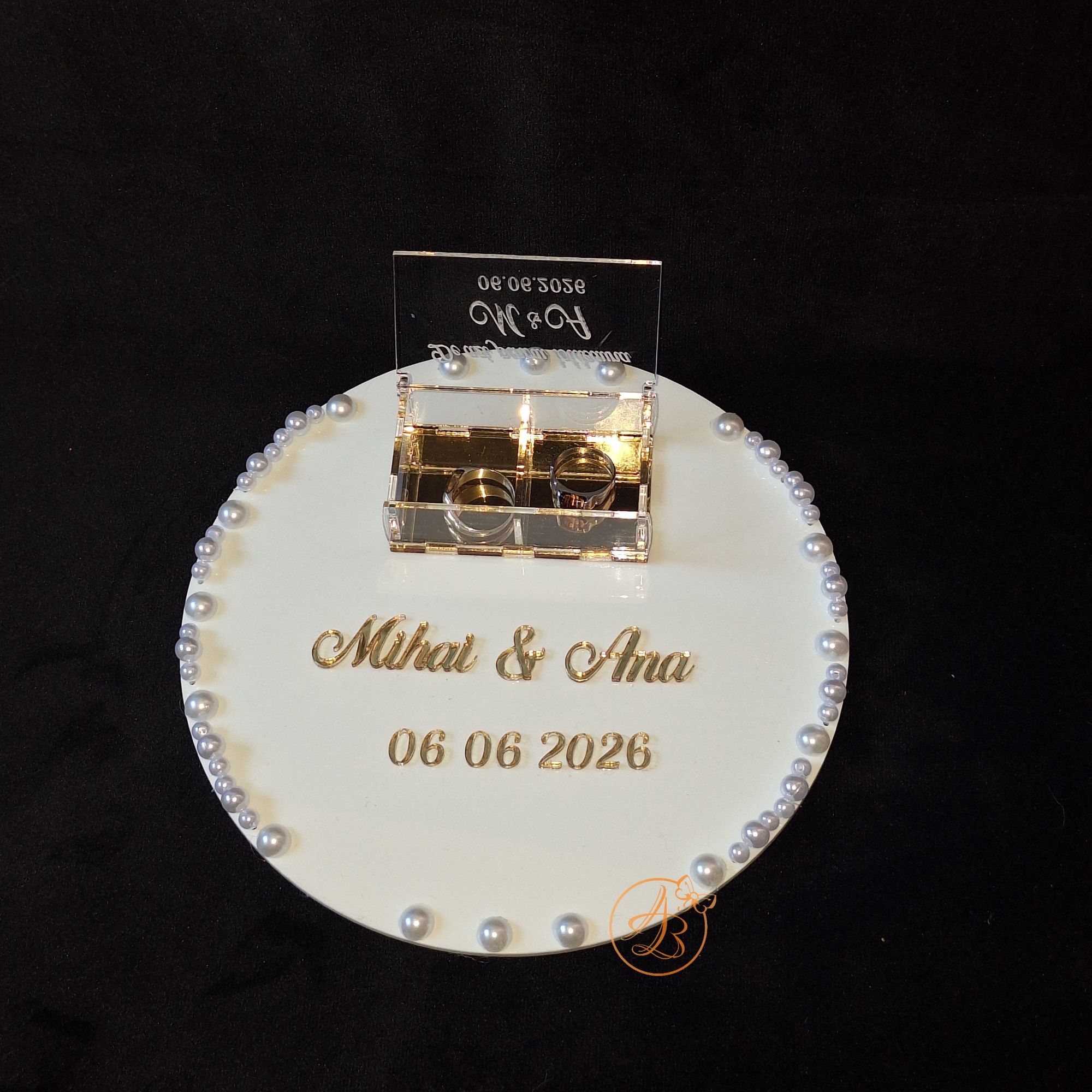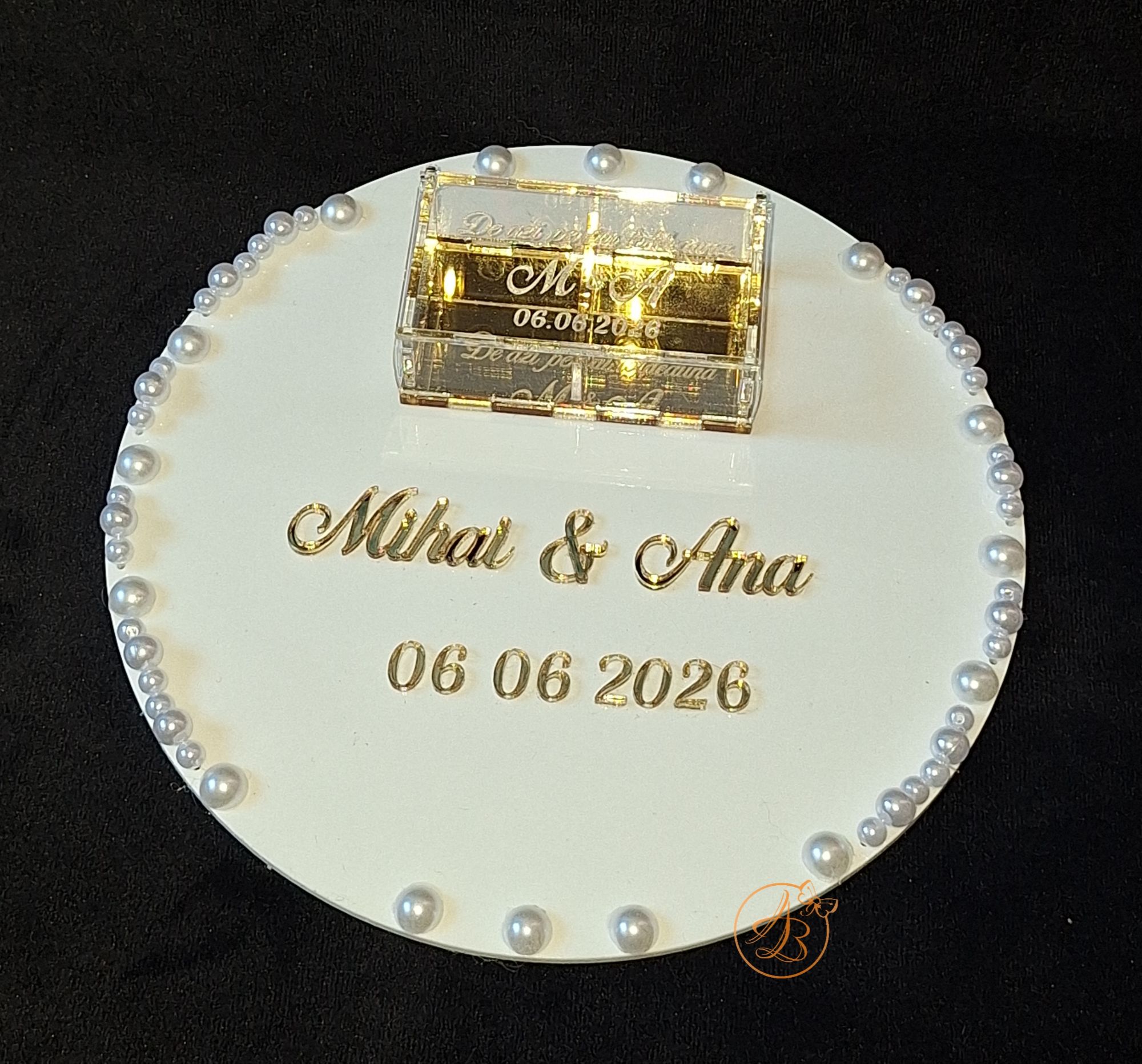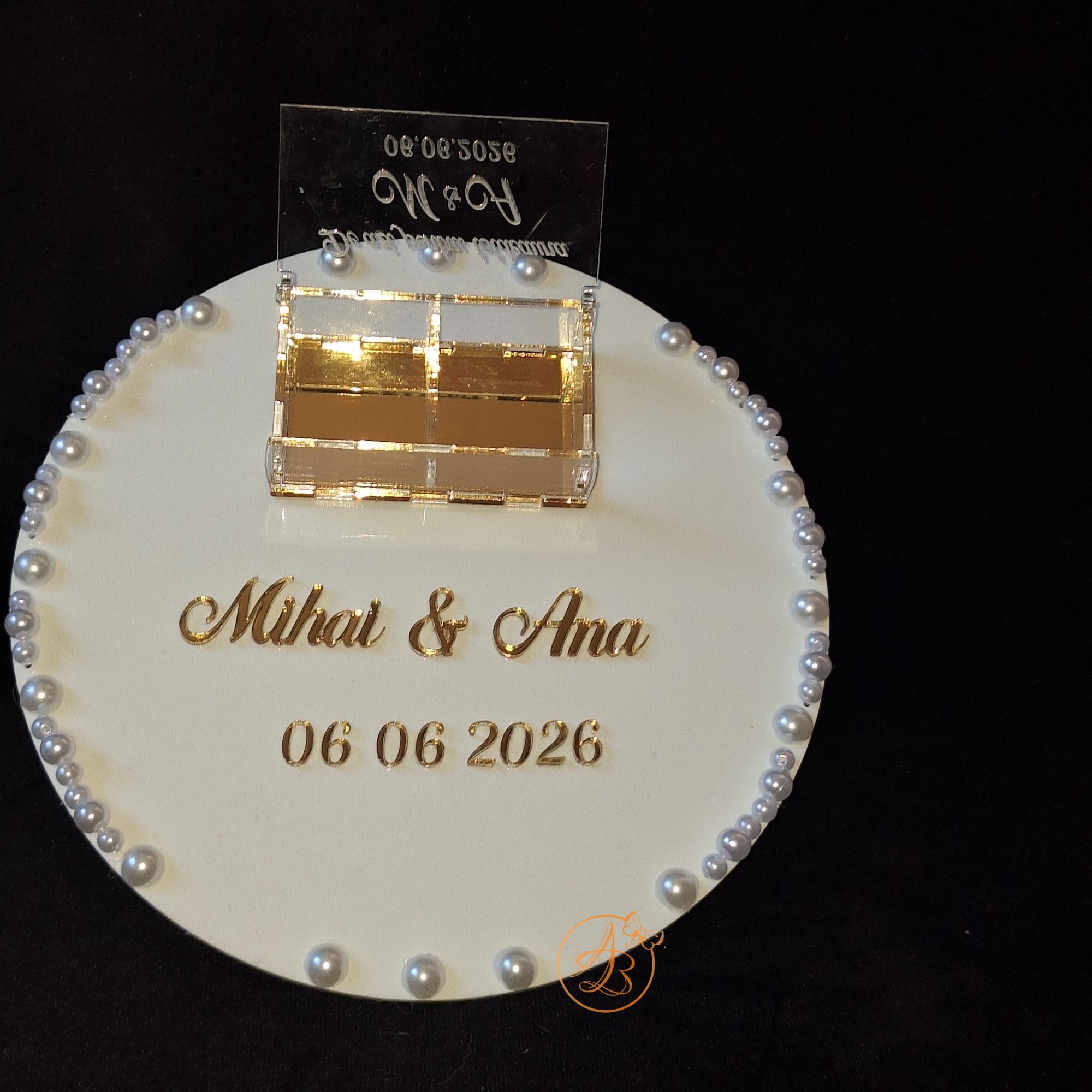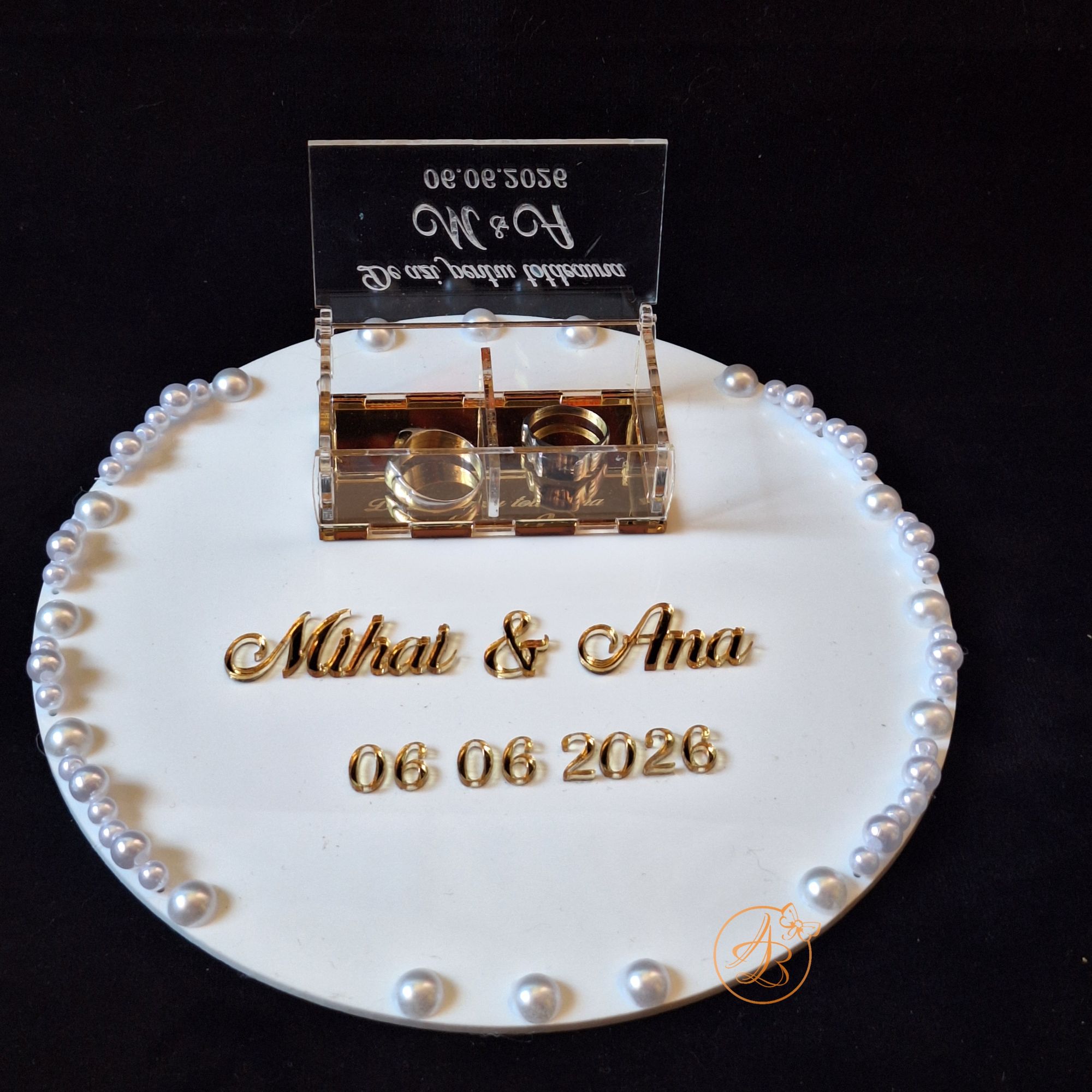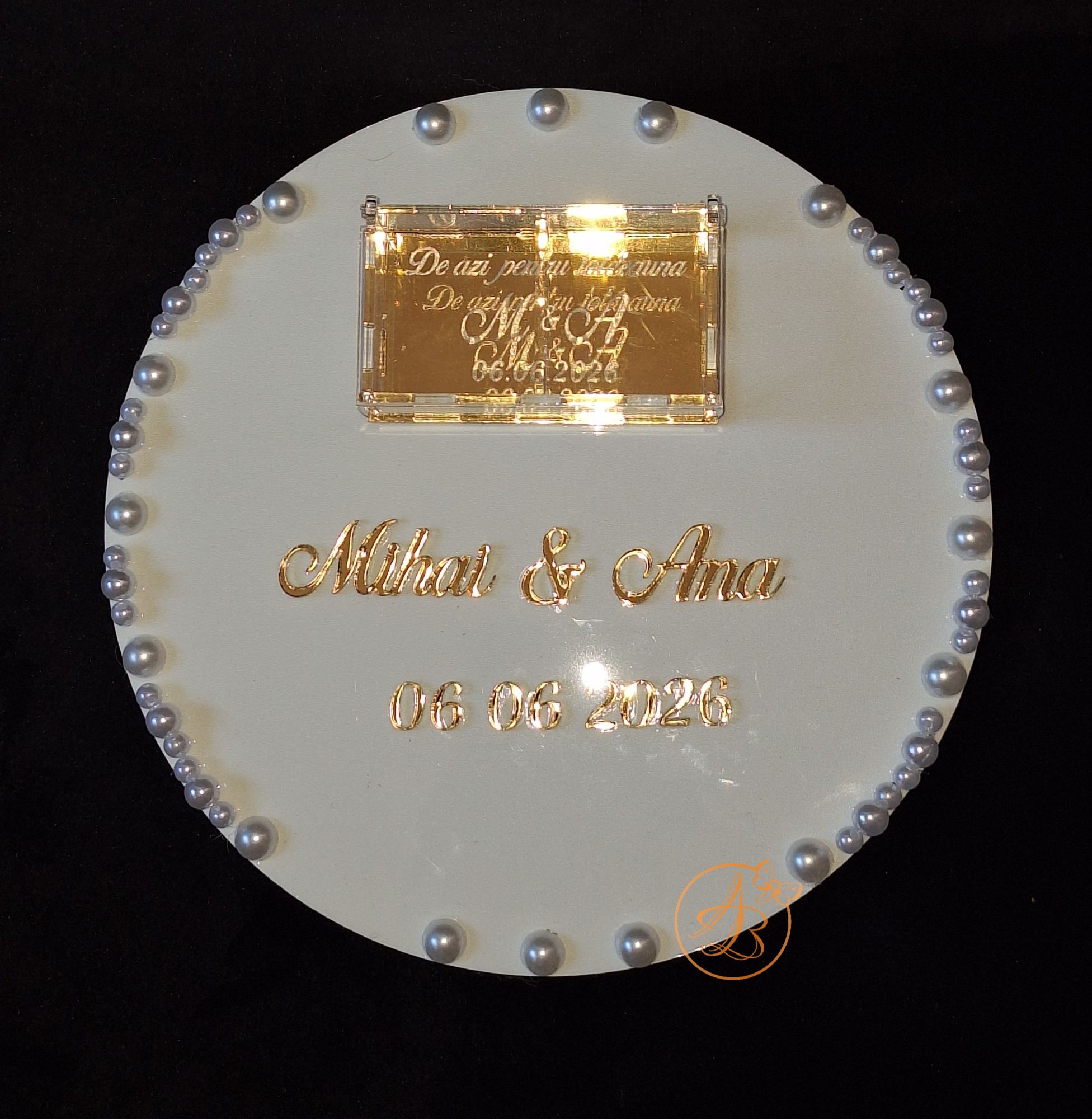 Suportul este decorat cu margele albe atasate bucata cu bucata, numele mirilor si data nuntii decupate din oglinda aurie.