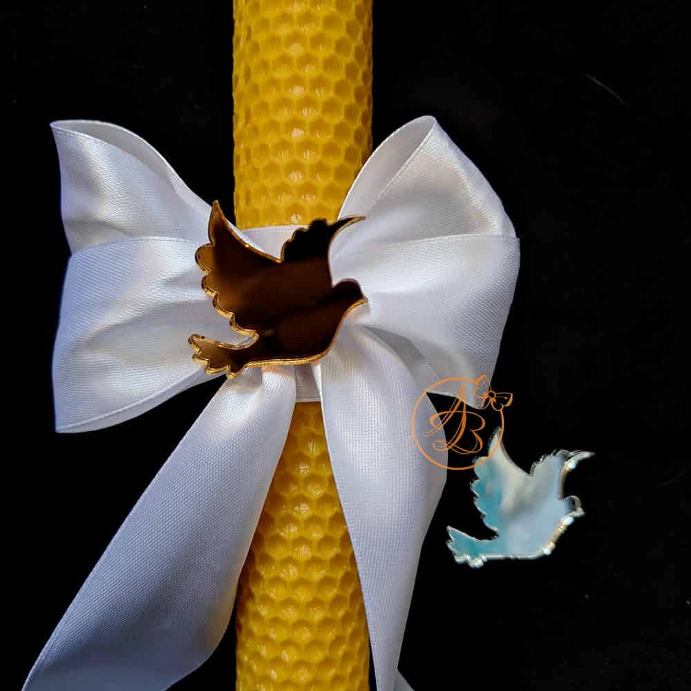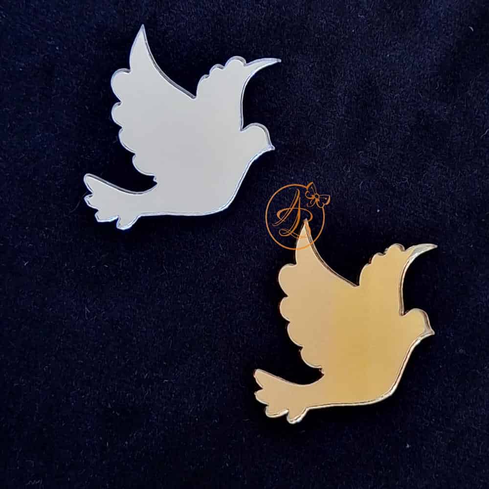 Porumbel decupat din oglinda aurie/argintie, sau plexiglass alb cu marime 50x35mm, ce se poate lipi pe lumanare, pe fundita, cosulet sau orice alt obiect.