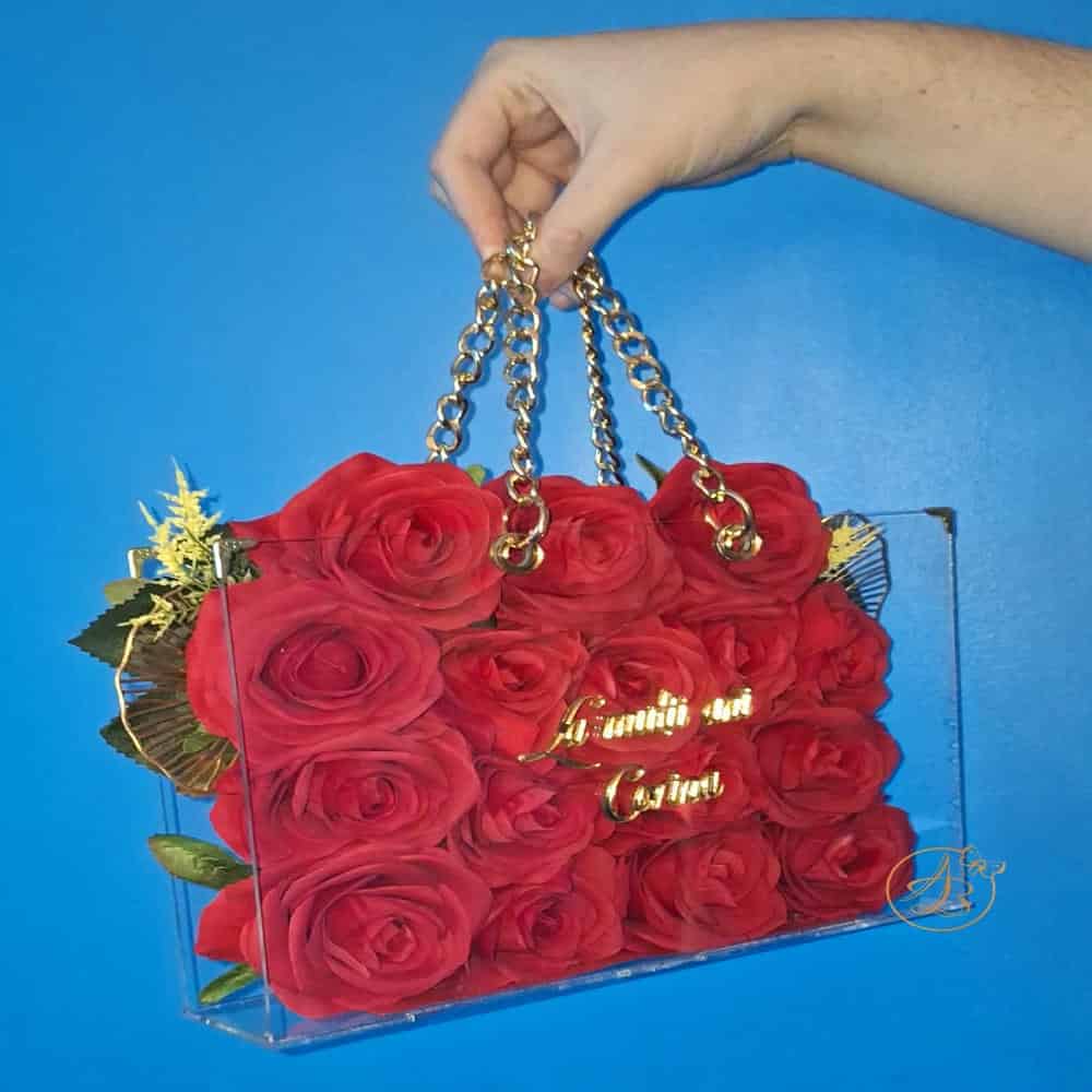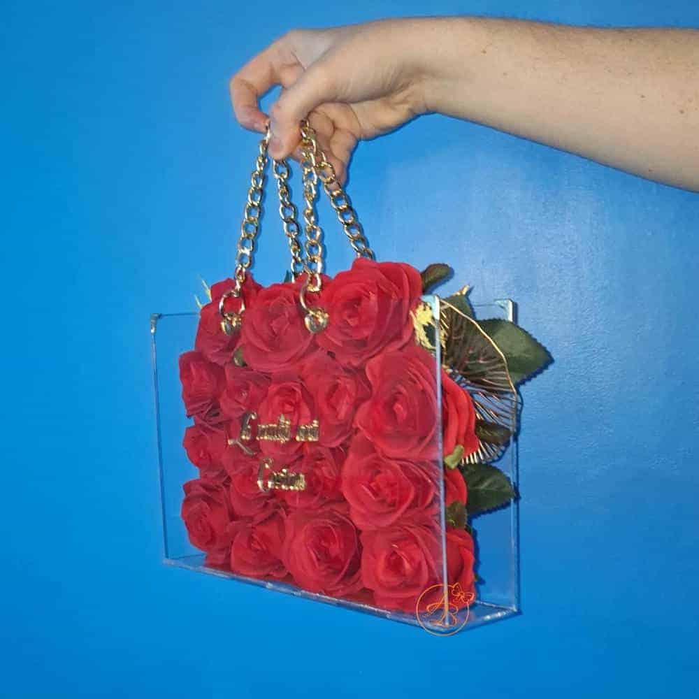In loc de buchet oferiti florile intr-o posetuta eleganta, realizata din plexiglass transparent, cu maner din lantisor auriu.