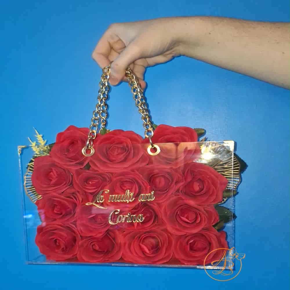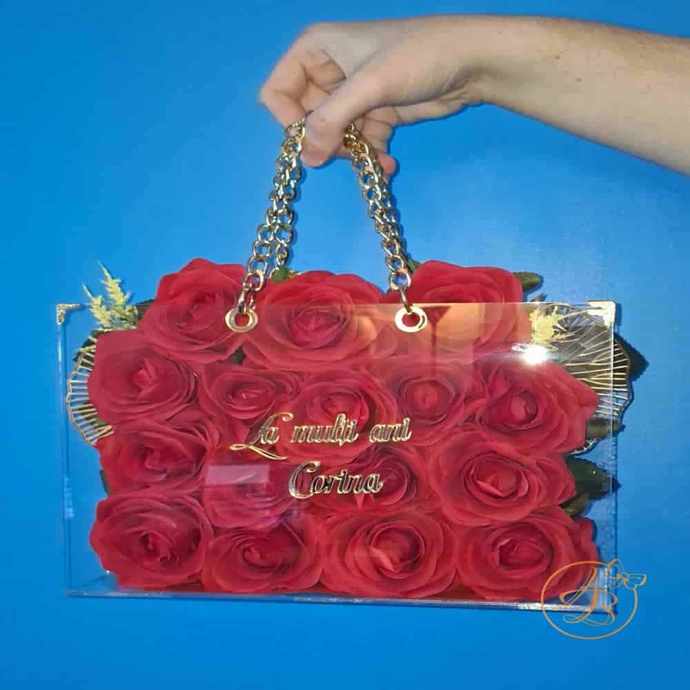 Pretul se refera la 1 posetuta plexiglass 30x20x7cm, personalizata cu text la alegere, cu trandafiri artificiali.