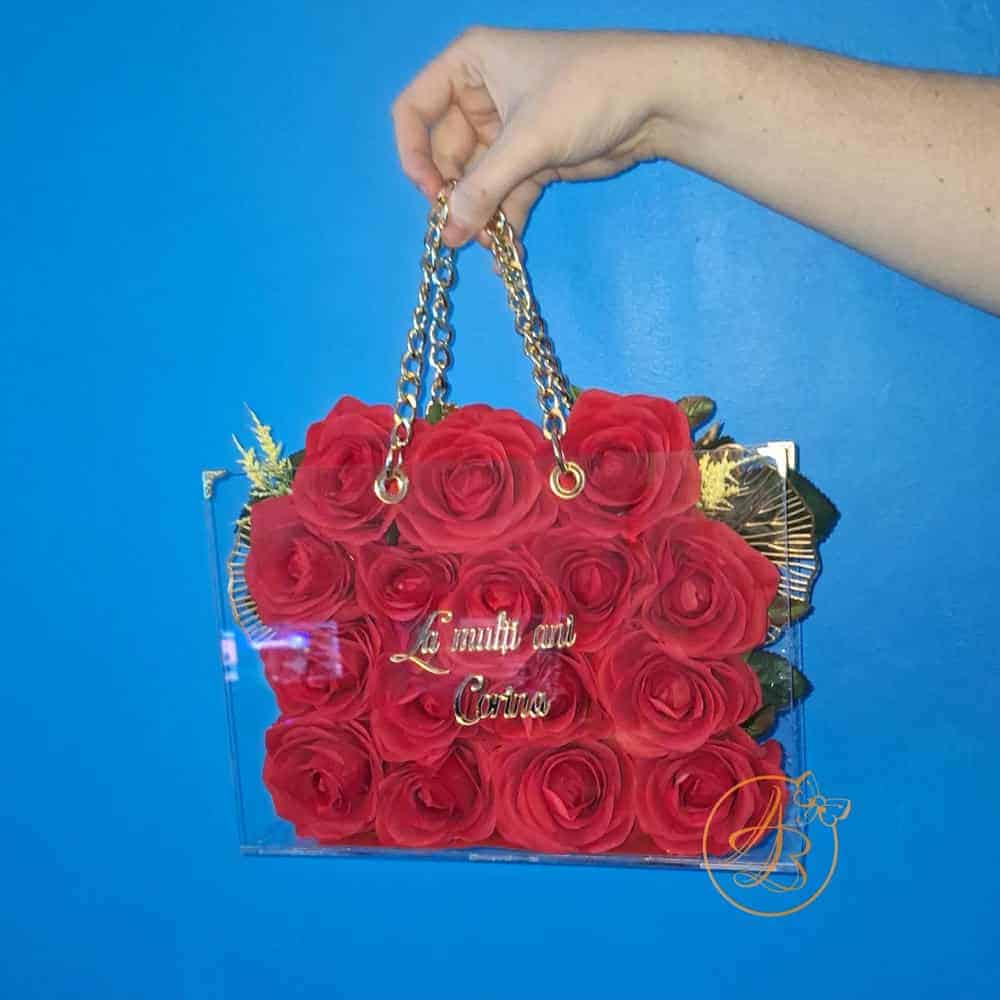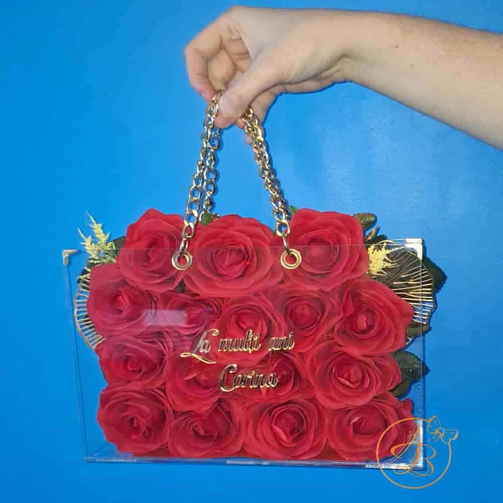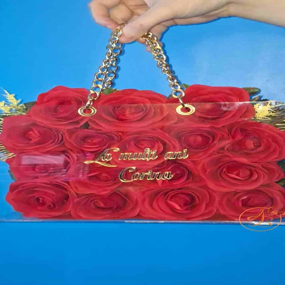 Poseta din plexiglass transparent cu maner auriu si trandafiri artificiali