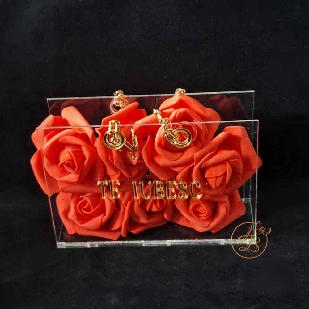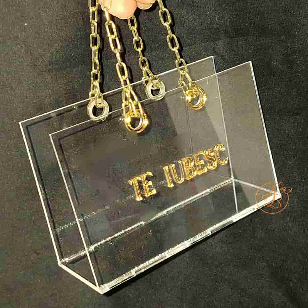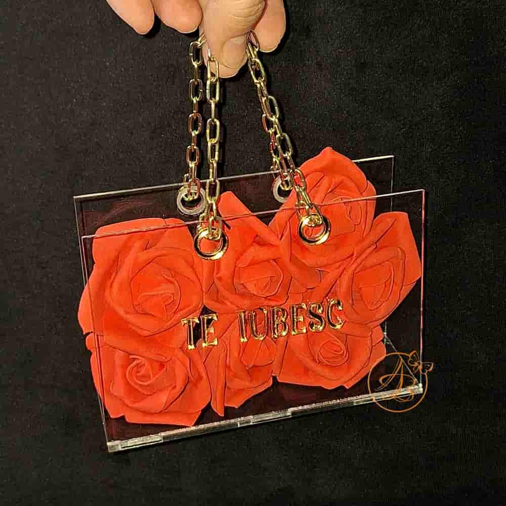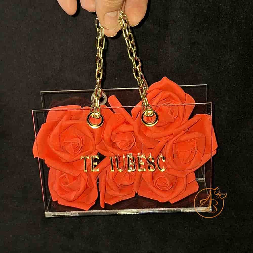 In loc de buchet oferiti florile intr-o posetuta eleganta, realizata din plexiglass transparent, cu maner lantisor auriu.