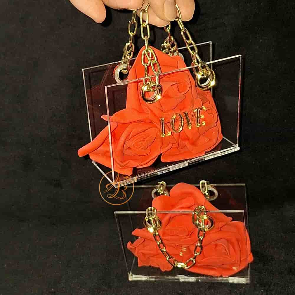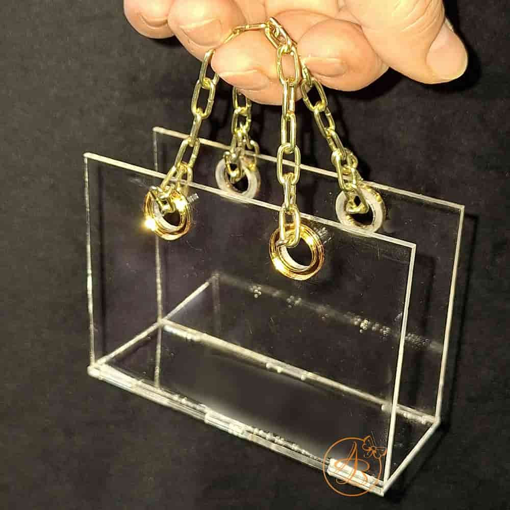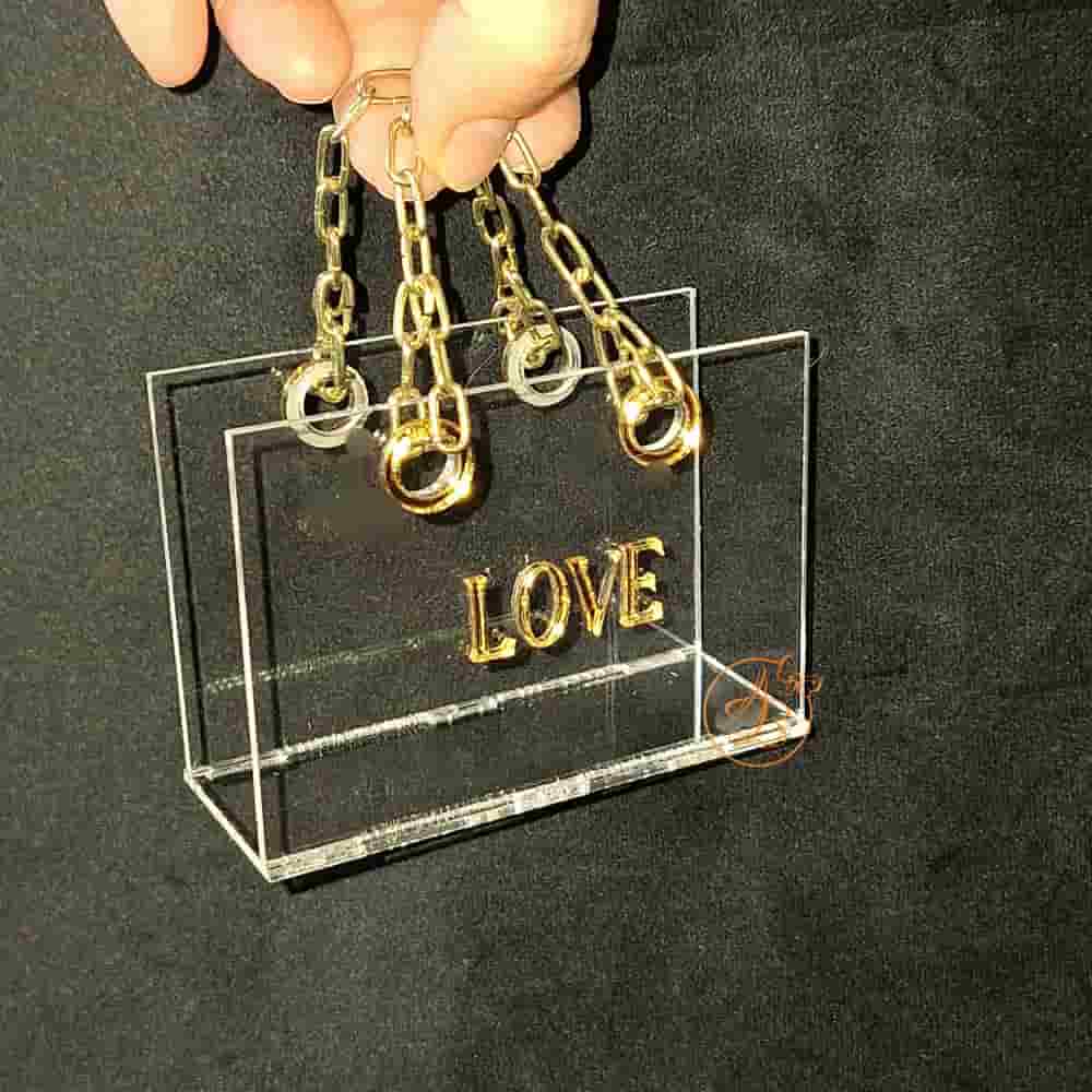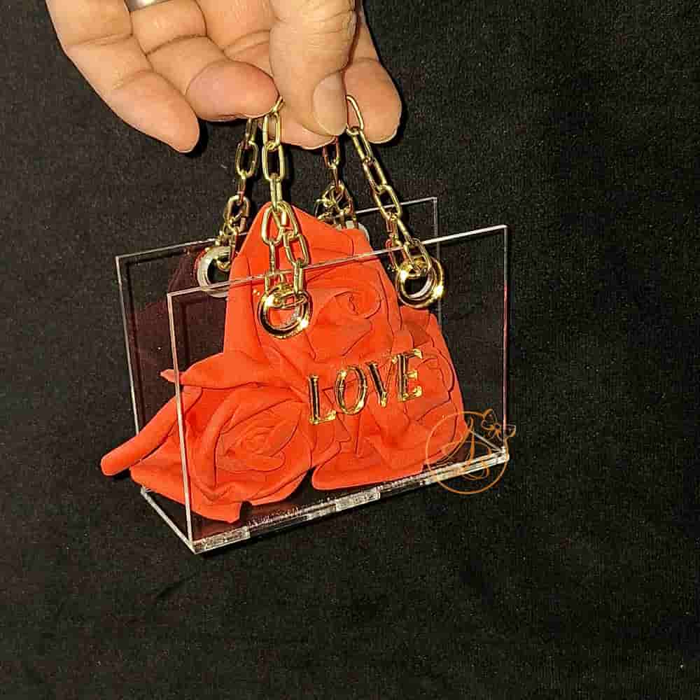 In loc de buchet oferiti florile intr-o posetuta eleganta, realizata din plexiglass transparent, cu maner lantisor auriu.