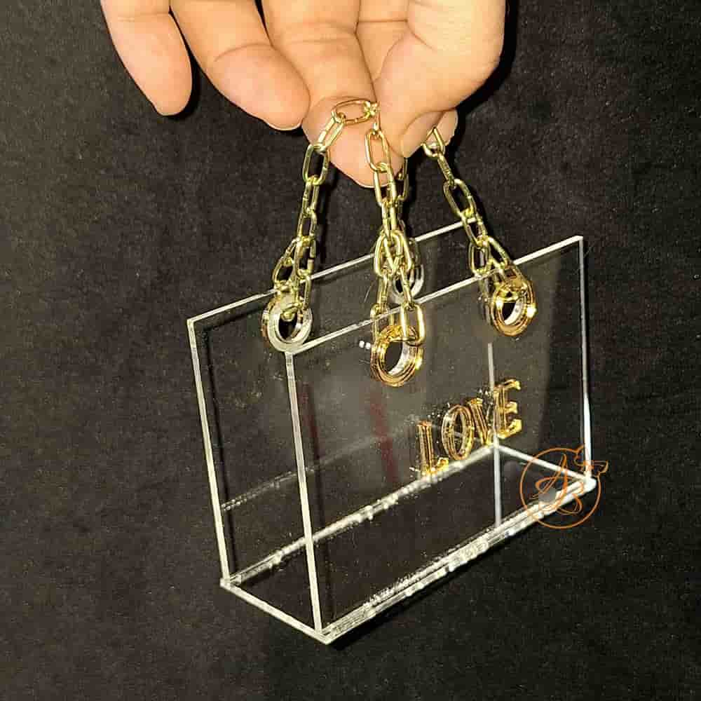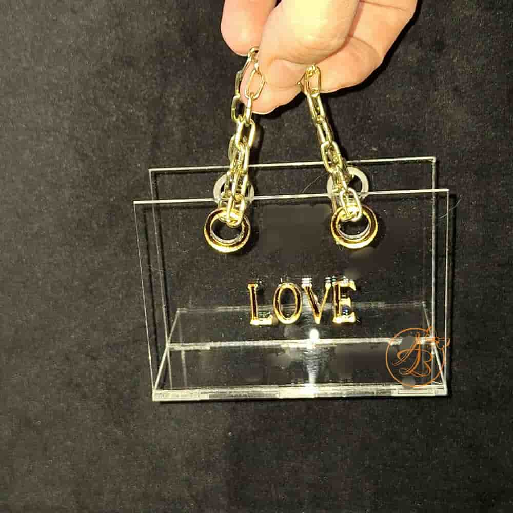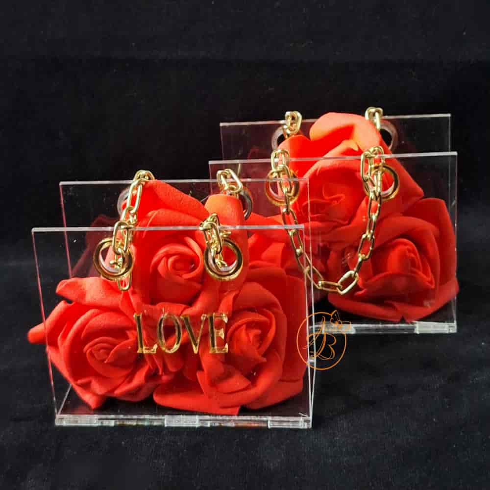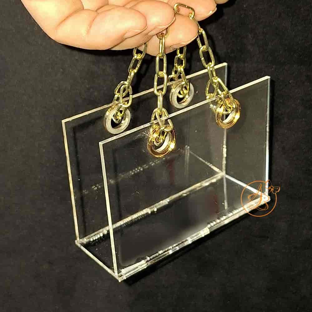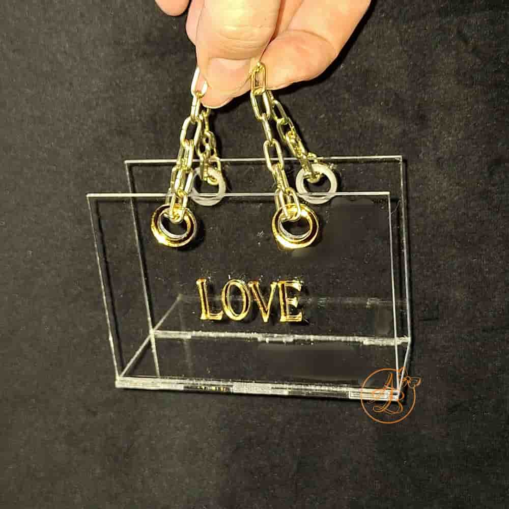 In loc de buchet oferiti florile intr-o posetuta eleganta, realizata din plexiglass transparent, cu maner lantisor auriu.