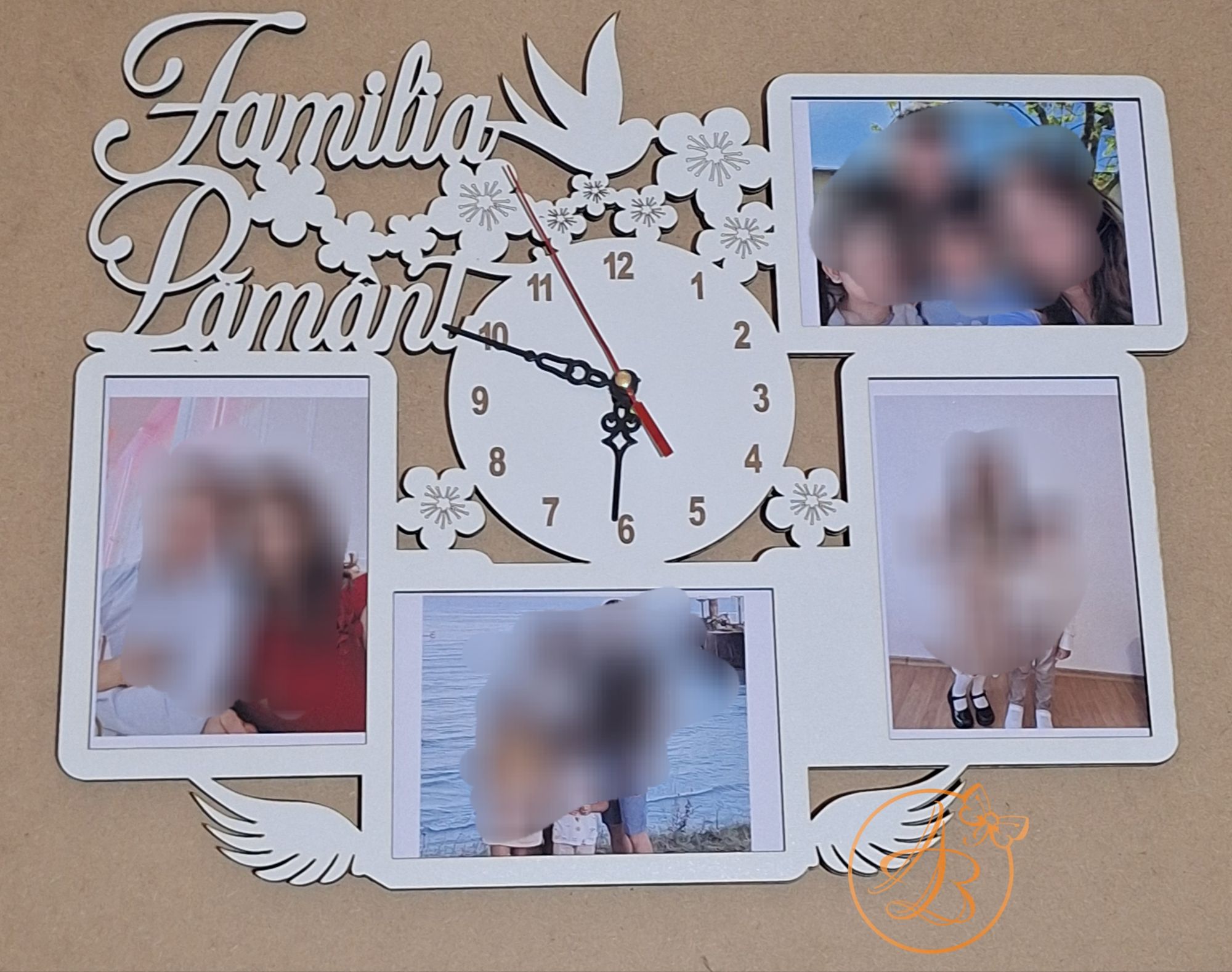 Ceas elegant cu 4 poze 9x13cm, si numele familiei – cadoul ideal pentru zi de nastere, aniversare, sau orice alt eveniment, ocazie.