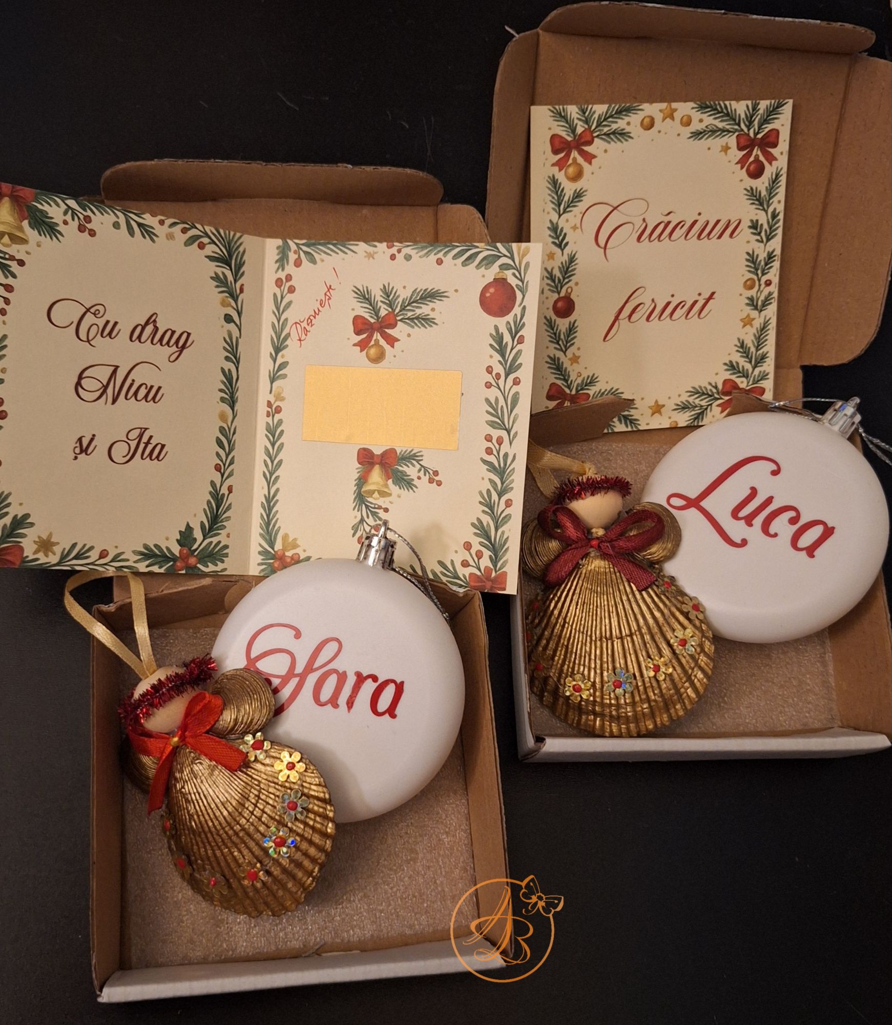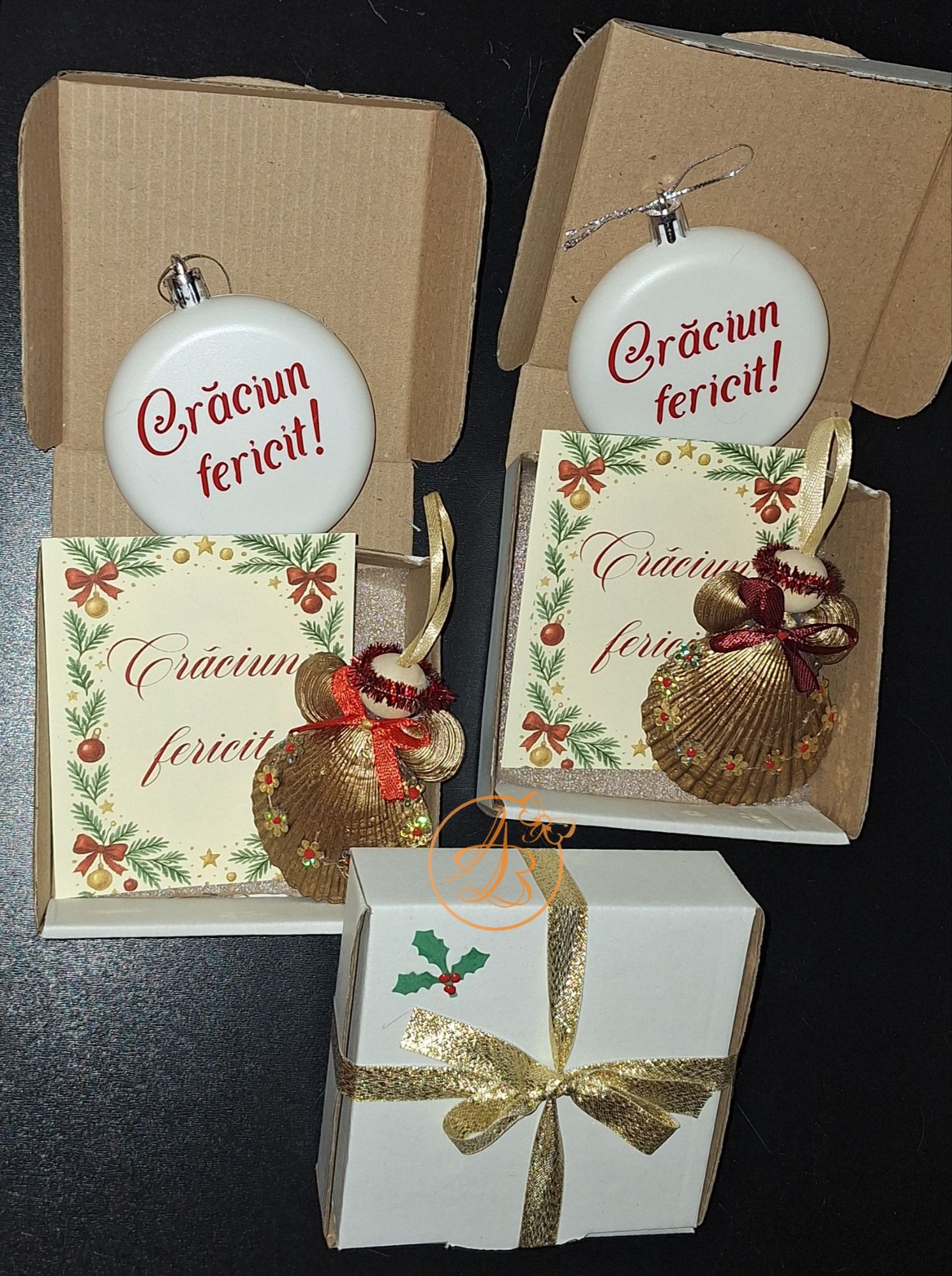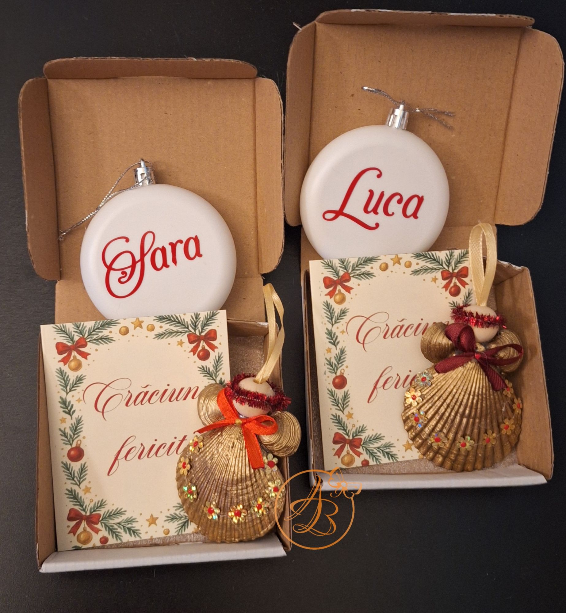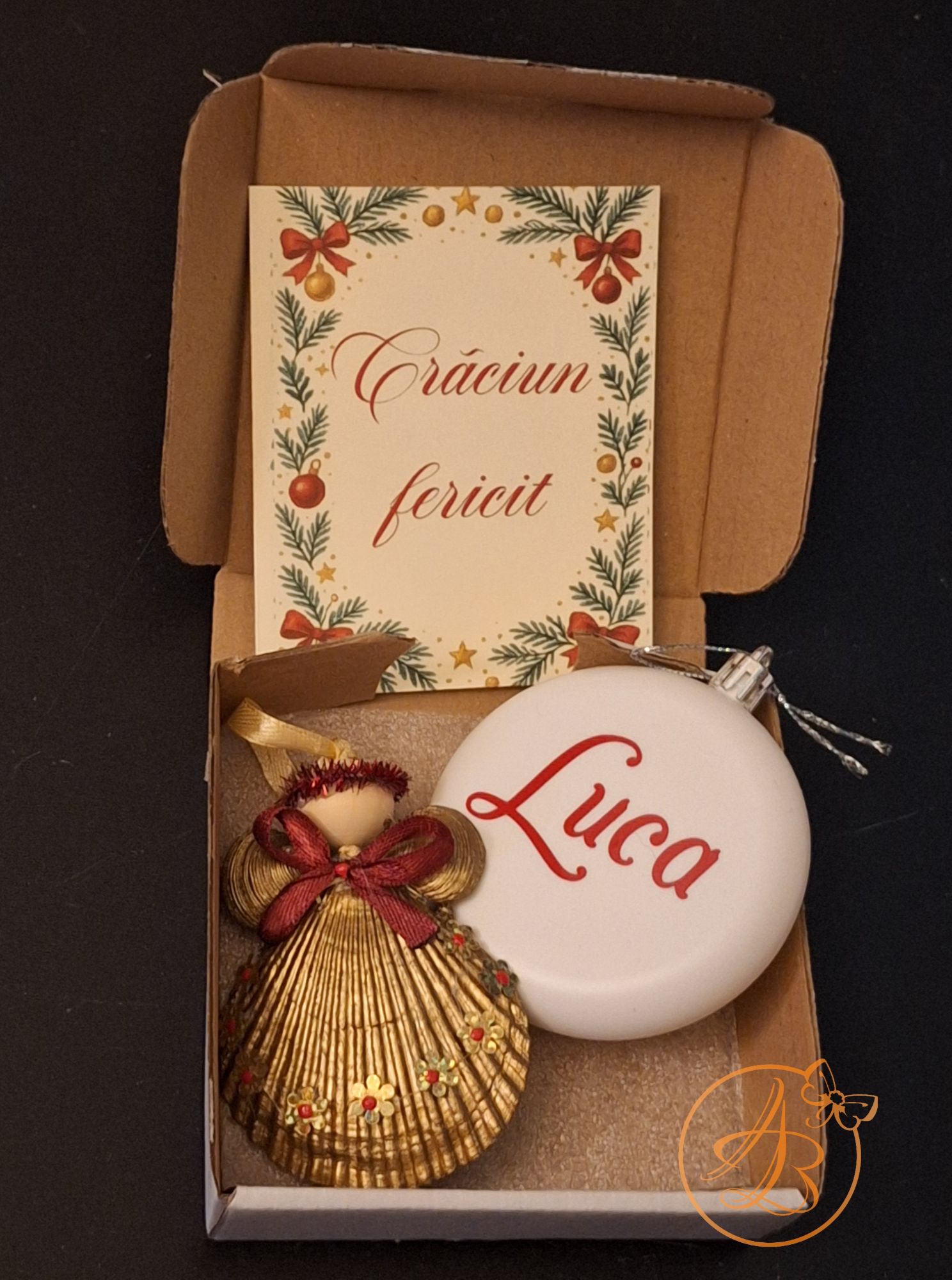 Set Craciun ce contine ingeras din scoica, glob personalizat fata verso si o felicitare, cu um mesaj ascuns sub folie razuibila.