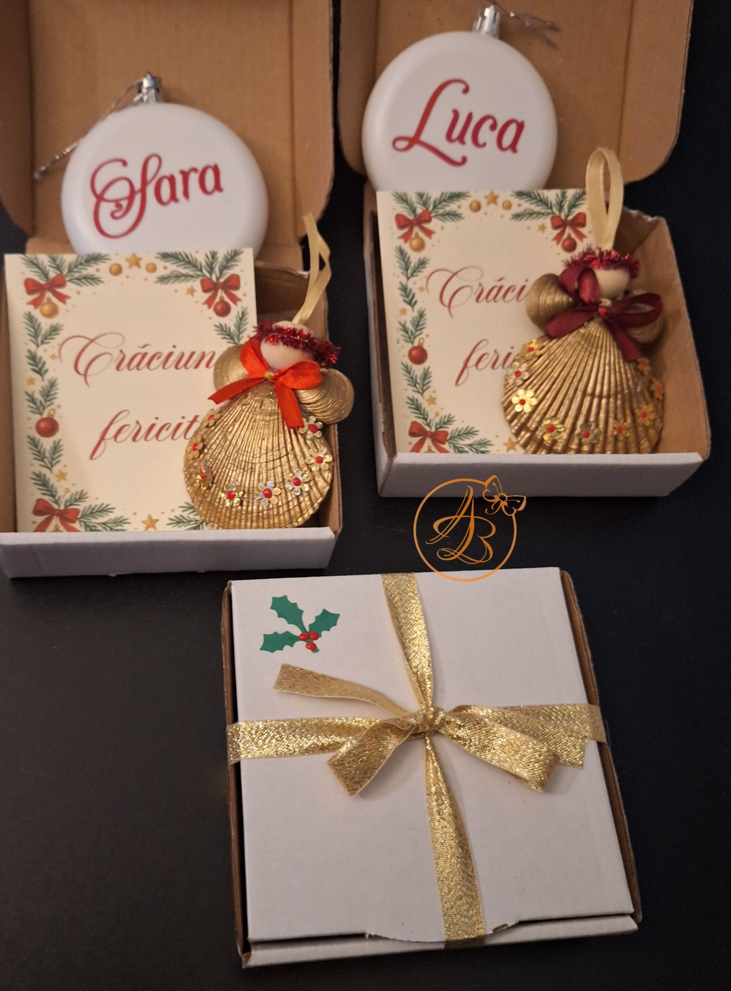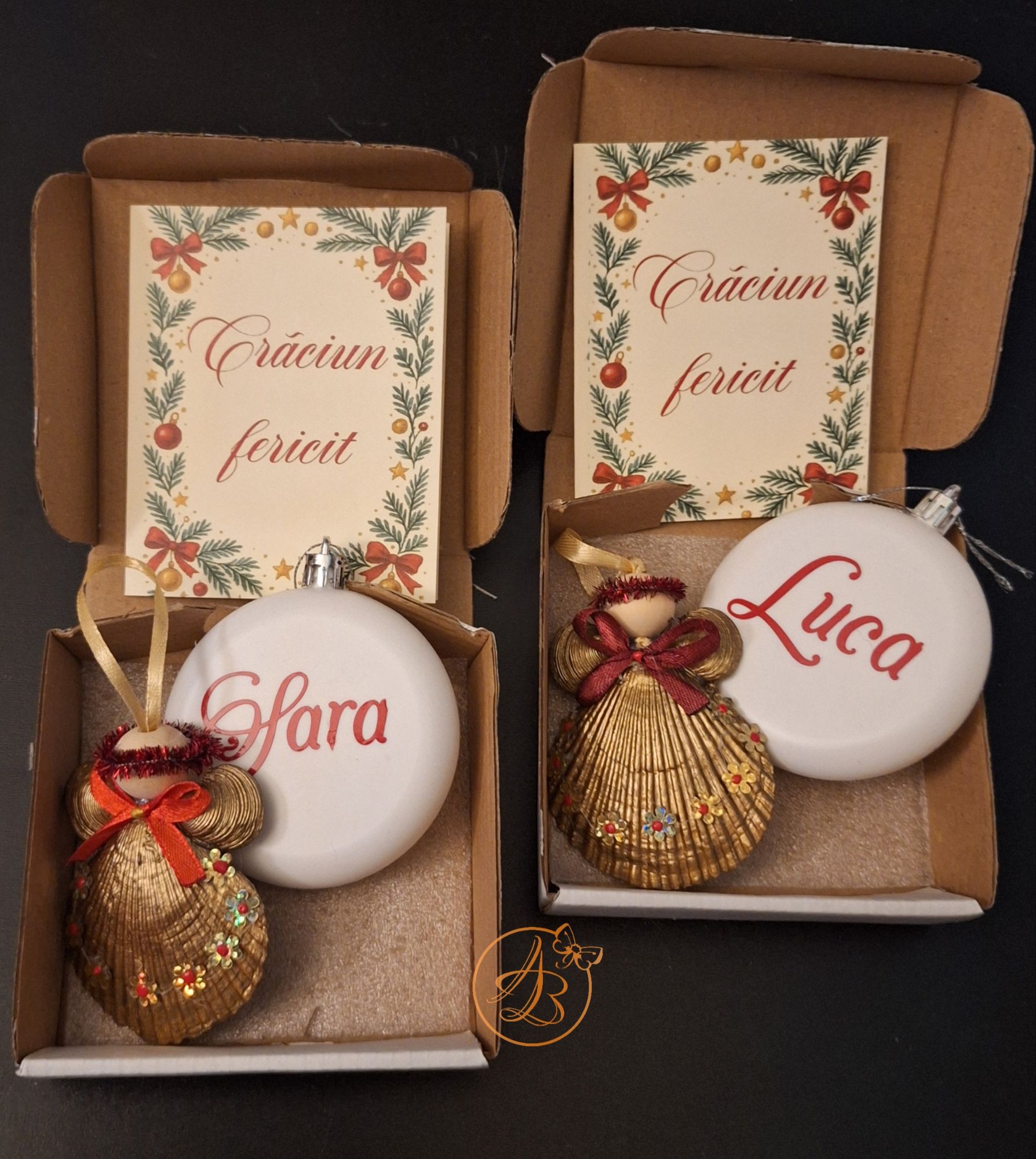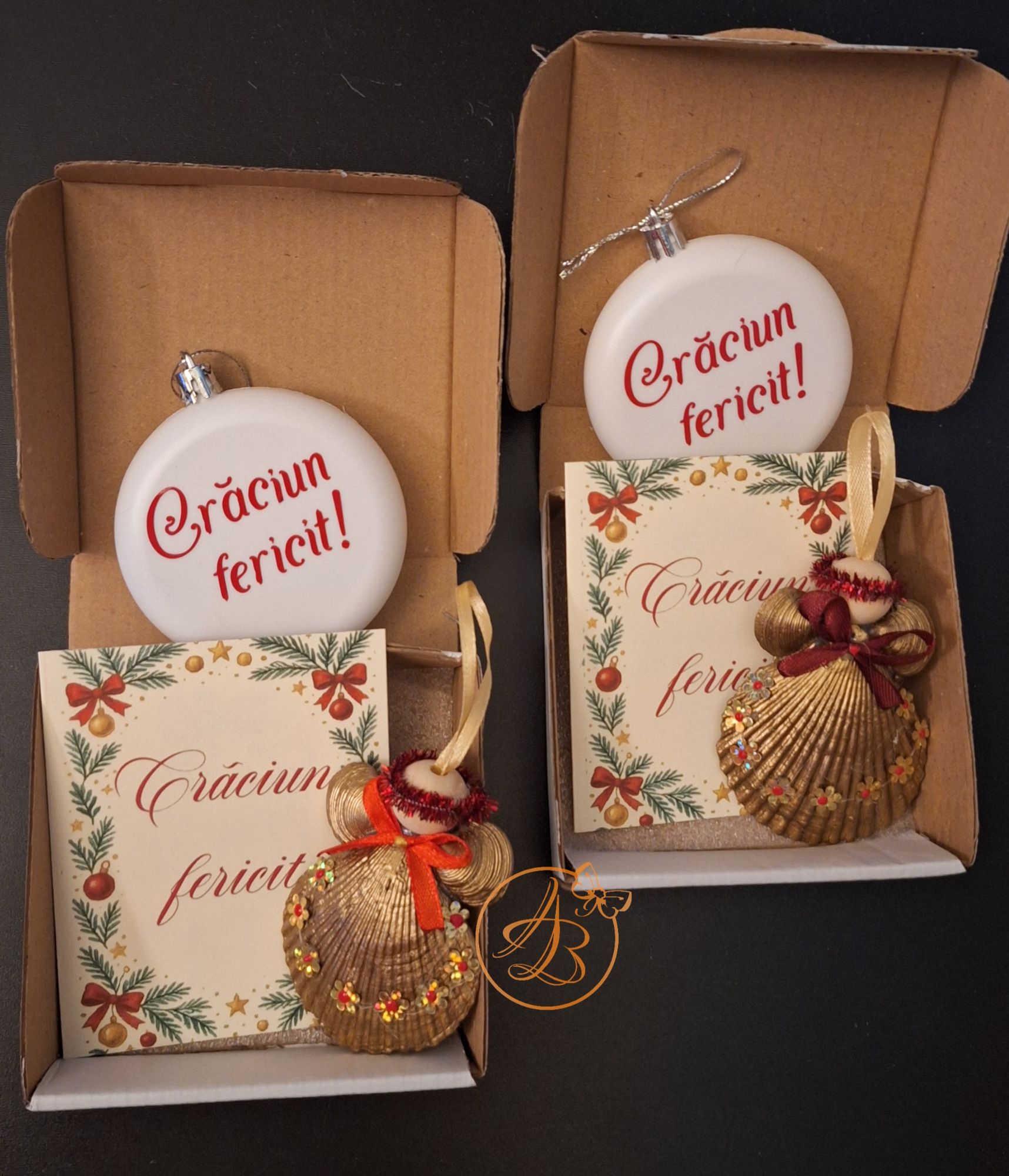 Set Craciun ce contine ingeras din scoica, glob personalizat fata verso si o felicitare, cu um mesaj ascuns sub folie razuibila.