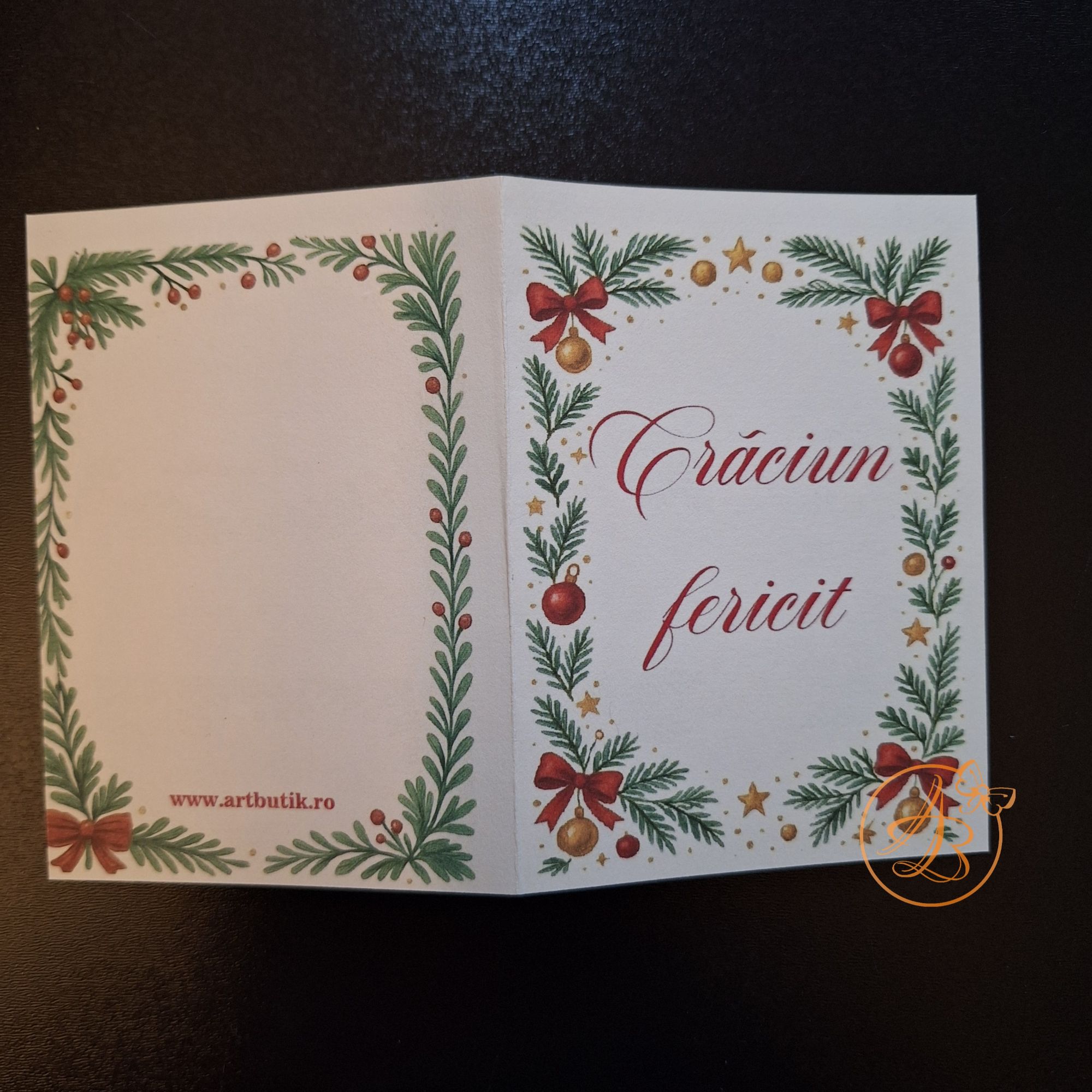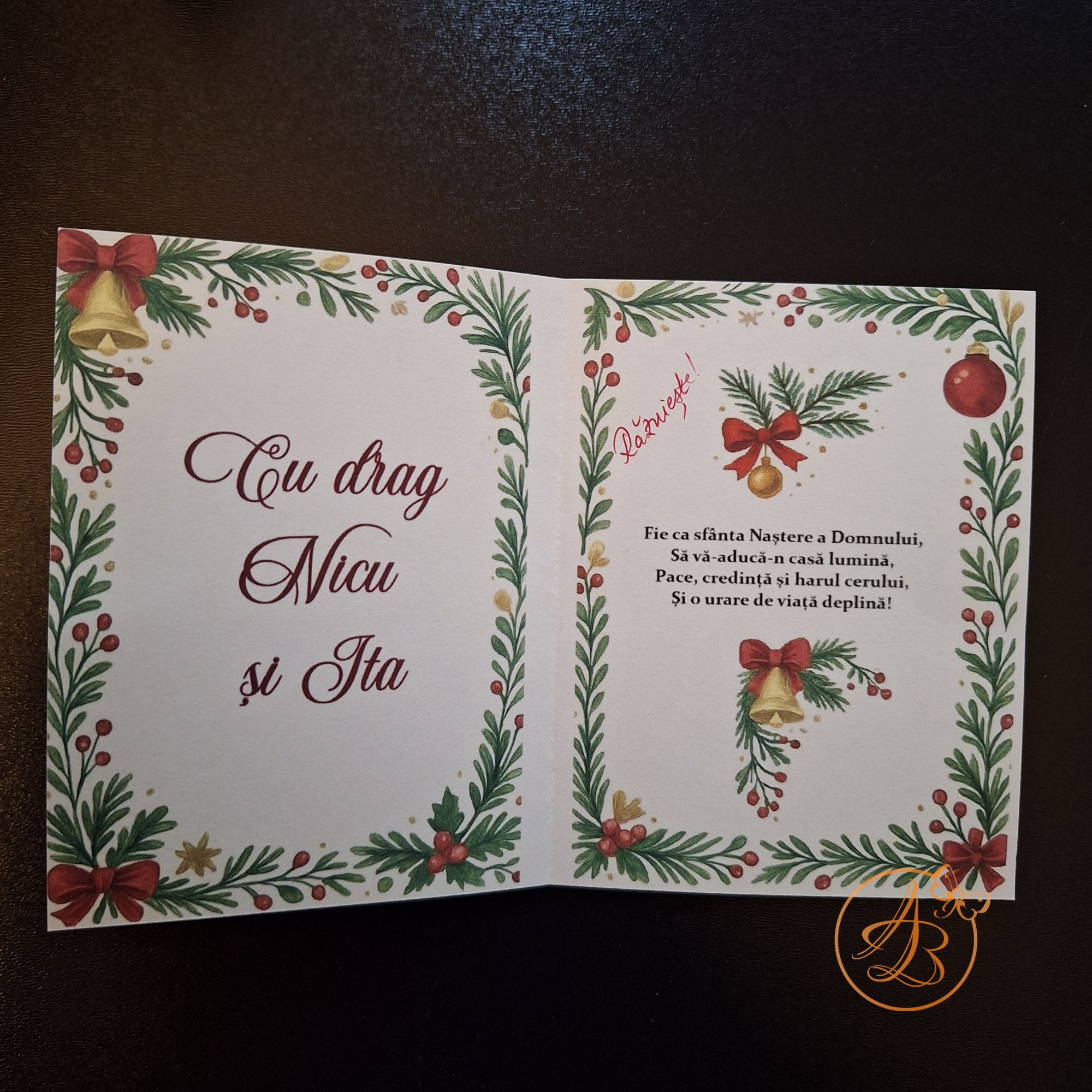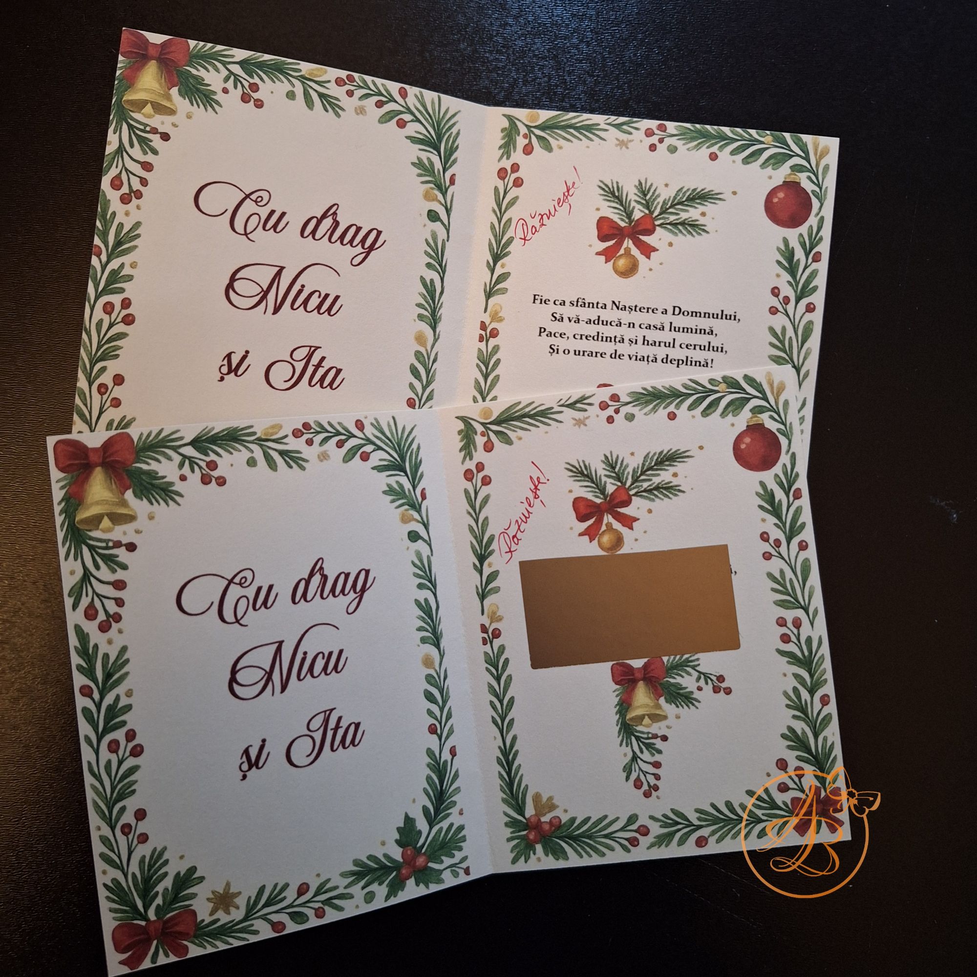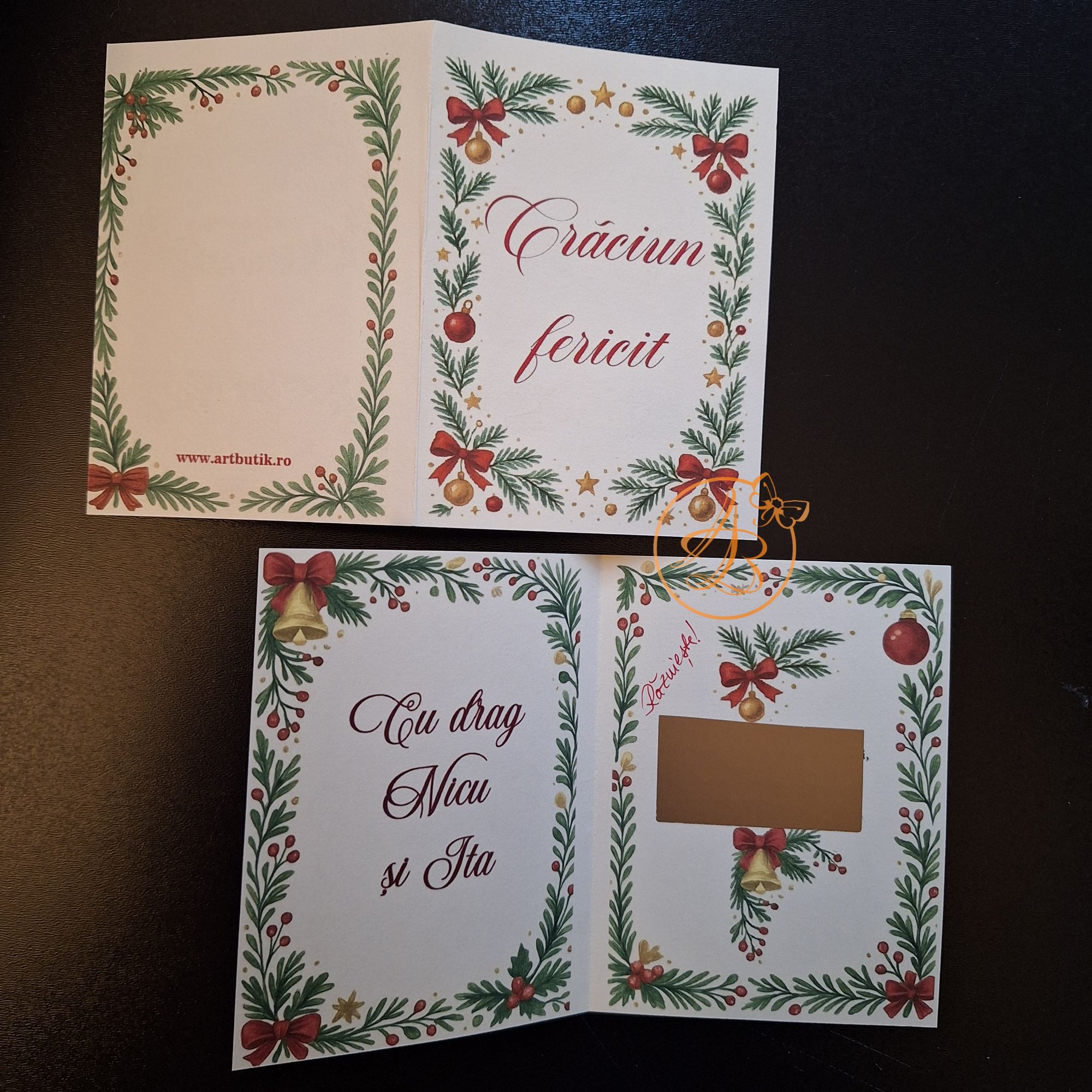 Set Craciun ce contine ingeras din scoica, glob personalizat fata verso si o felicitare, cu um mesaj ascuns sub folie razuibila.