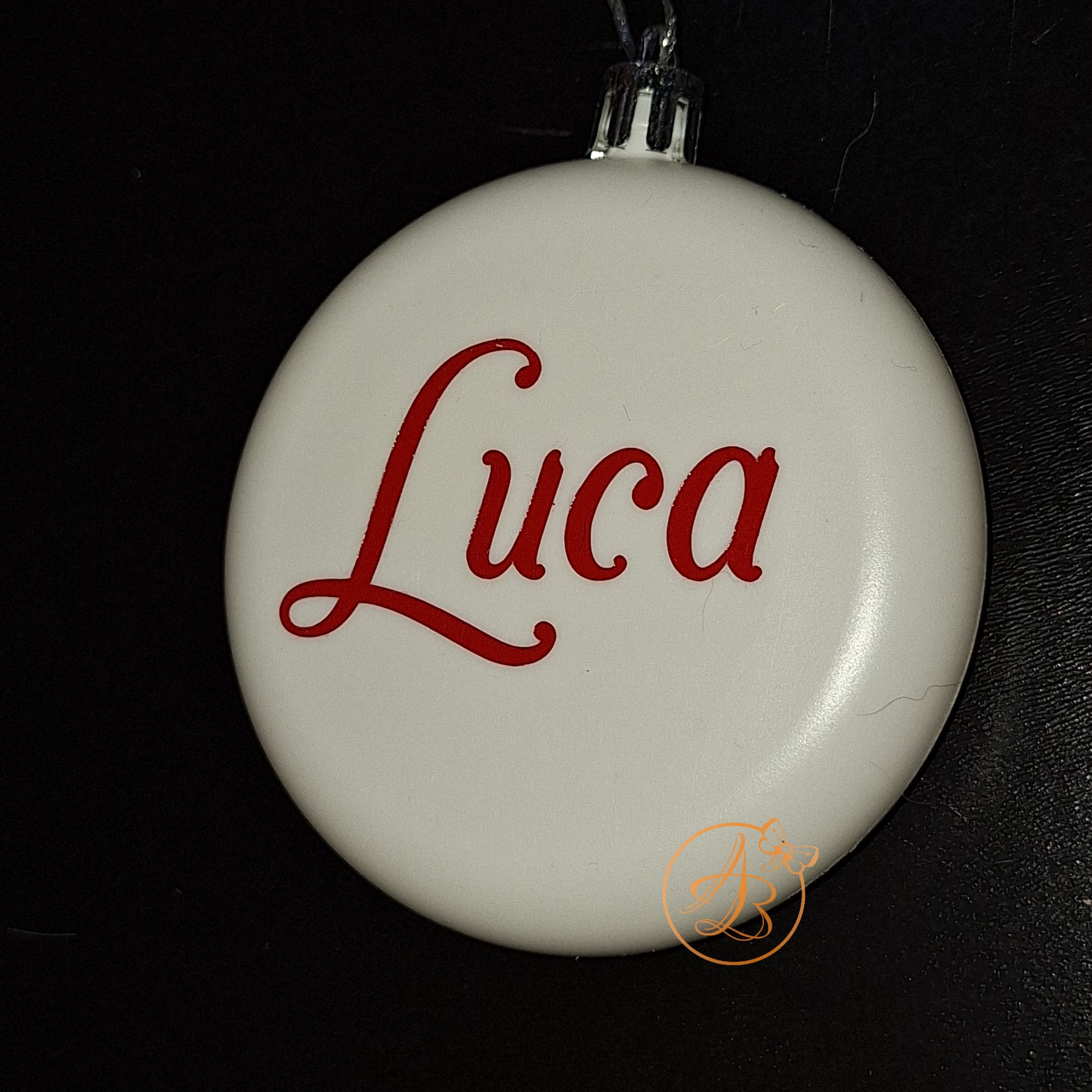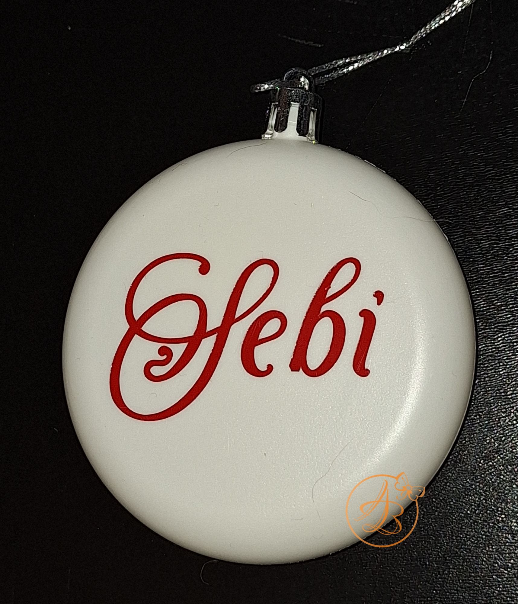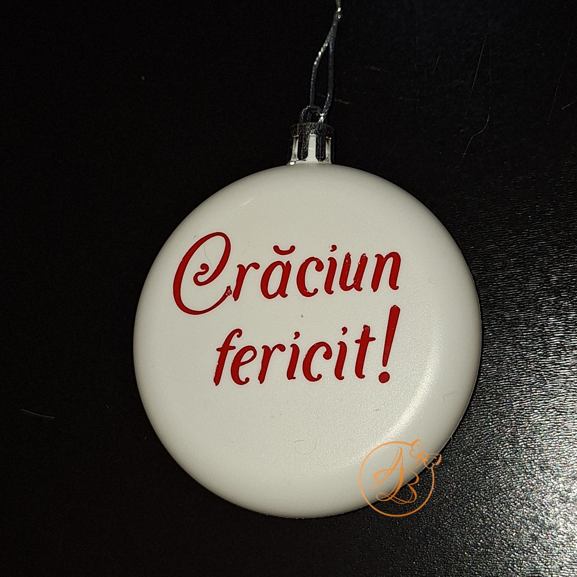 Glob alb din plastic, cu diametrul de 8cm, personalizat cu nume pe o parte, si mesajul Craciun fericit pe cealalta parte.