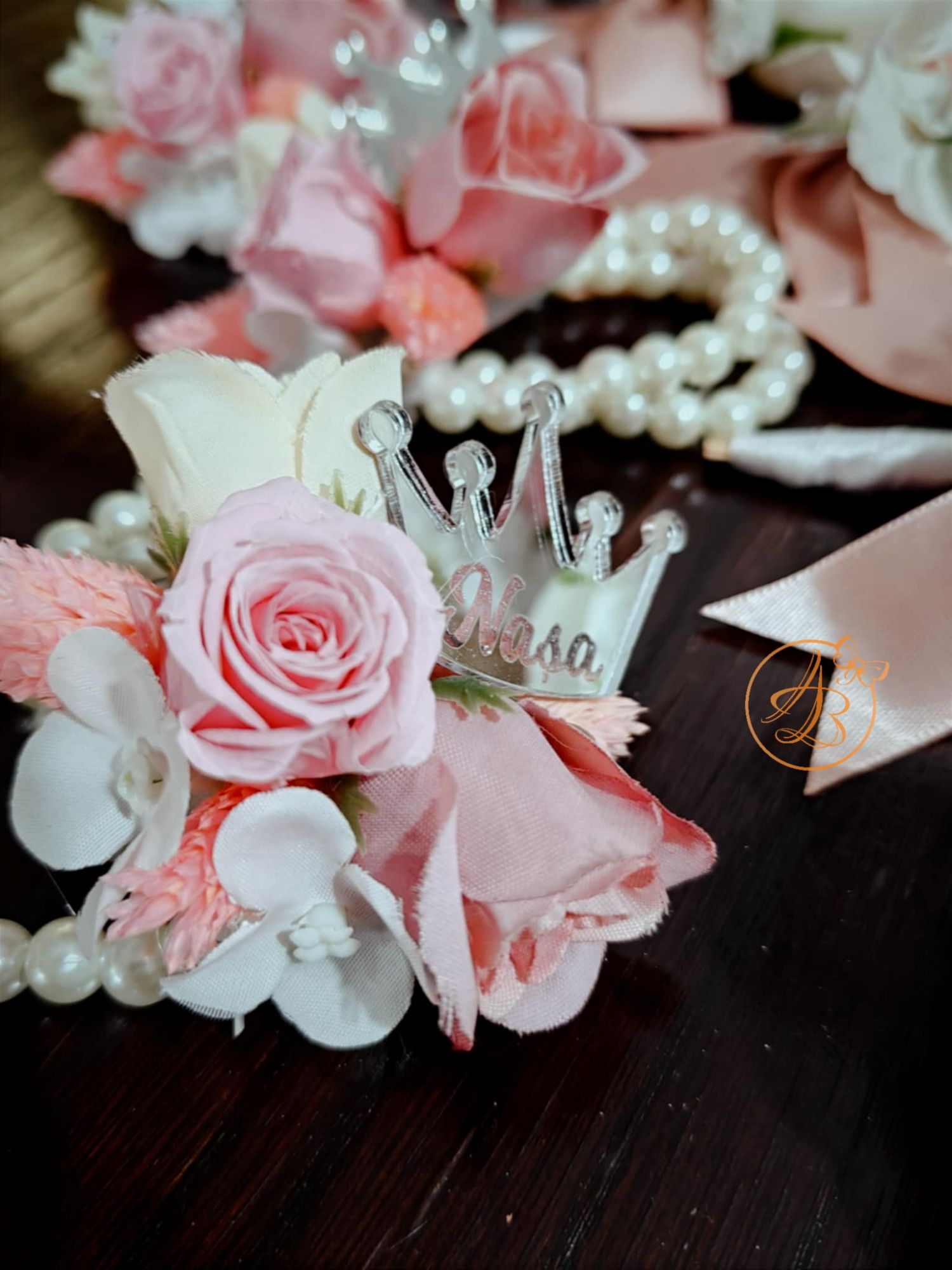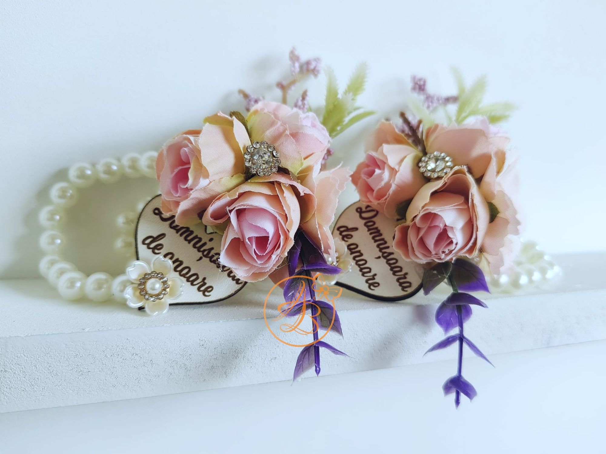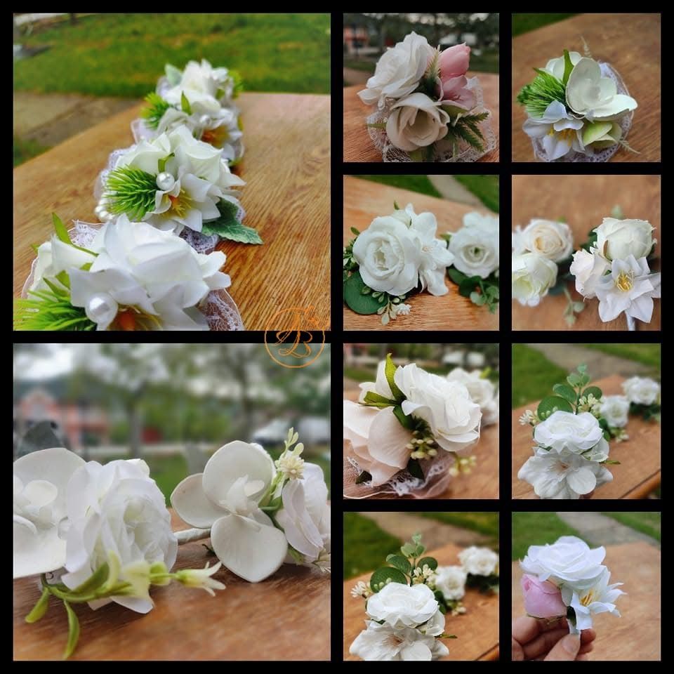 Bratari cu margele si cocarde (struturi) decorate cu flori artificiale, in culoarea alb, roz si verdeata.