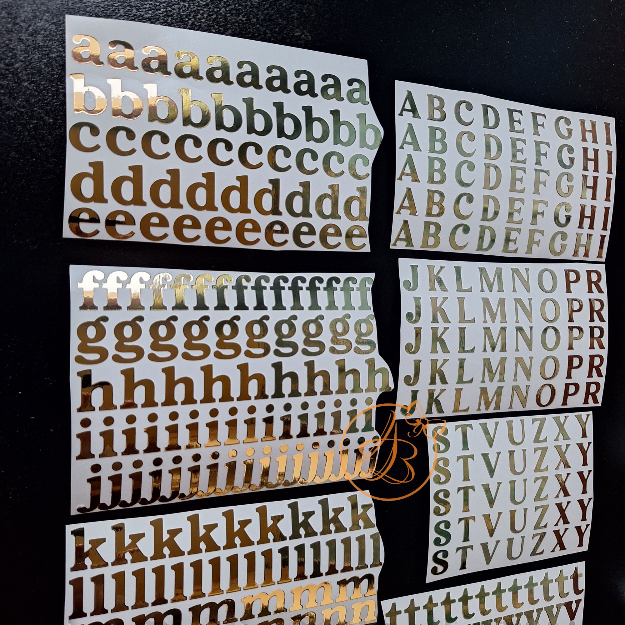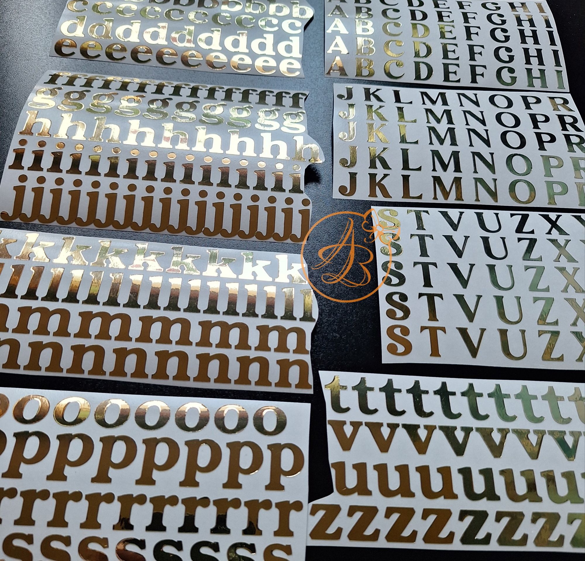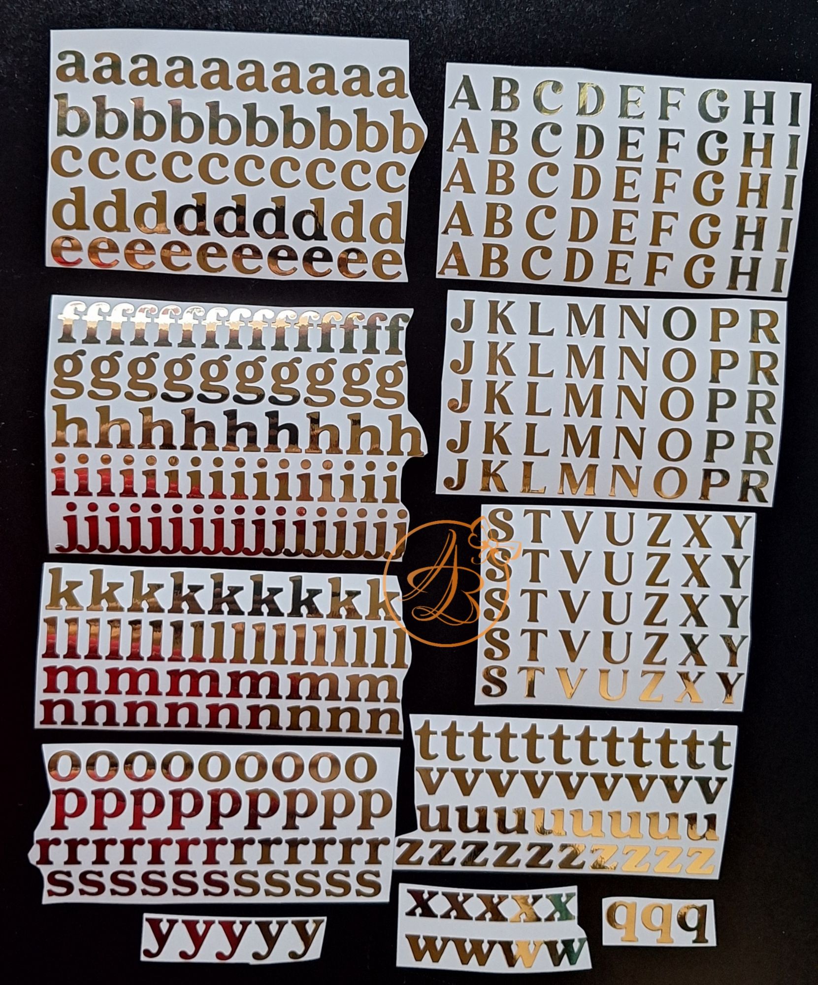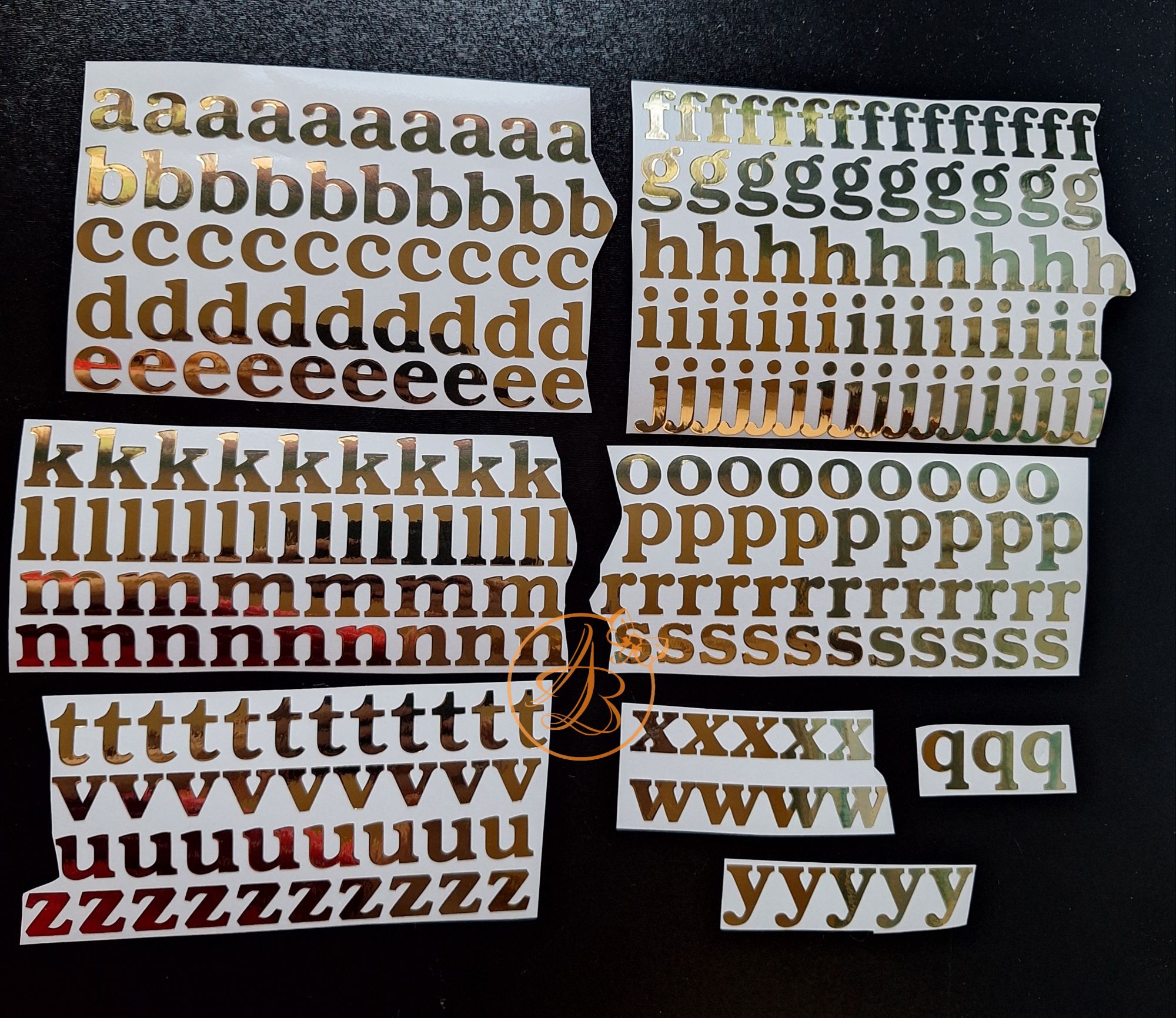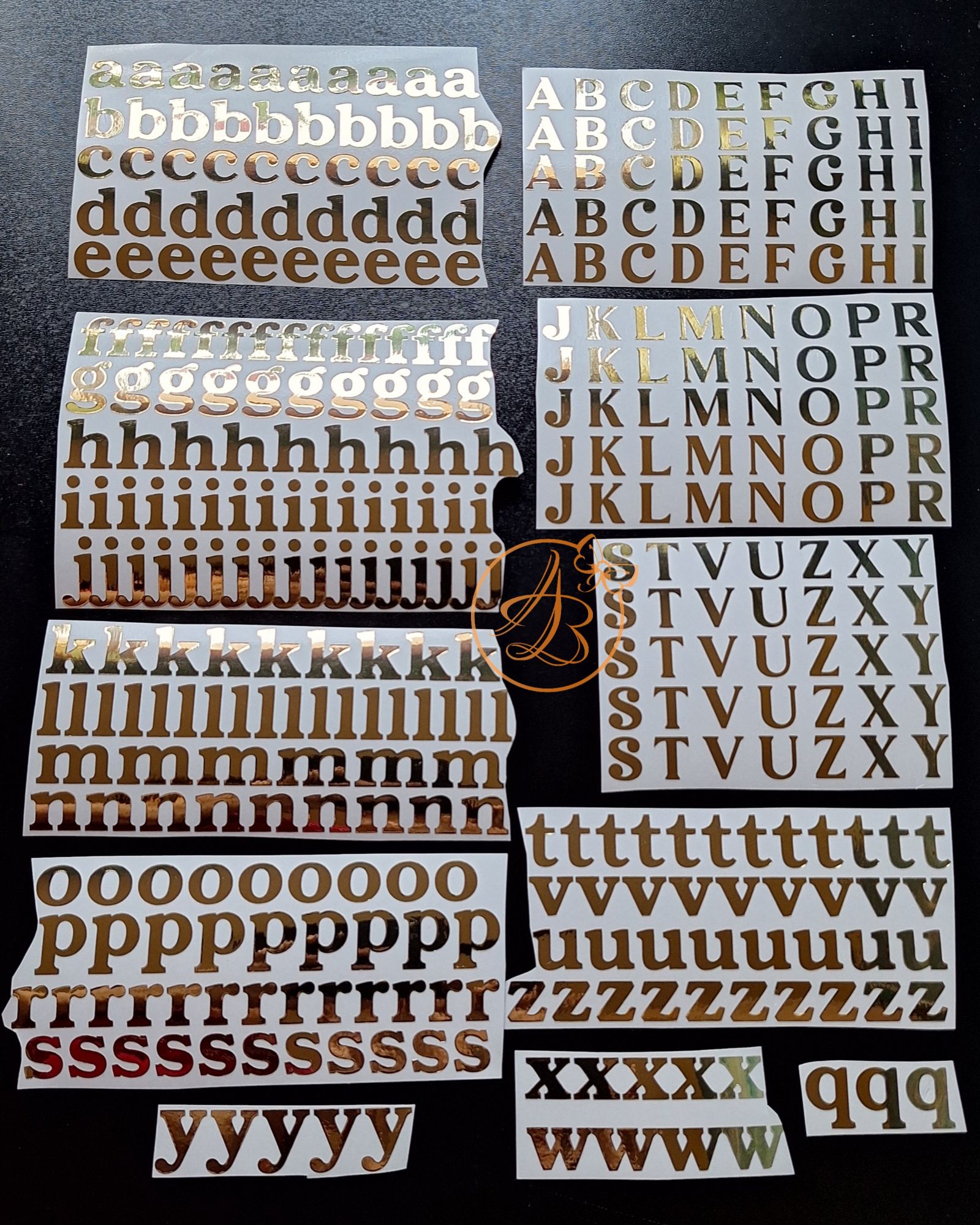 Sticker auriu tip oglinda, cu litere dec tipar mari si mici.