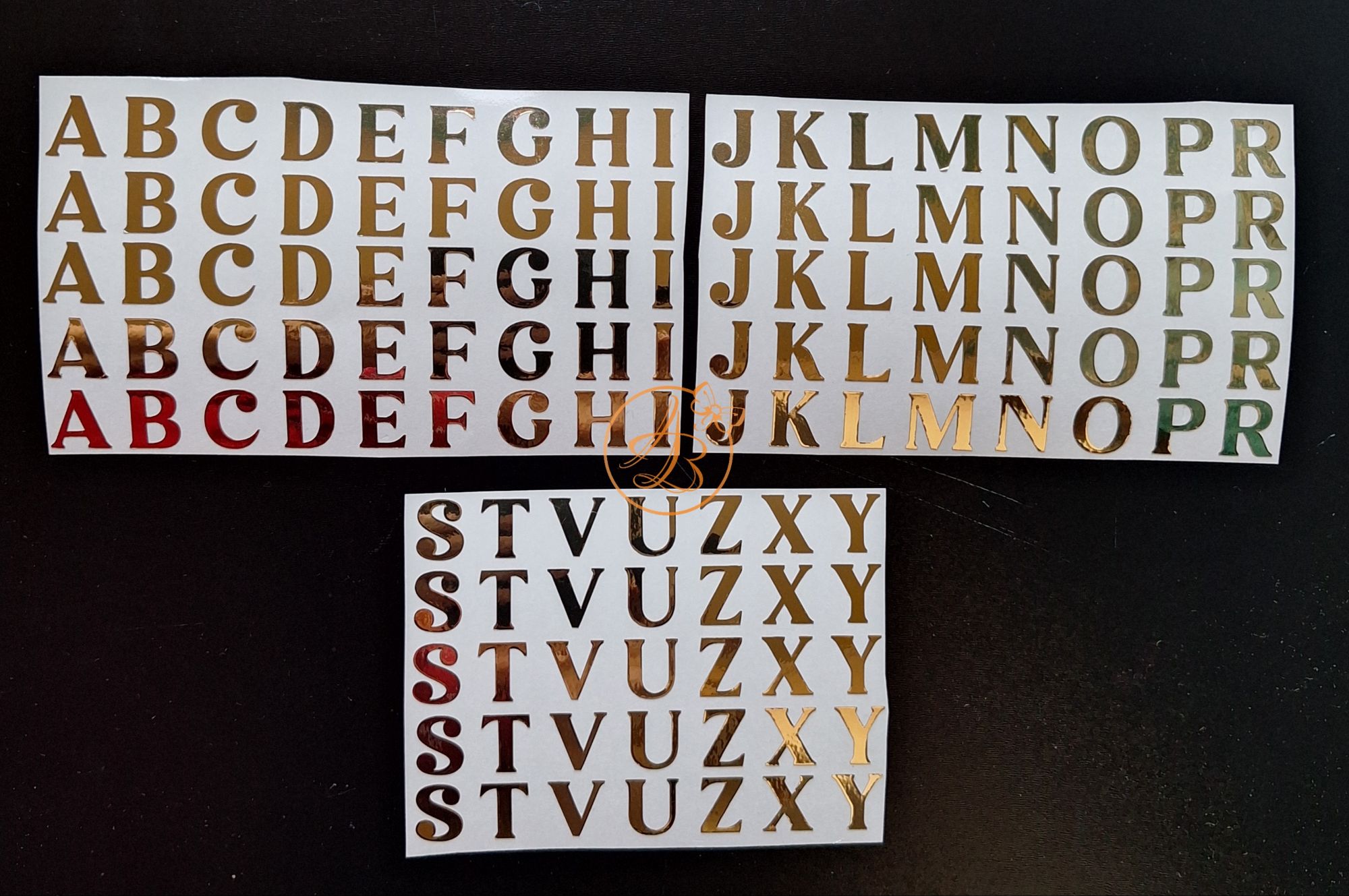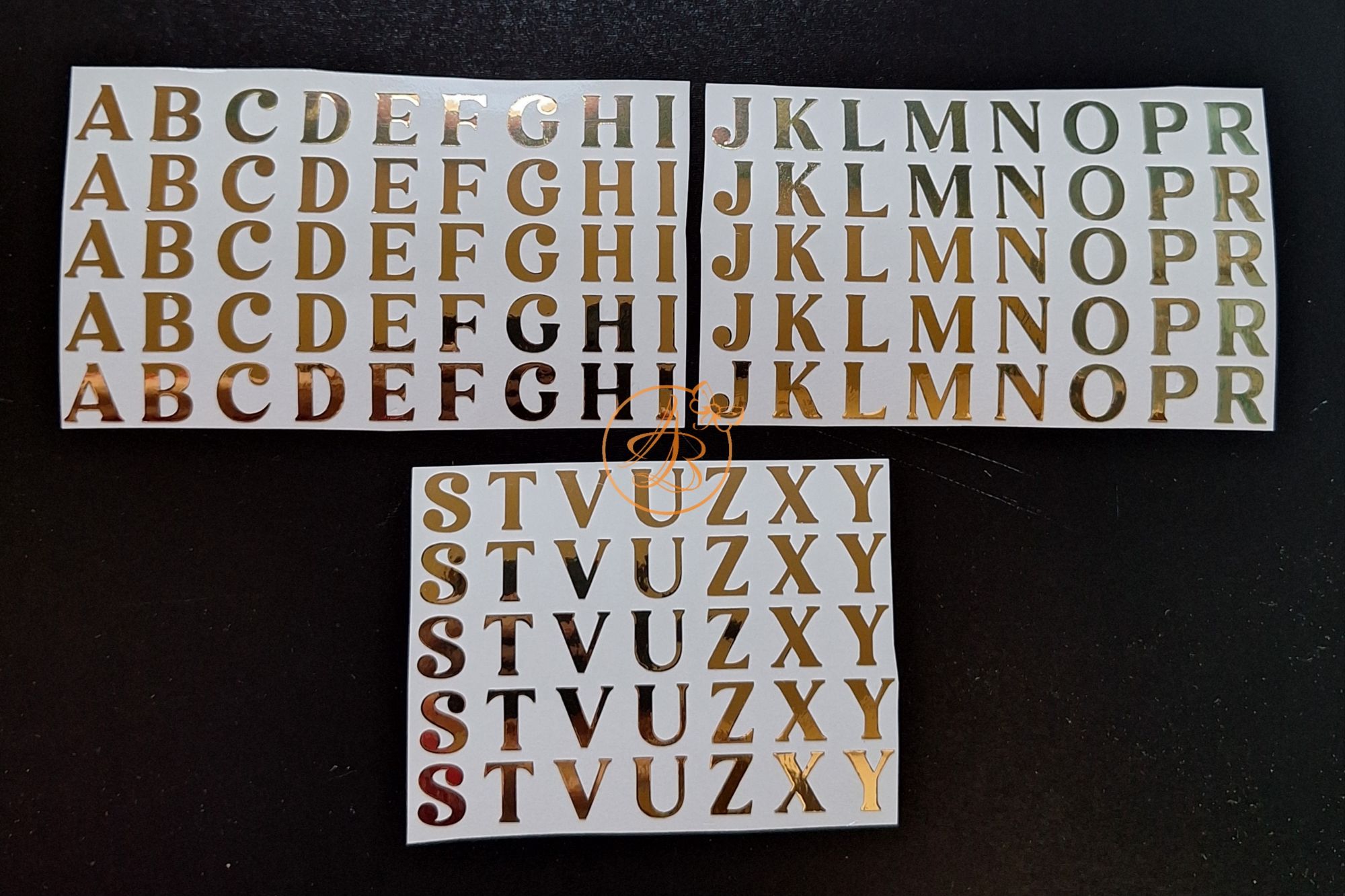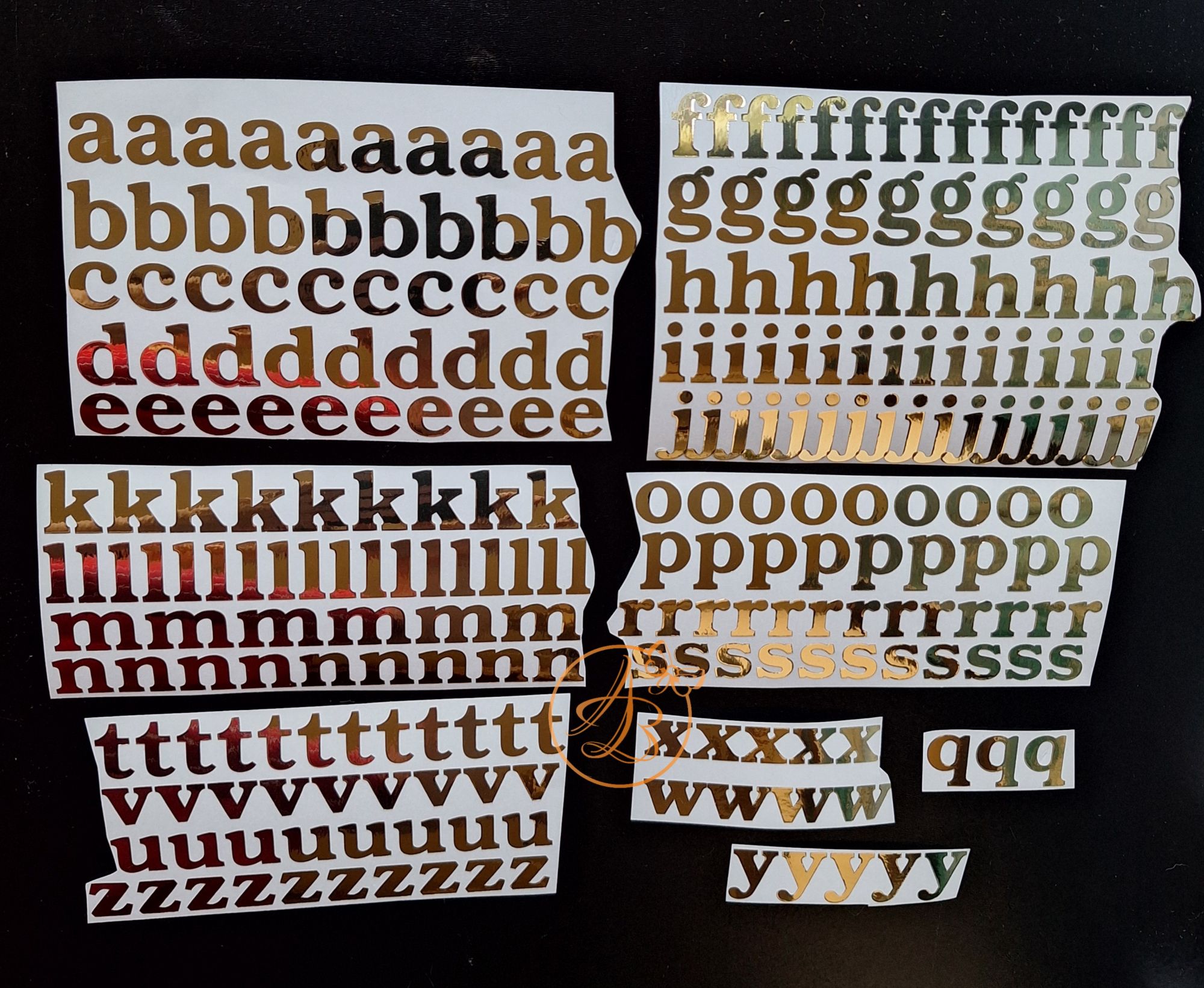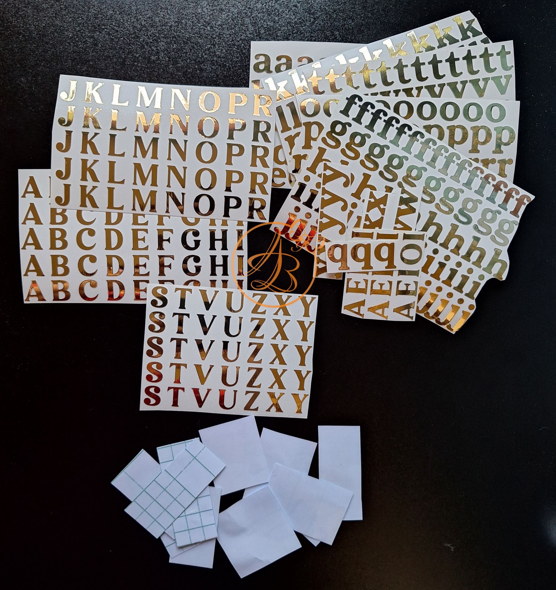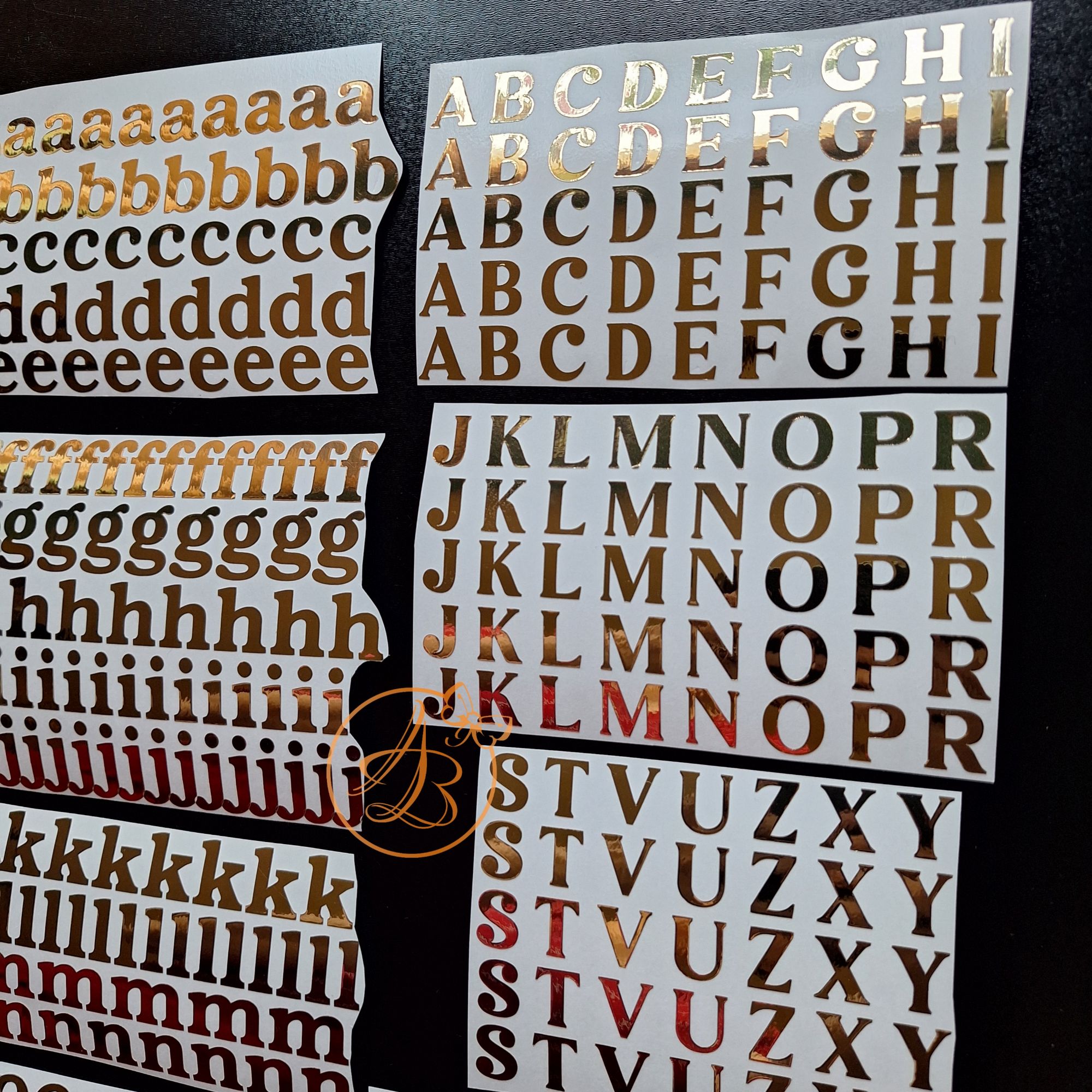 Sticker auriu tip oglinda, cu litere dec tipar mari si mici.