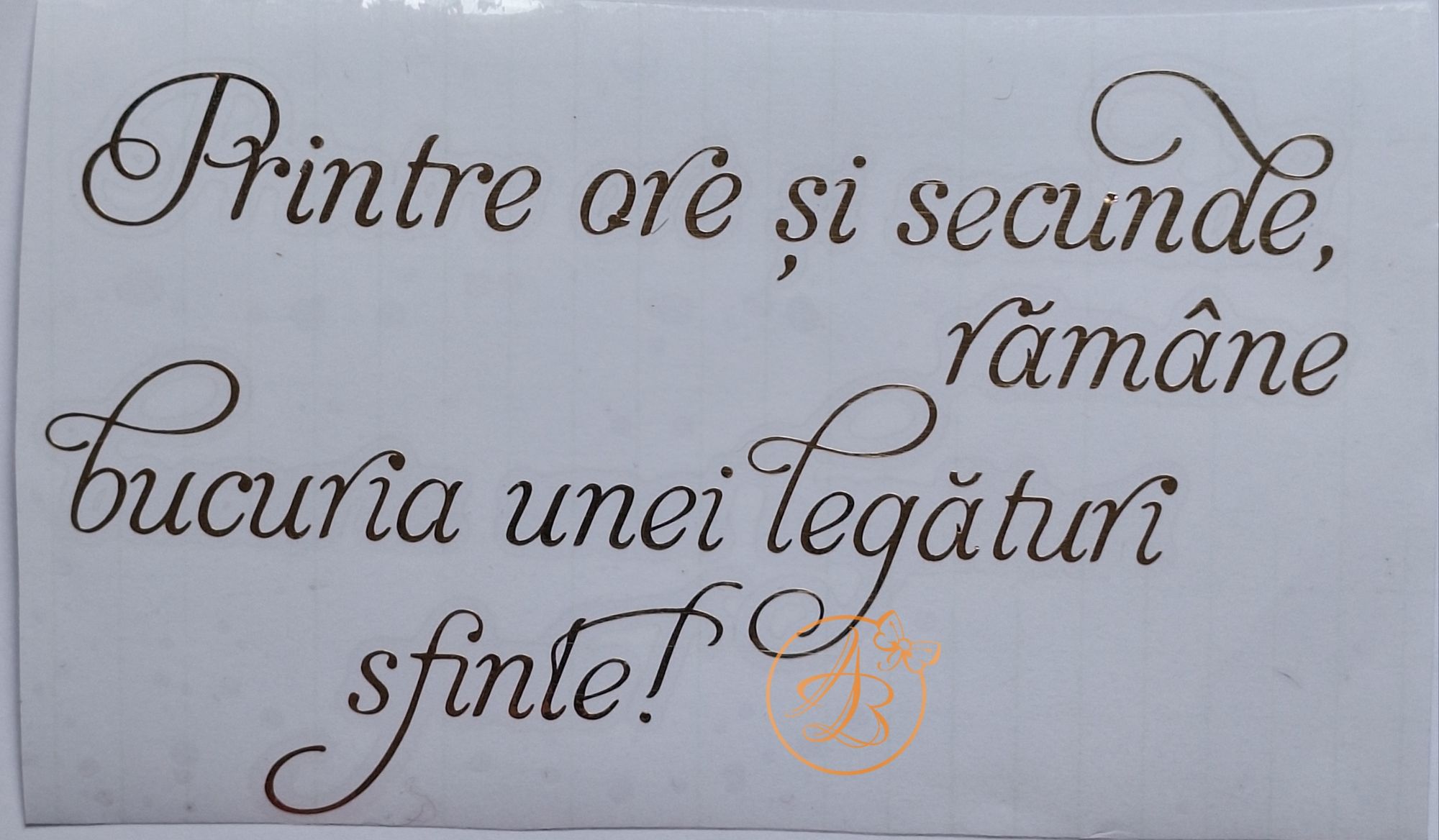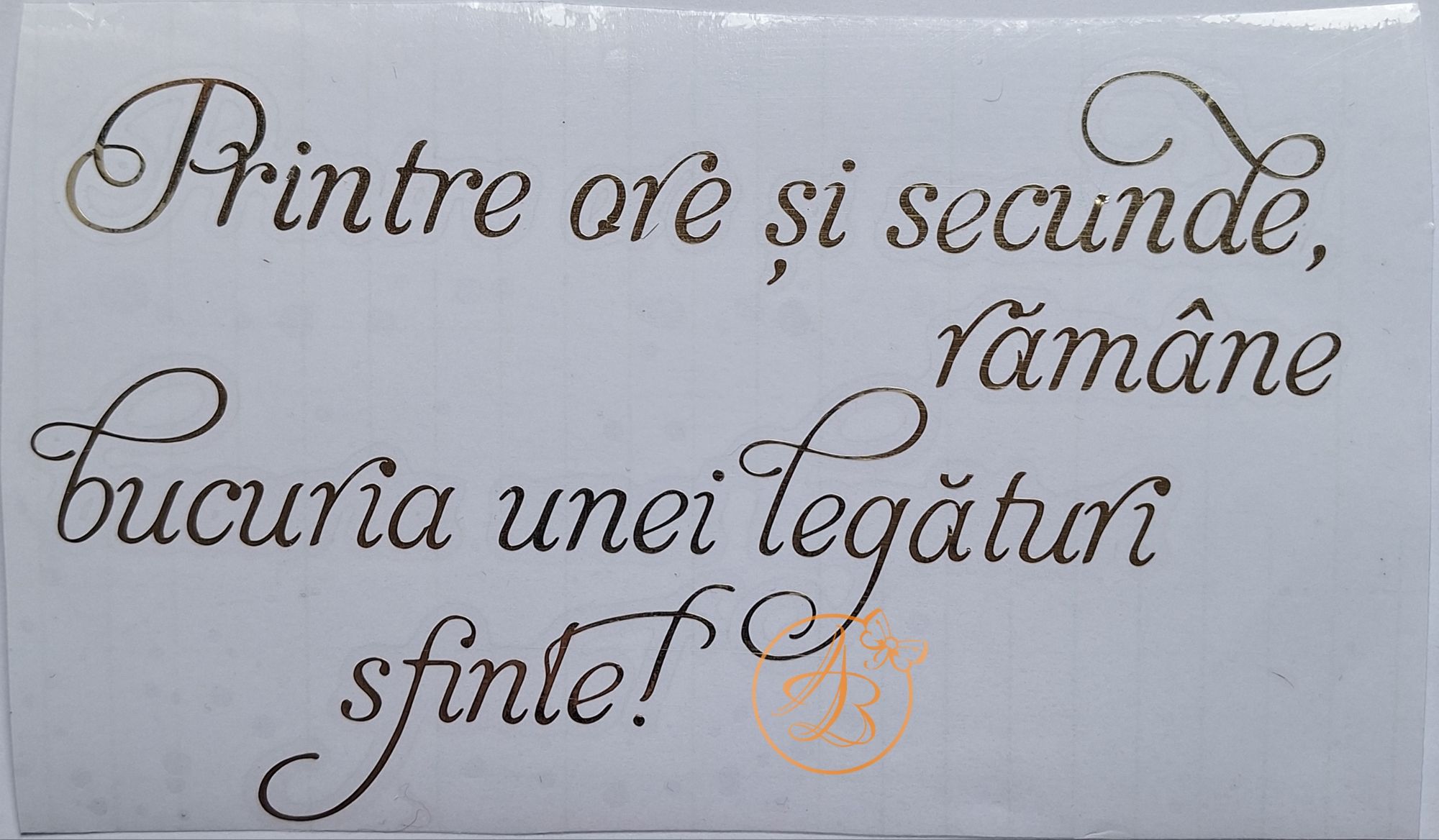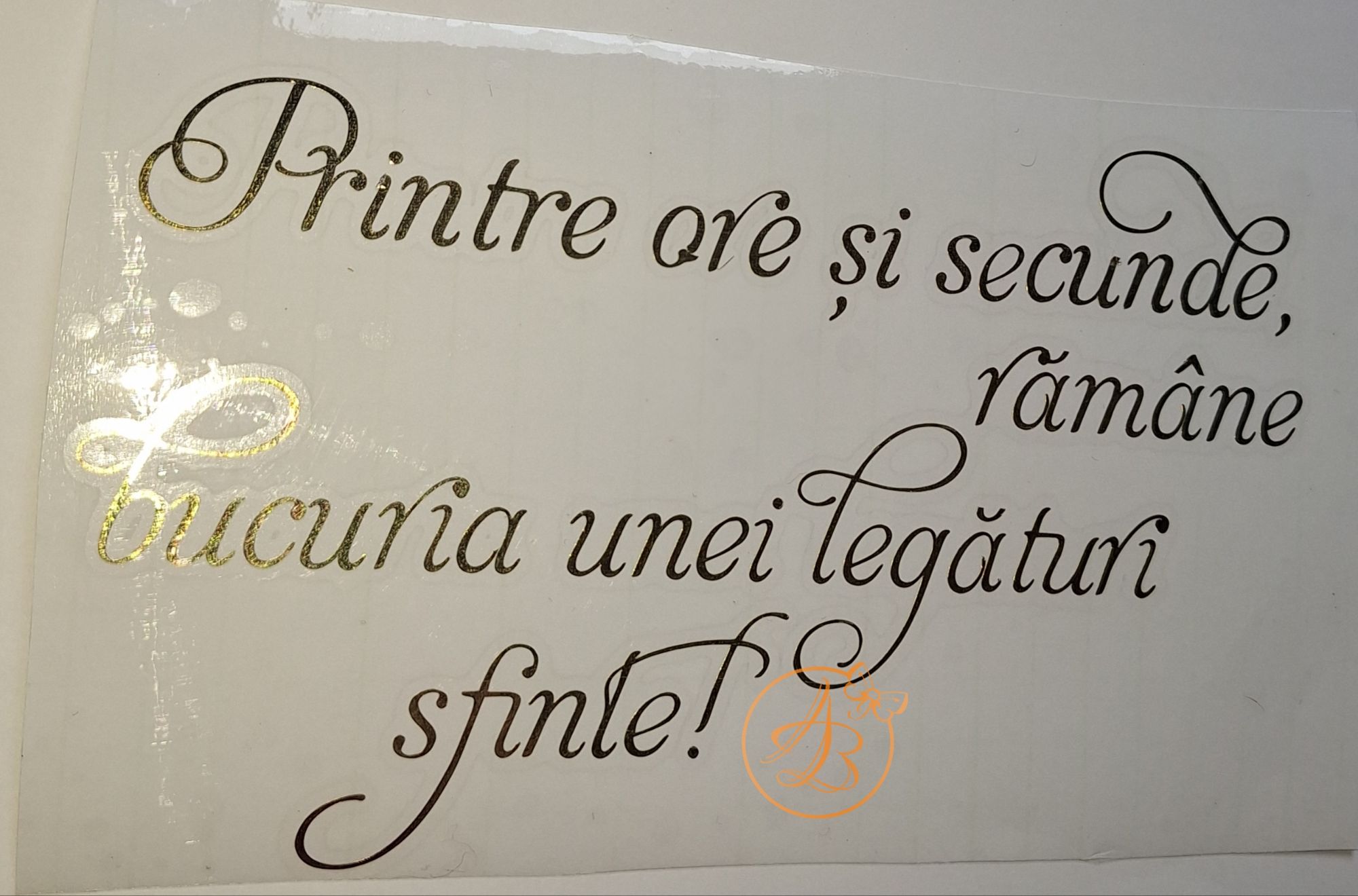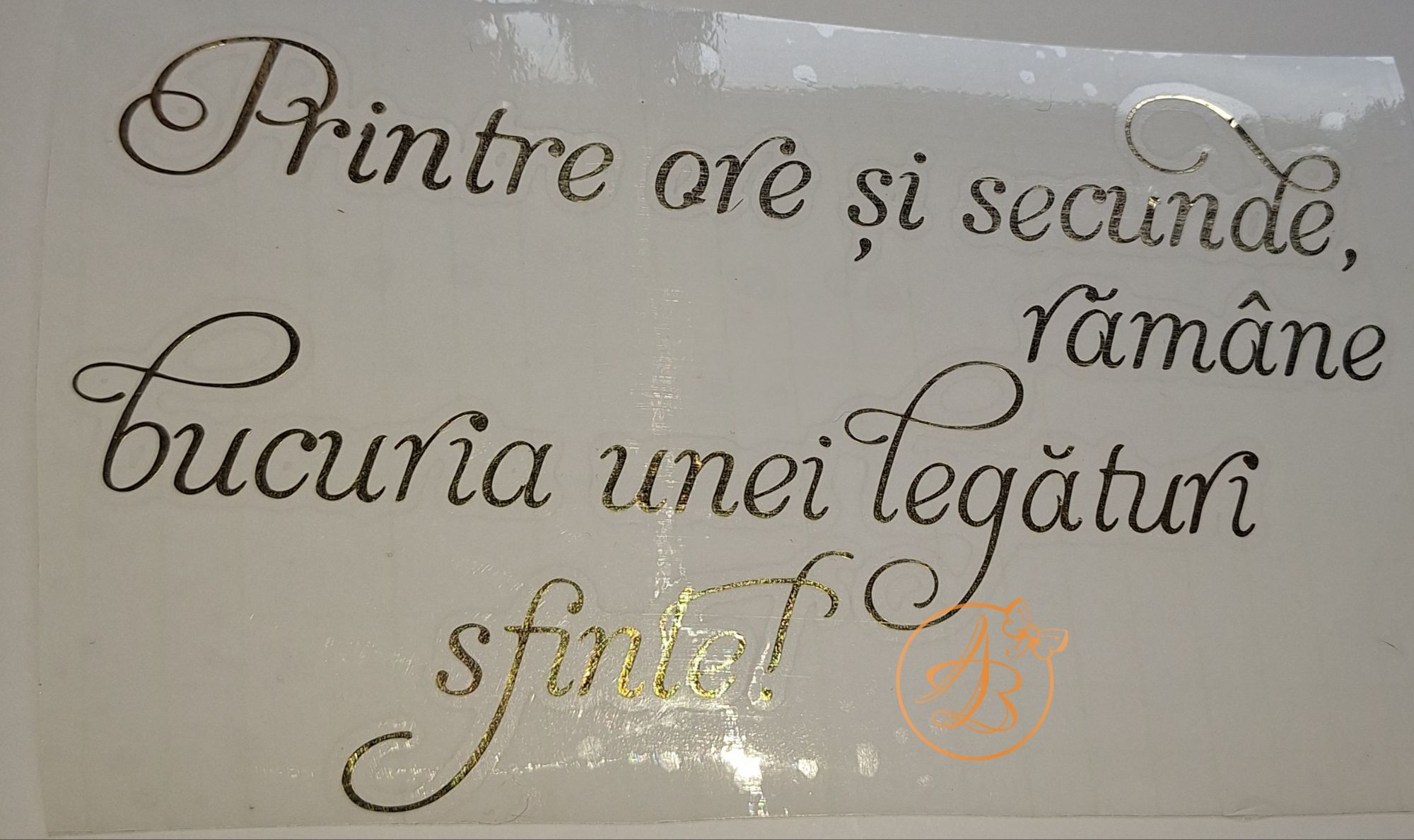 Inainte de aplicarea stickerului (pe pahar, sticla, plexiglass, lemn, balon, etc) suprafata trebuie foarte bine degresata, curatata de praf! (Va recomandam curatare cu spirt sanitar )