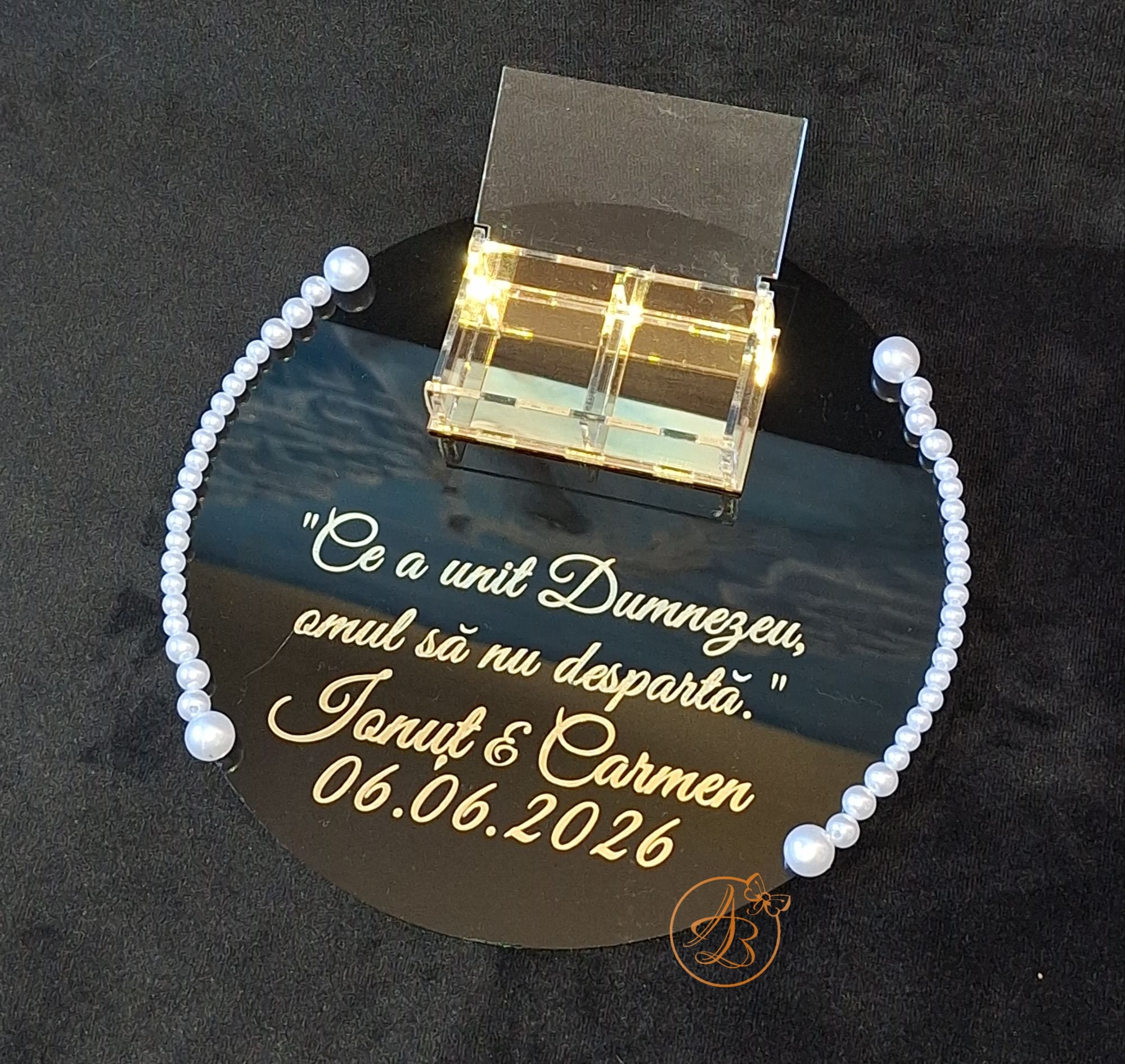 Suport pentru verighete, deosebit de elegant, din oglinda acrilica neagra, decorat cu margele albe.