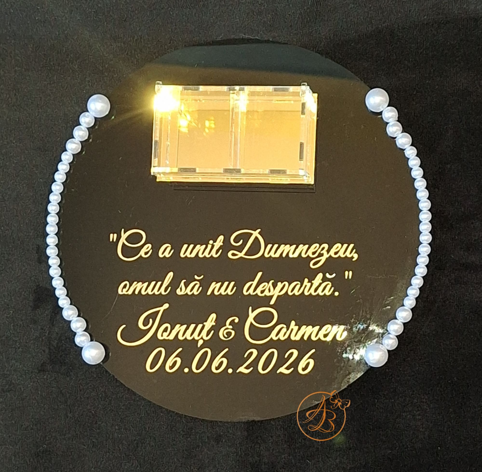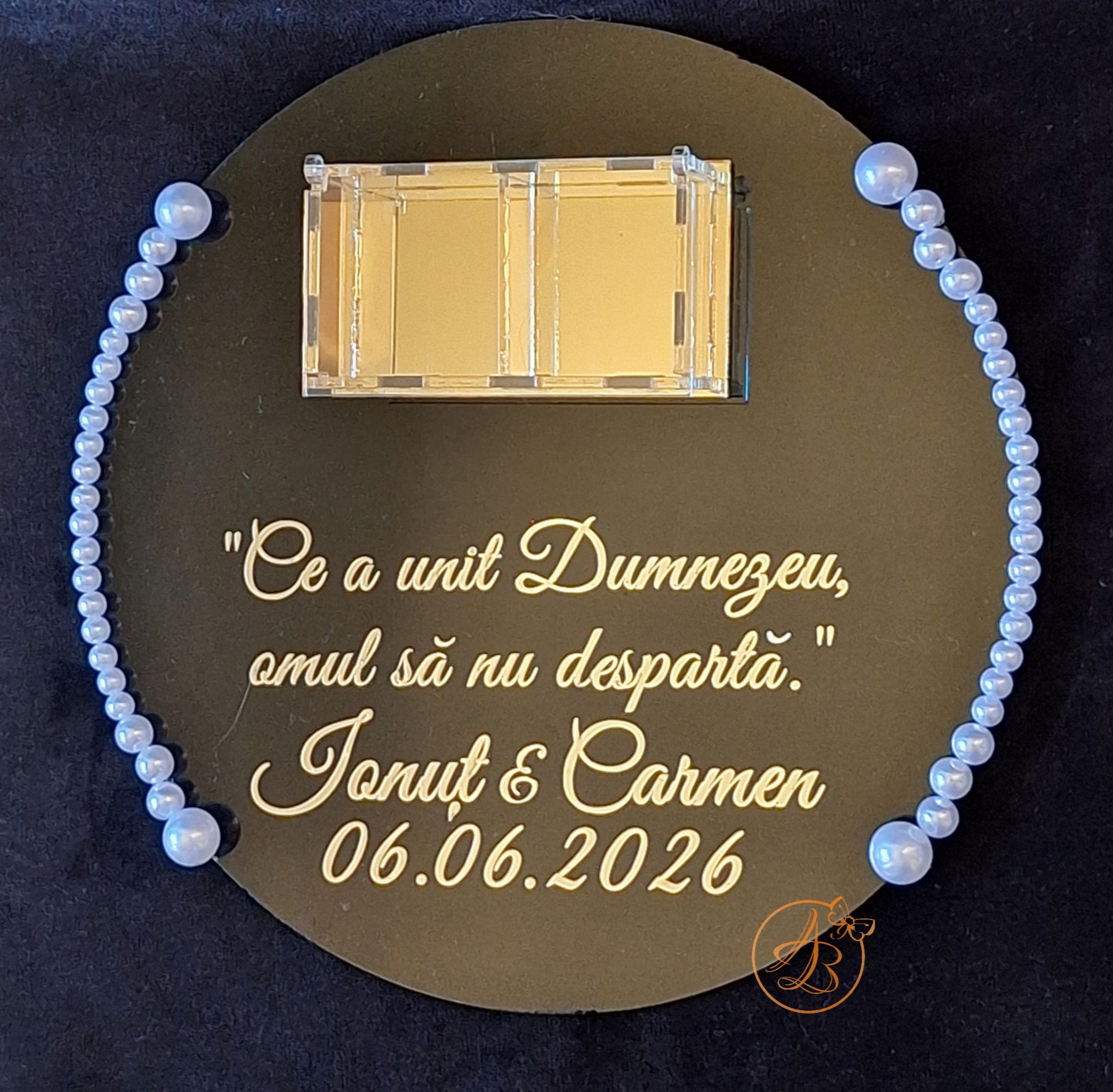 Este decorat cu textul din imagine, numele mirilor si data nuntii, din sticker auriu.