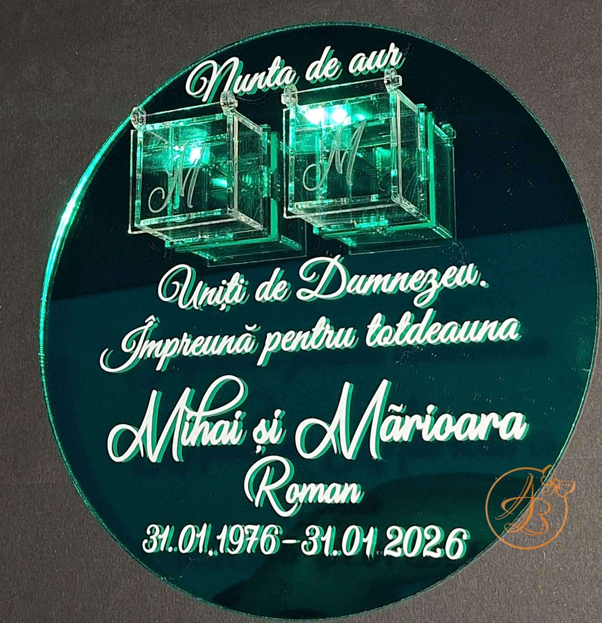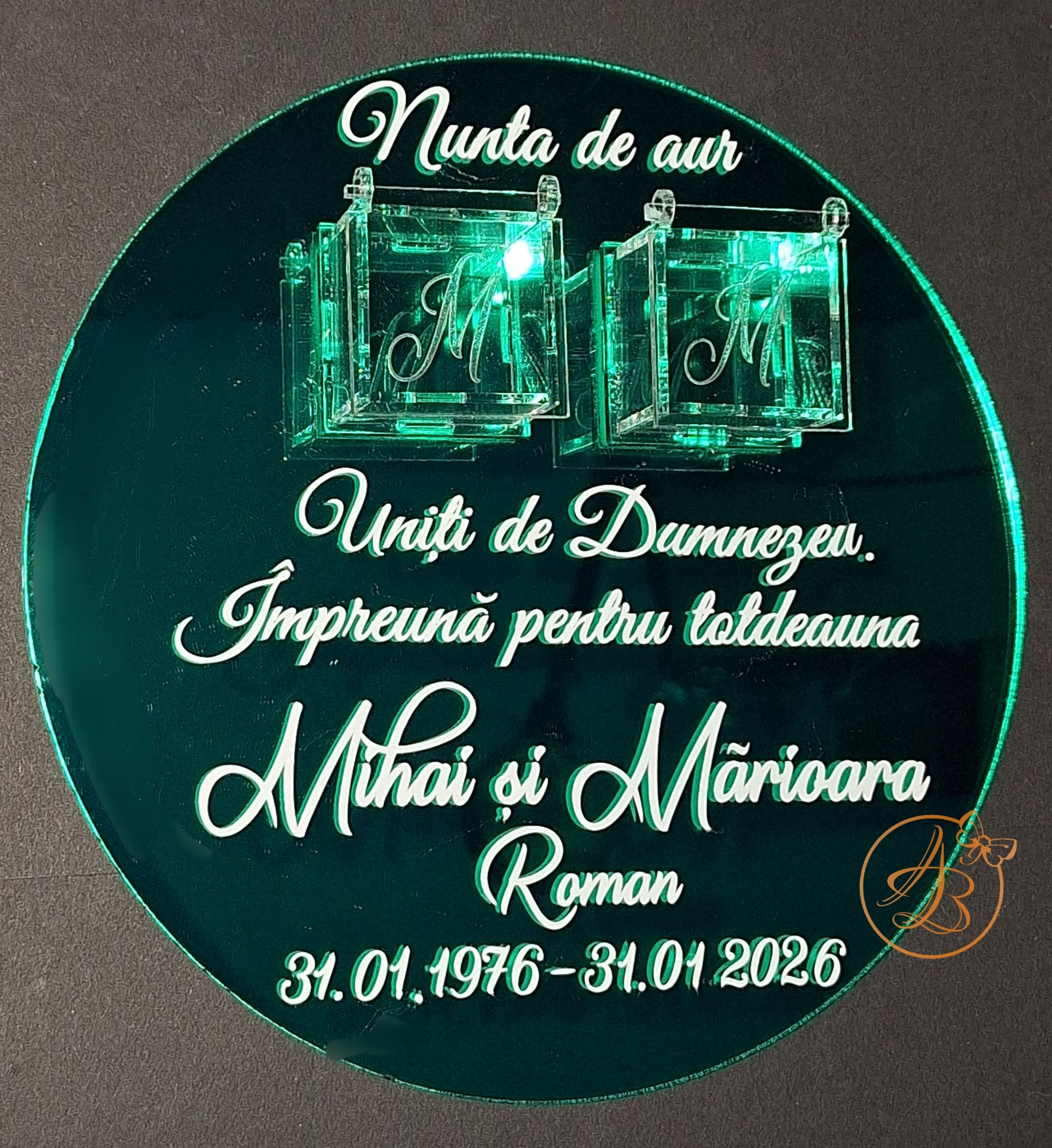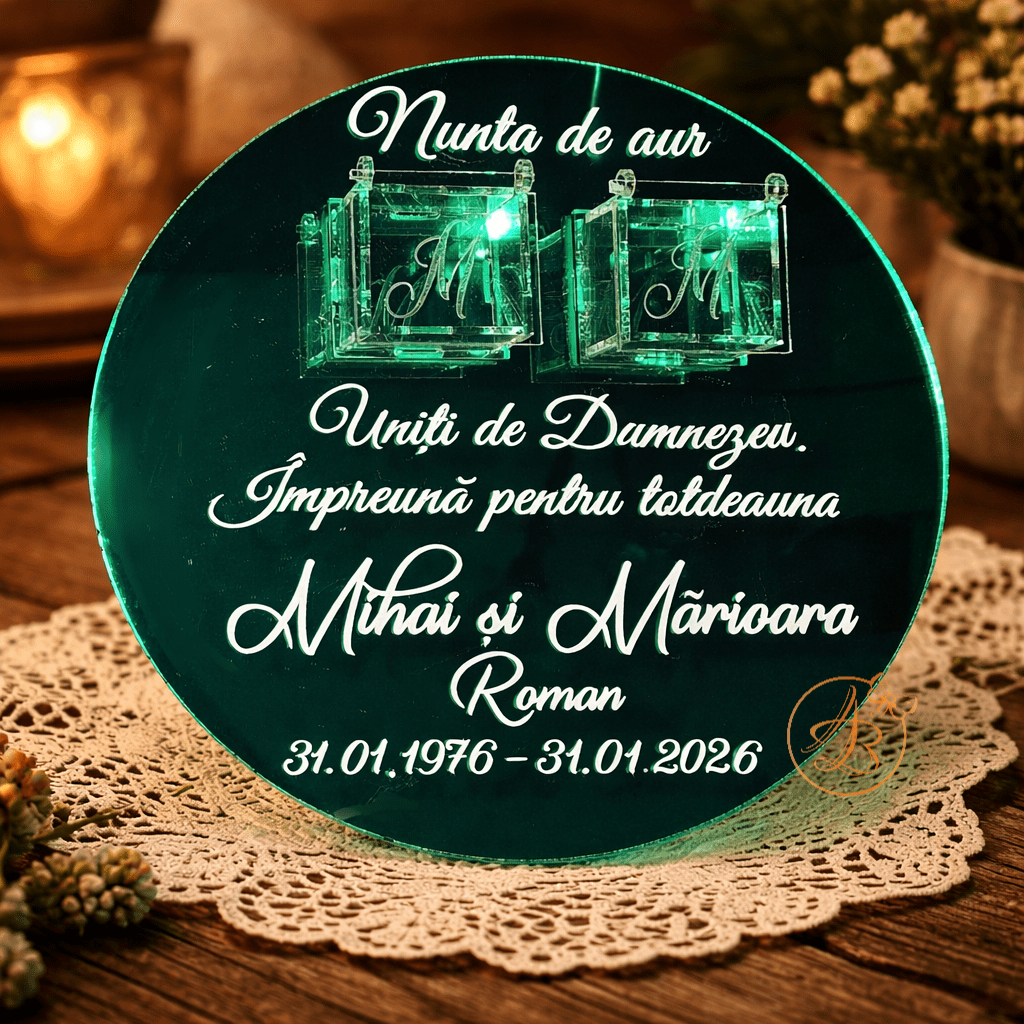 Este decorat cu textul din imagine, numele mirilor si data nuntii, din sticker alb.