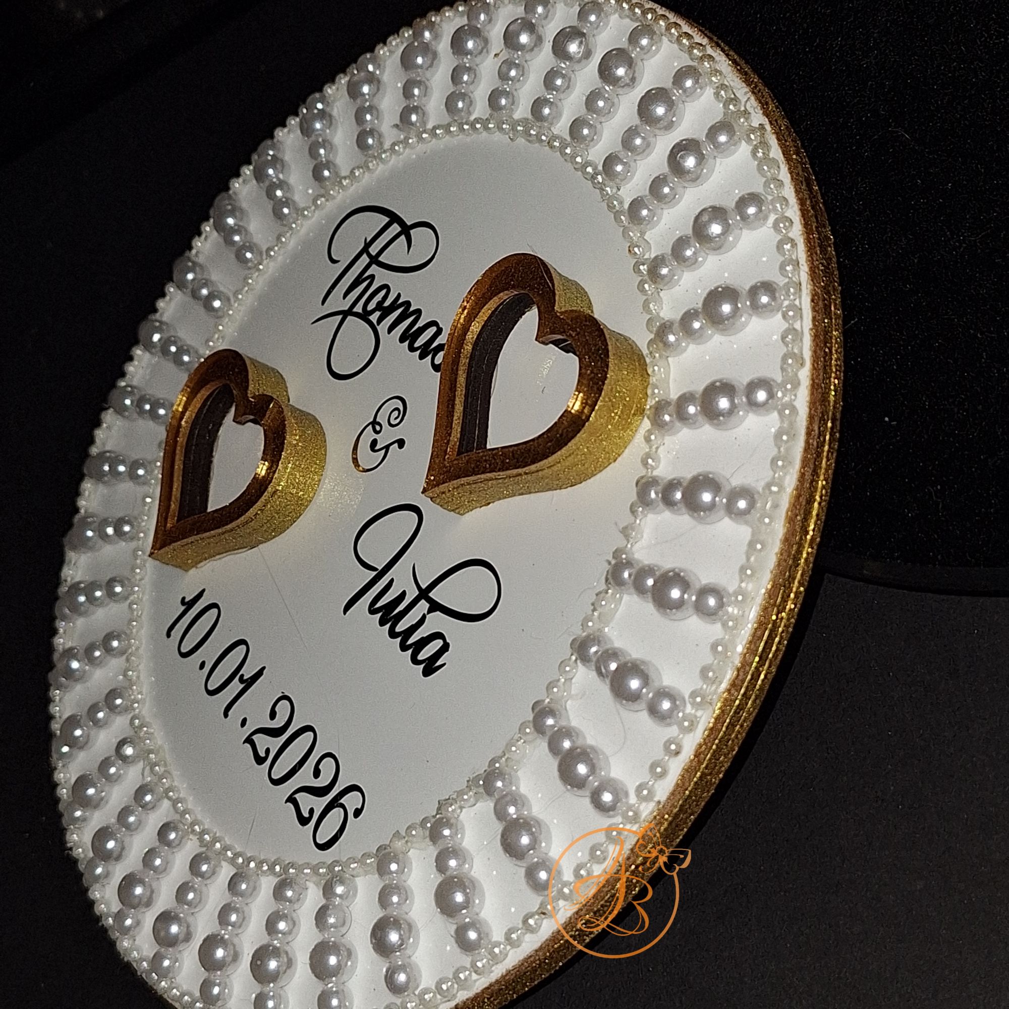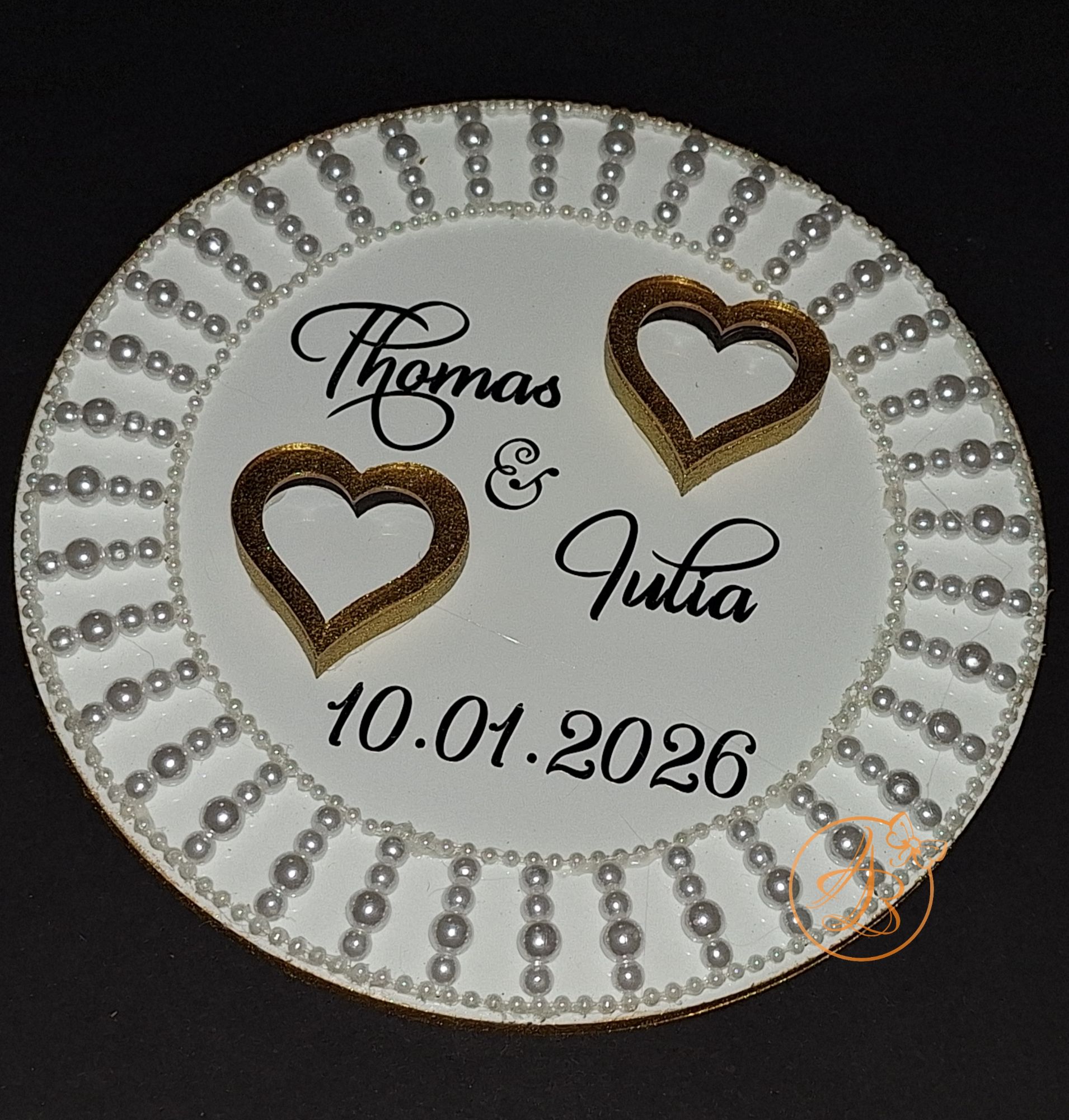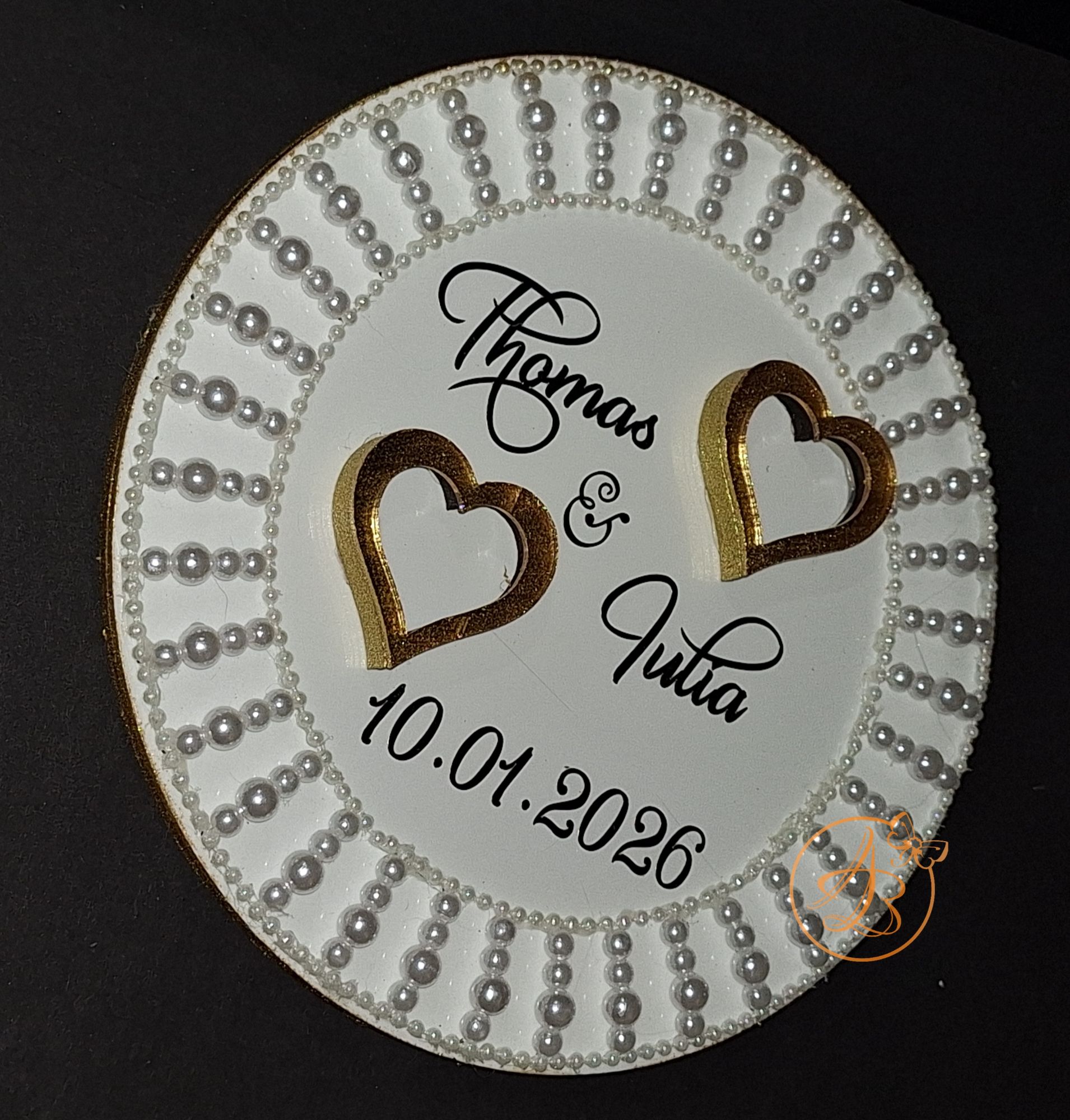 Suportul este decorat cu inimioare, si margele atasate bucata cu bucata, si desigur numele mirilor, data nuntii realizate cu sticker autocolant auriu.