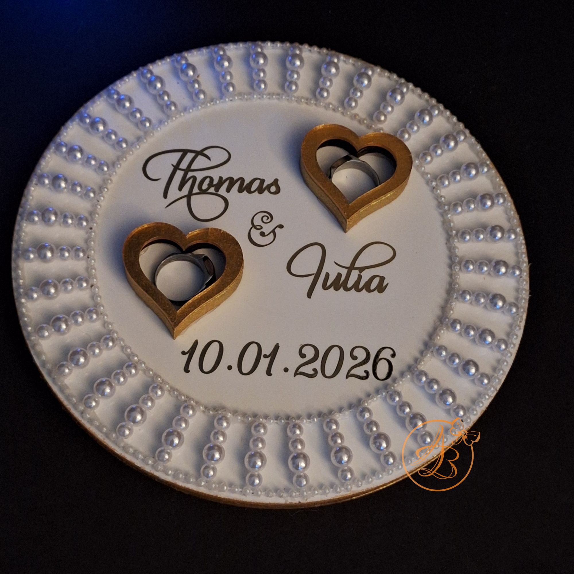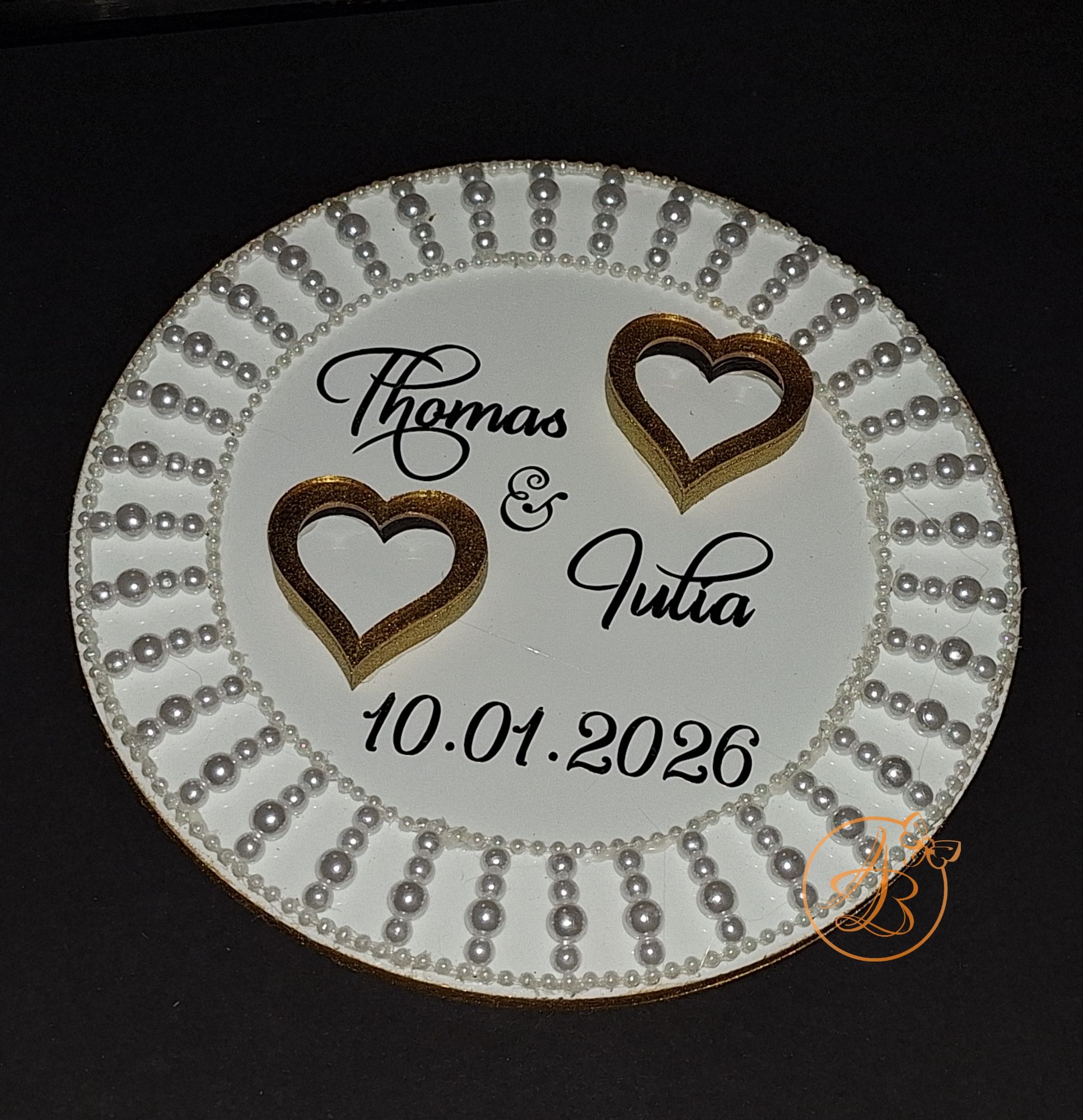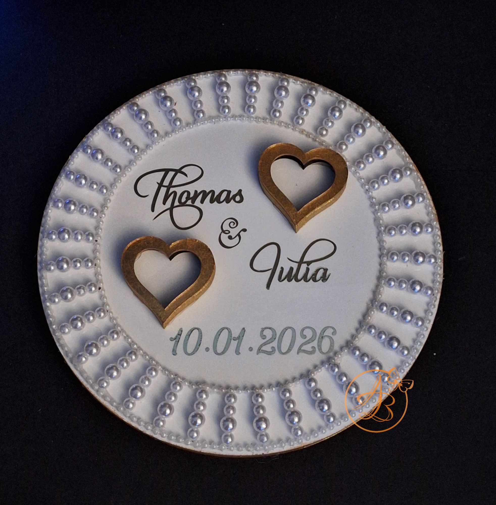 Suportul este decorat cu inimioare, si margele atasate bucata cu bucata, si desigur numele mirilor, data nuntii realizate cu sticker autocolant auriu.