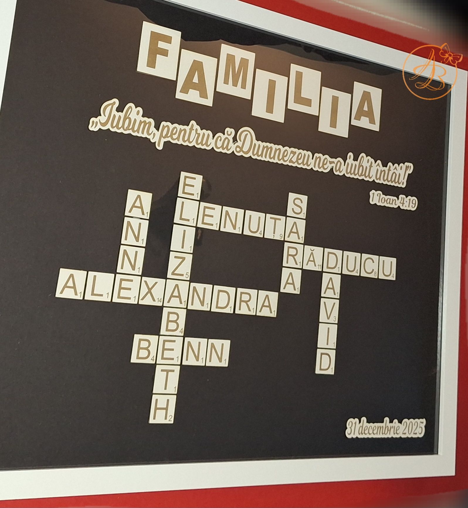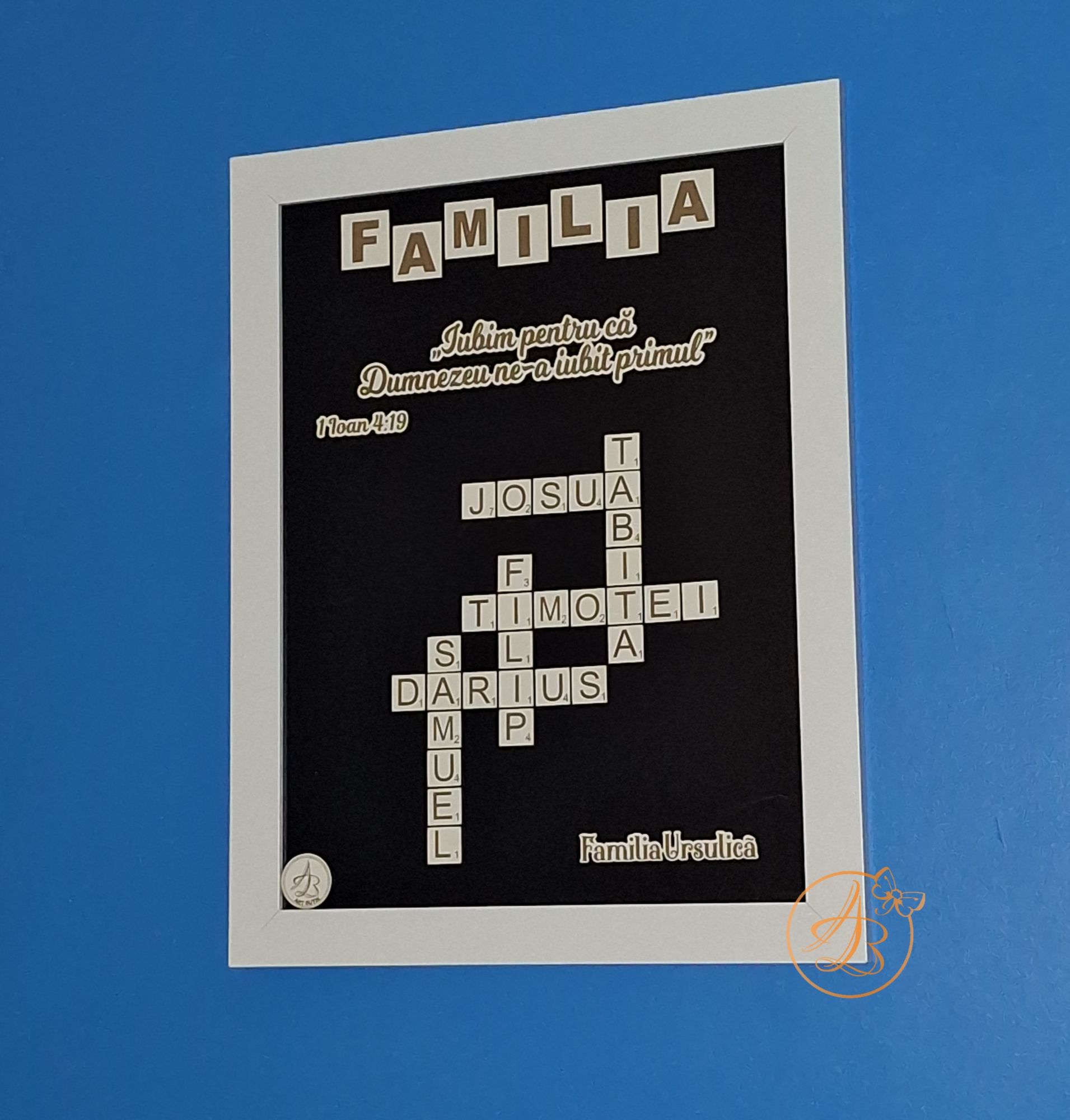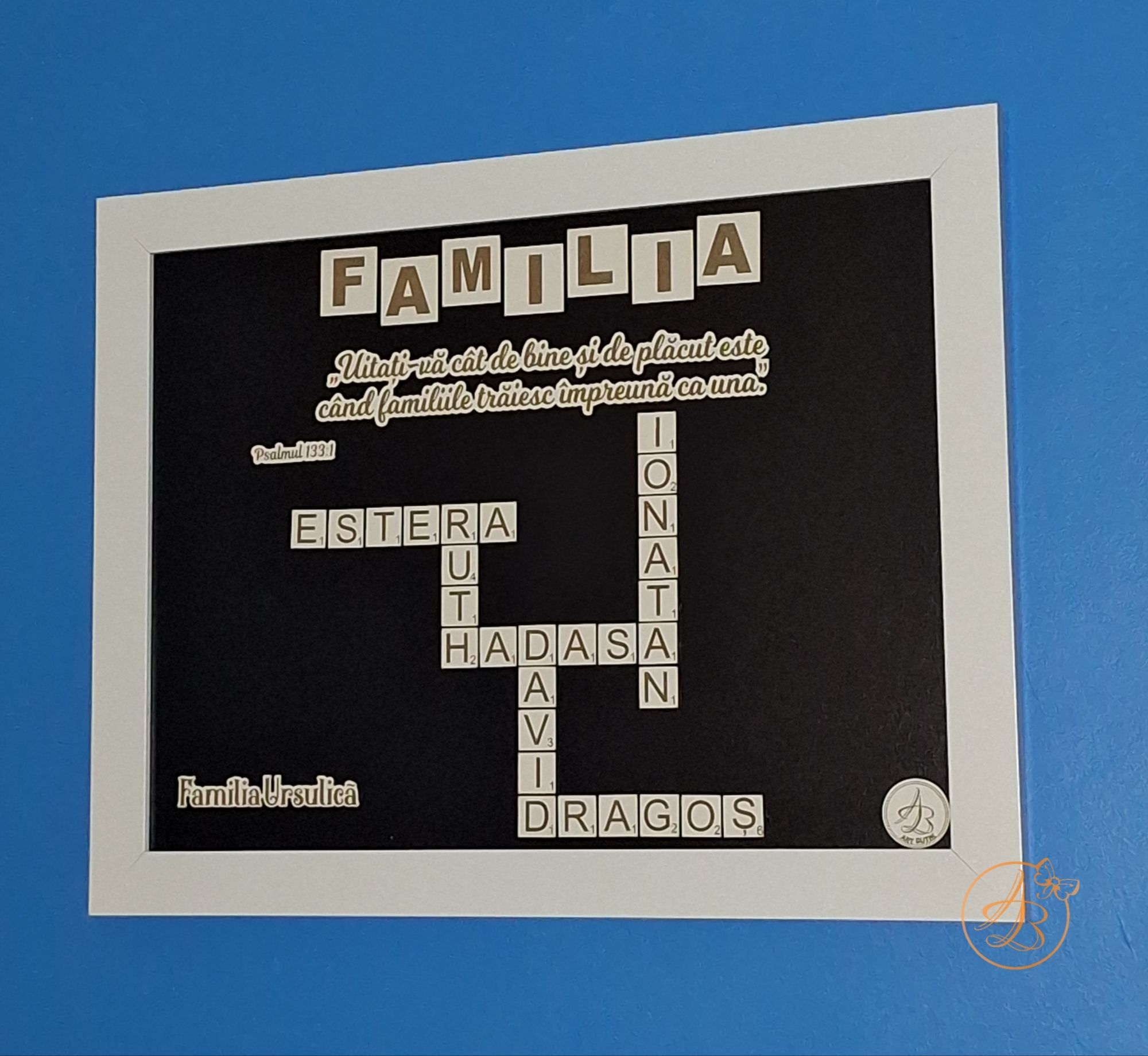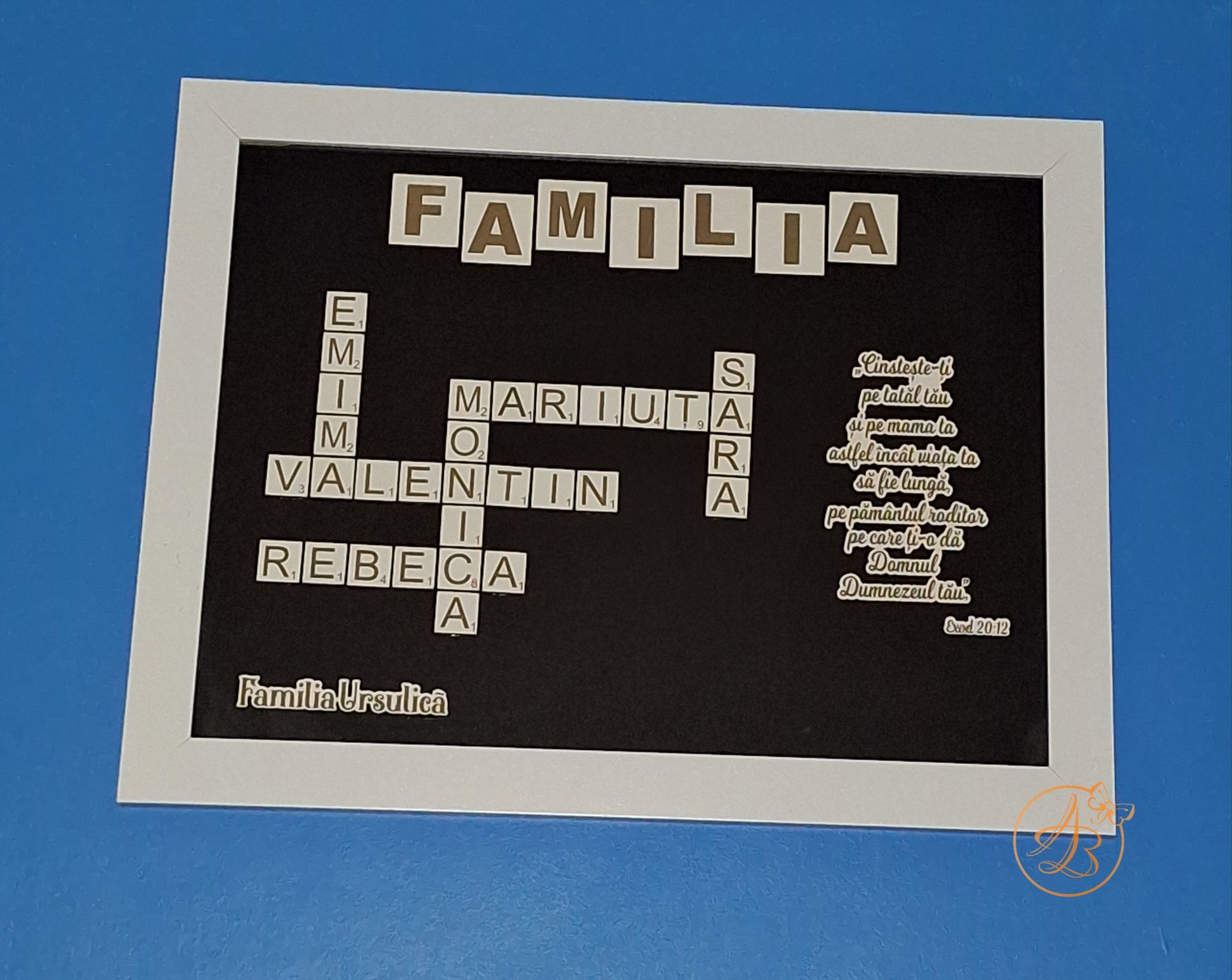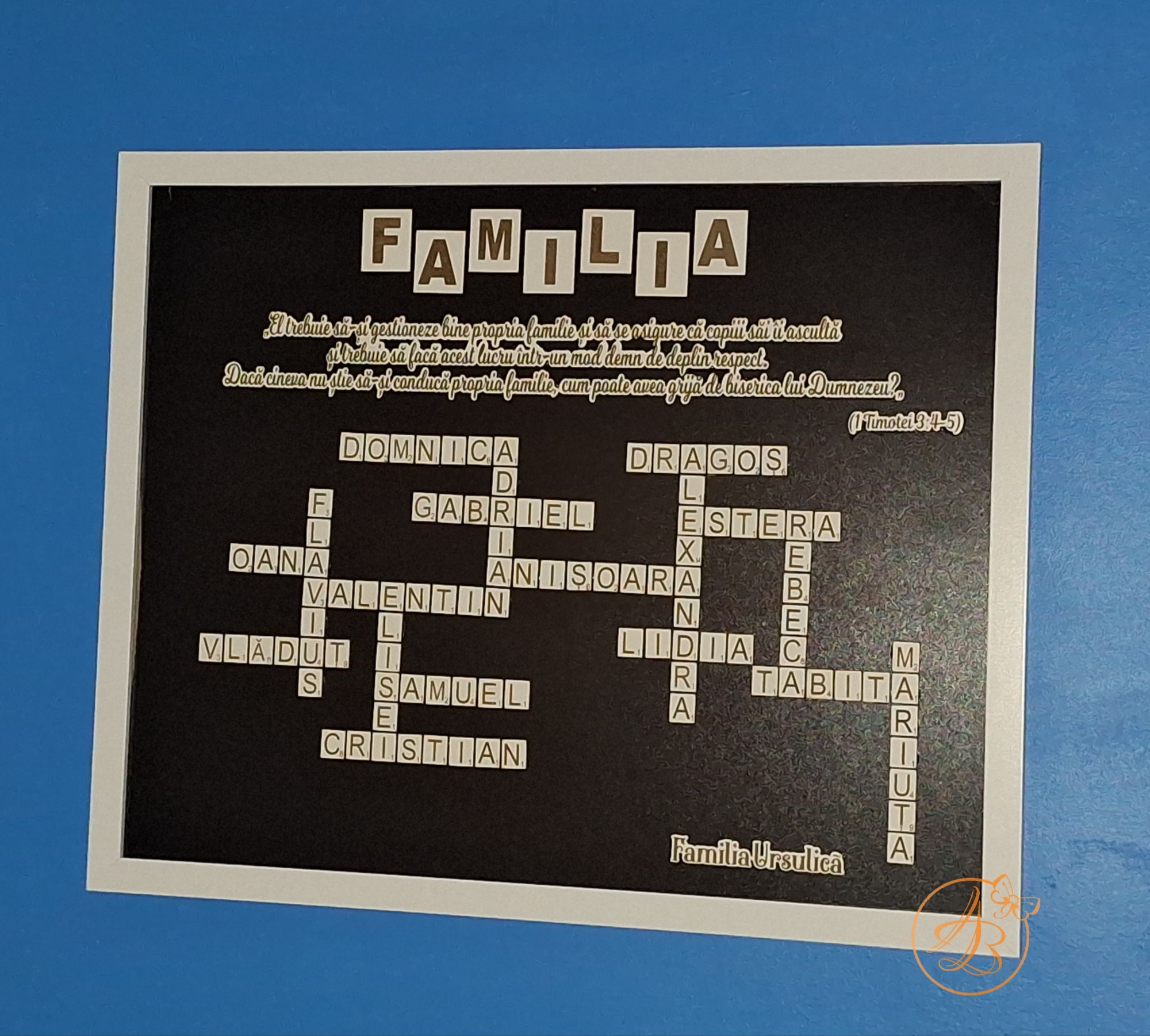 Rama are dimensiune A3 (40x30cm), fundalul este negru, peste care se lipesc numele dorite, in forma de rebus, bucata cu bucata. Se poate adauga text, citat, data, dupe preferinte.