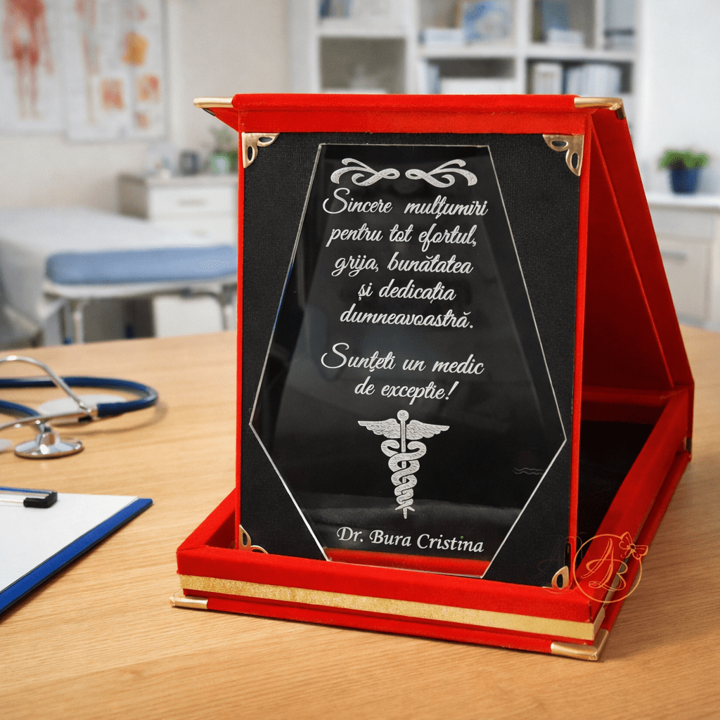 Cutia este imbracata in catifea, in interior asezam o placheta din oglinda aurie sau argintie, personalizata prin gravura, cu textul dorit.