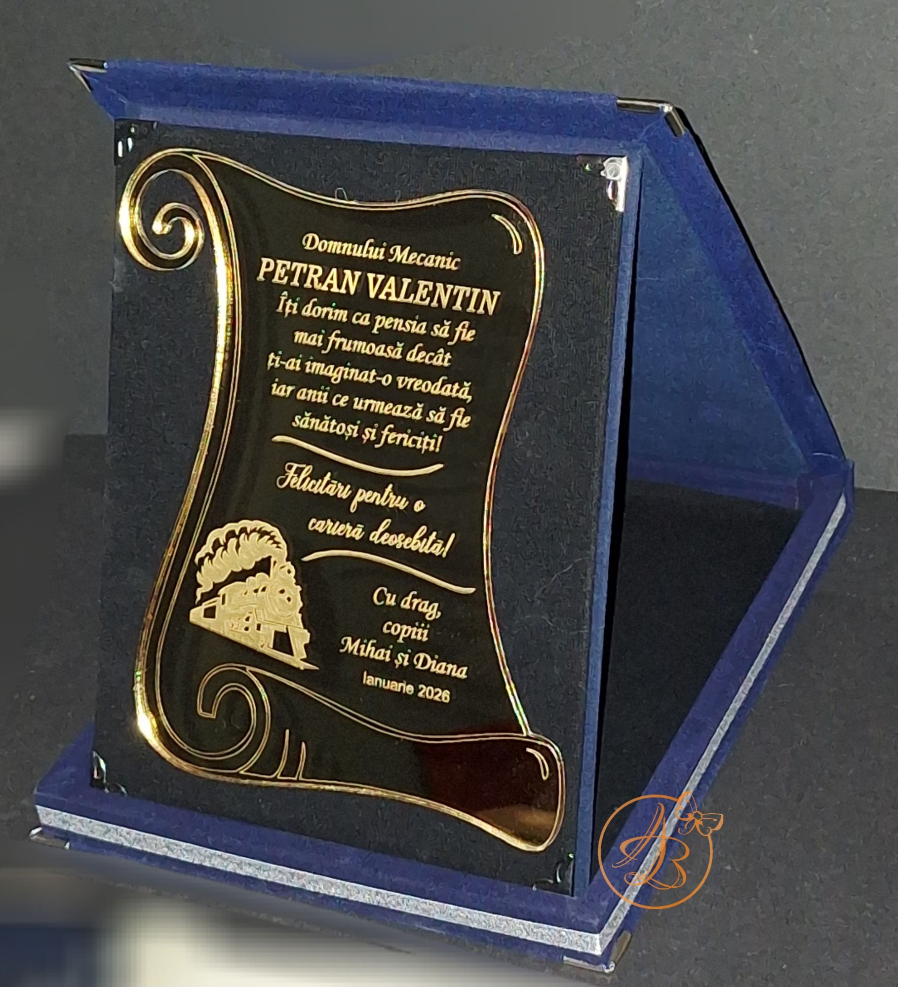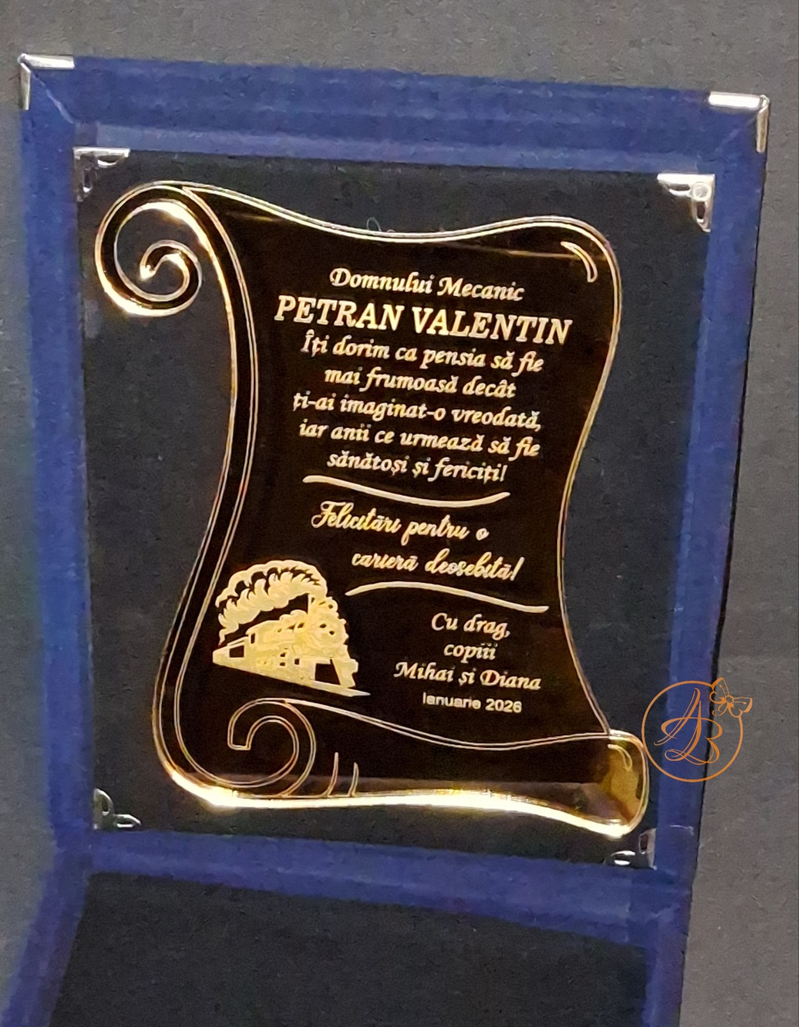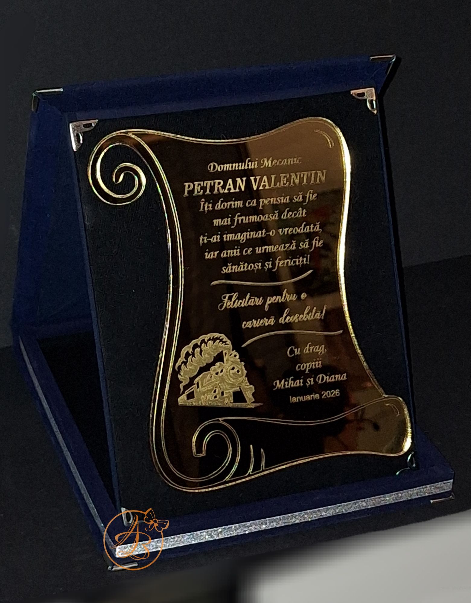 Cutia este imbracata in catifea, in interior asezam o placheta din oglinda aurie sau argintie, personalizata prin gravura, cu textul dorit.