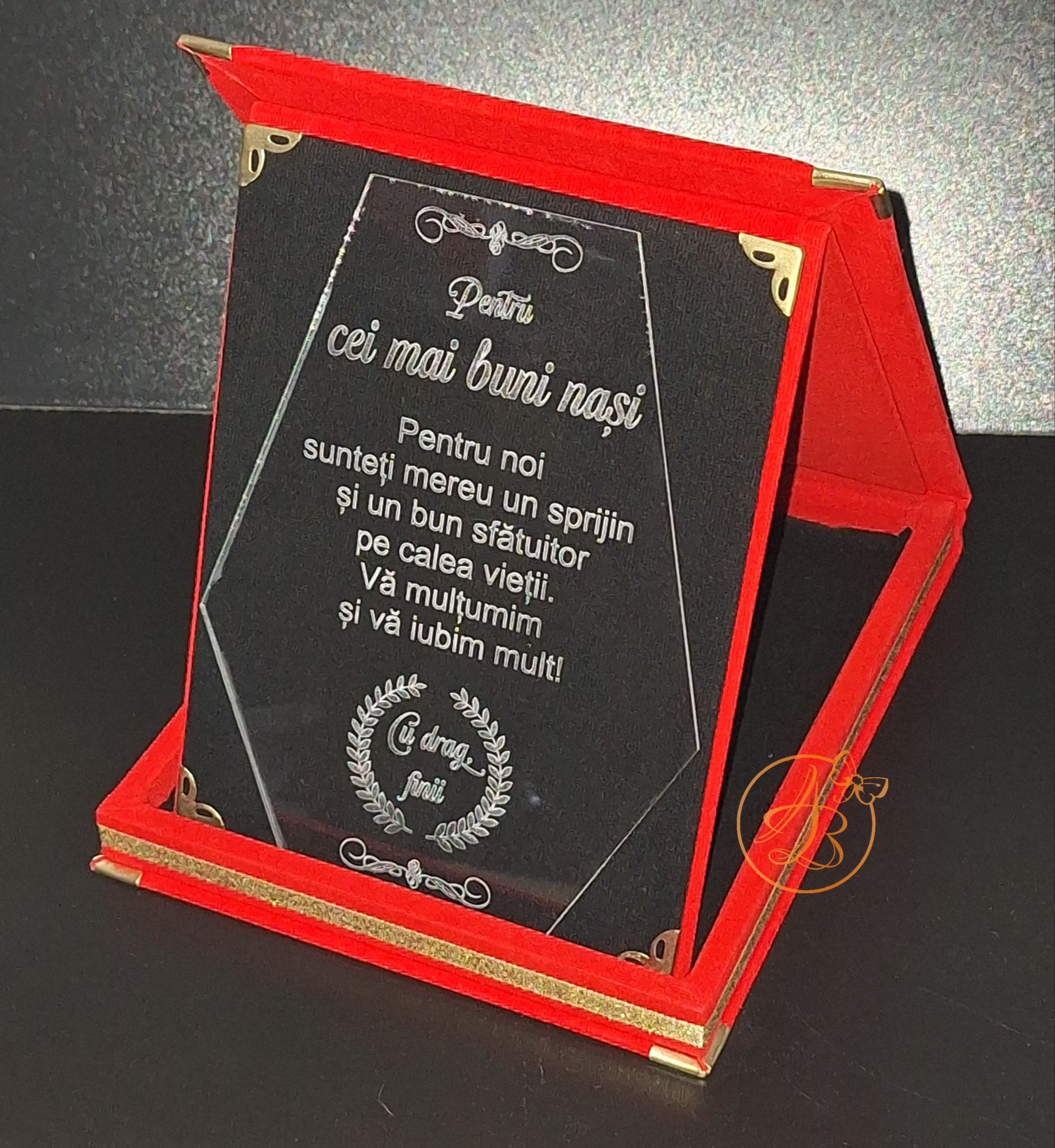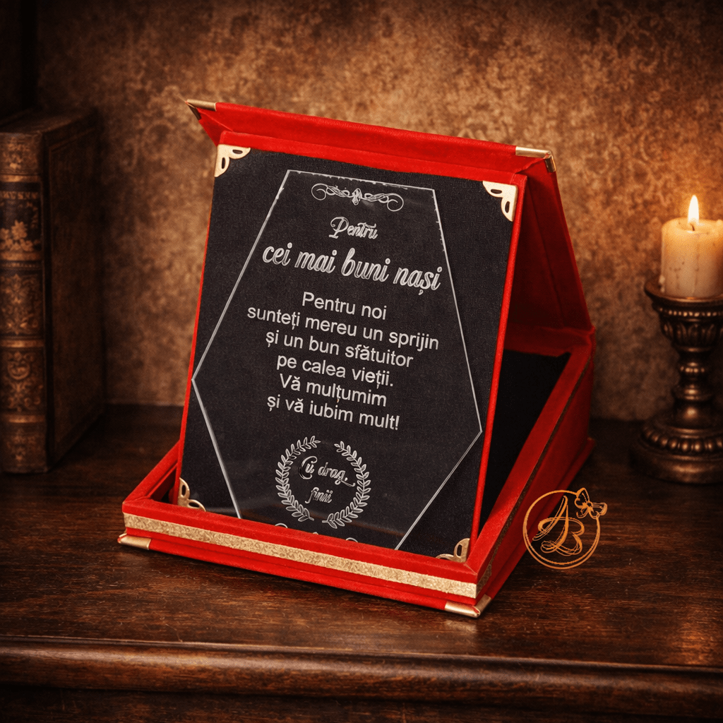 Trofeu elegant plexiglass in cutie imbracata in catifea rosie